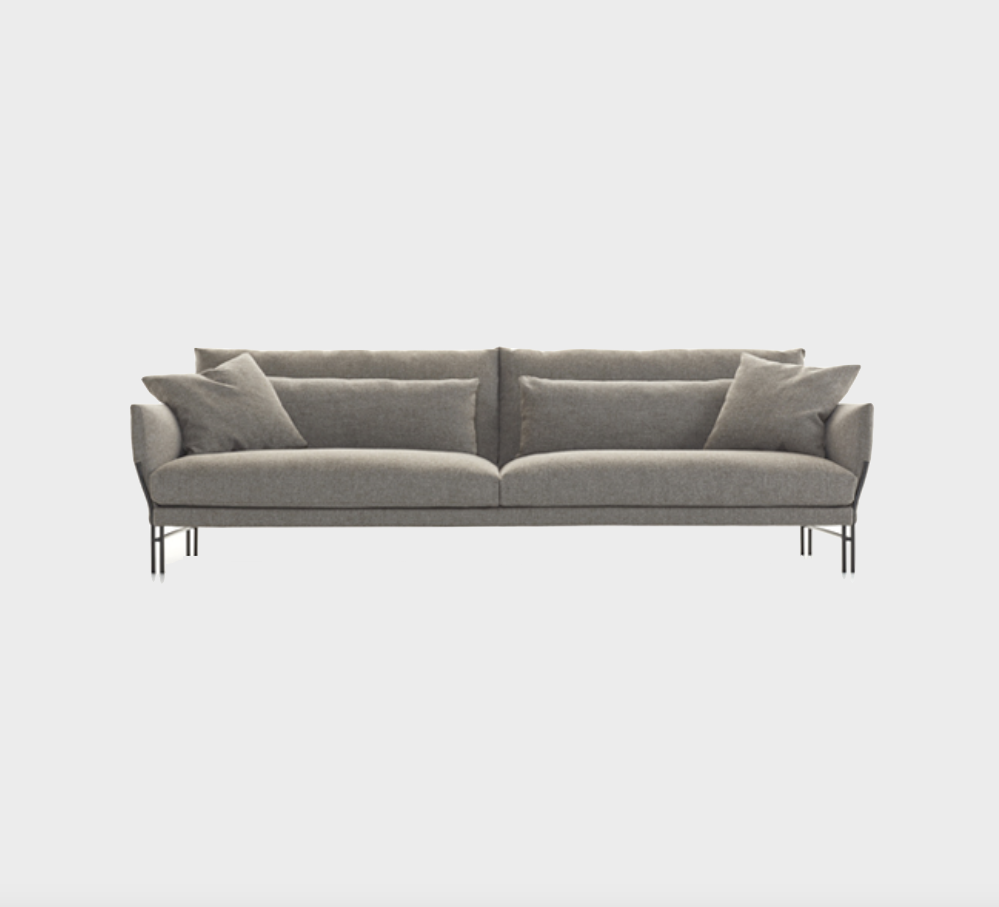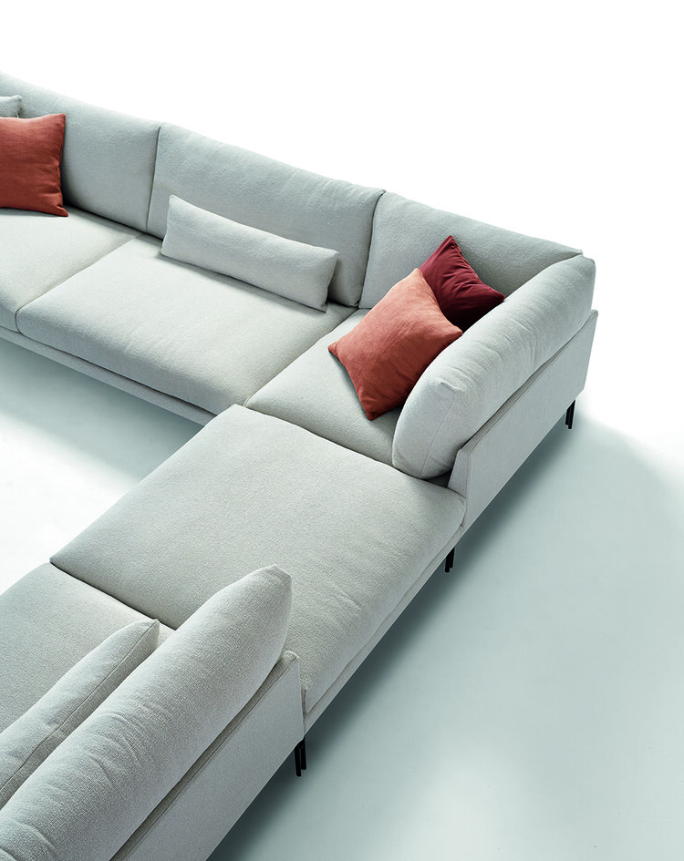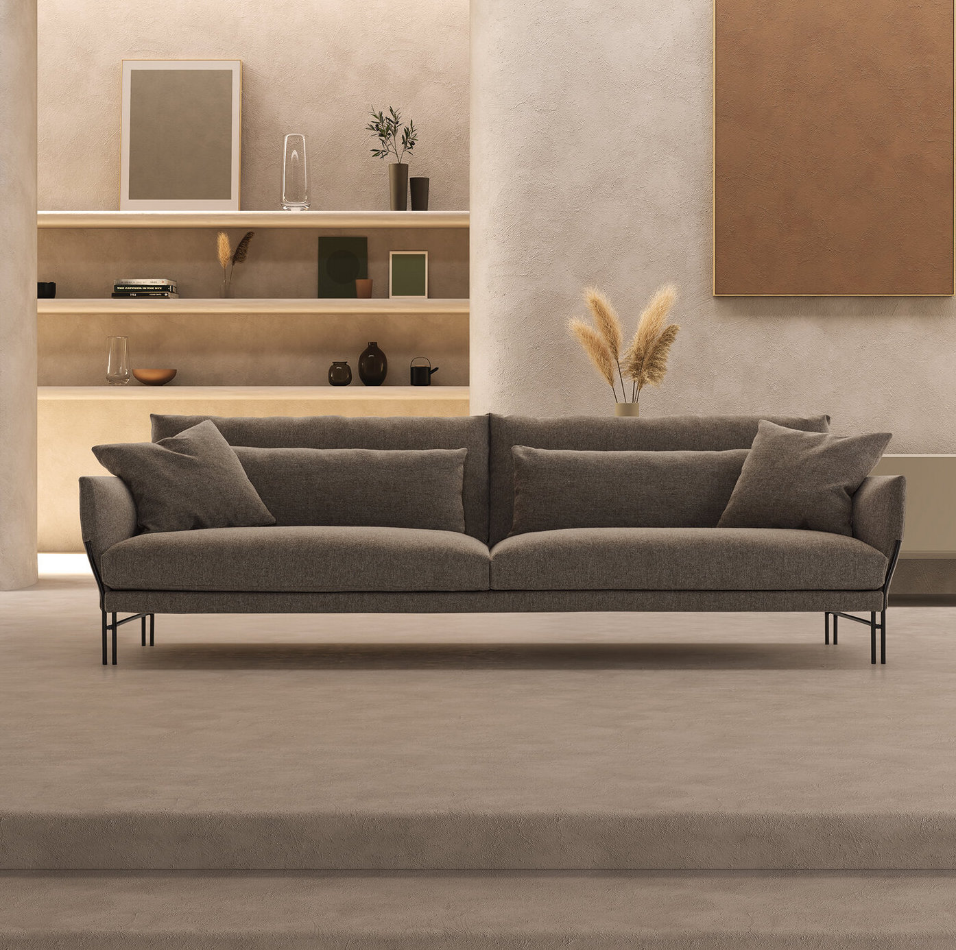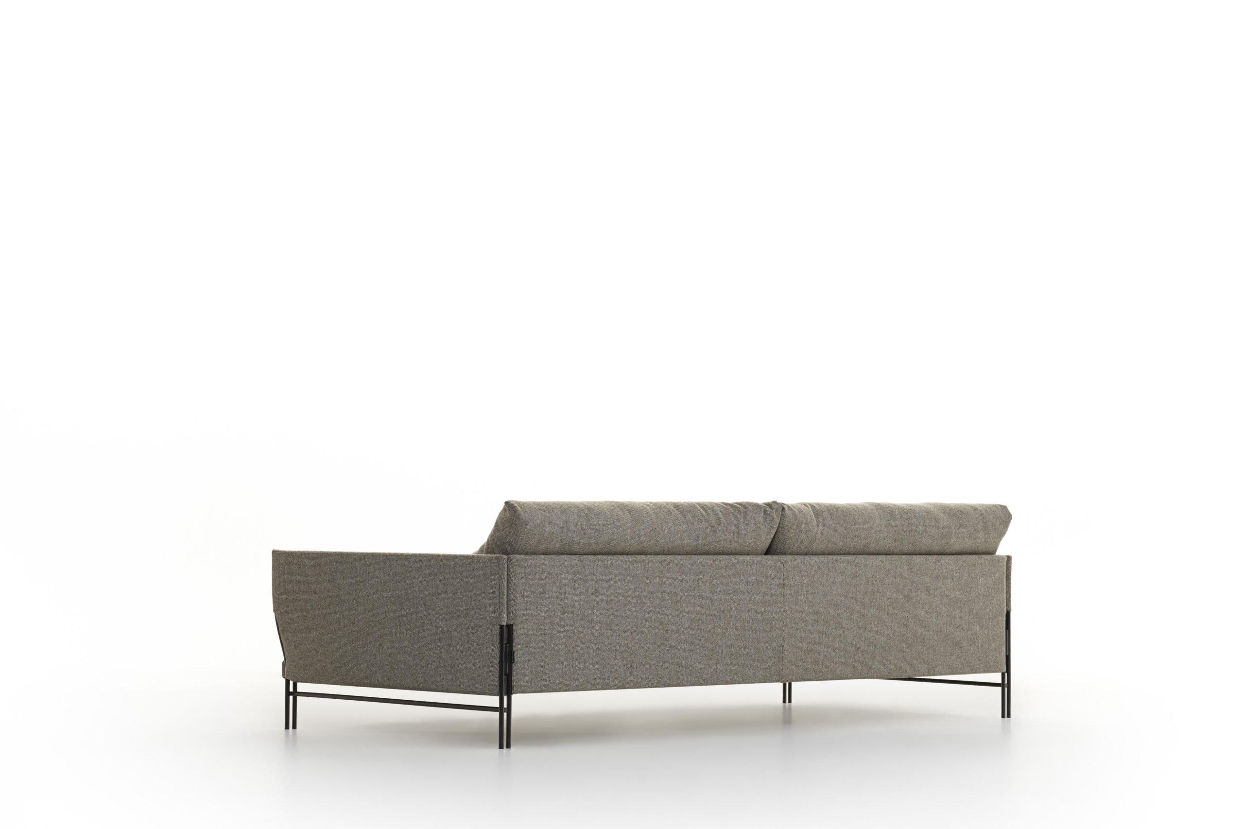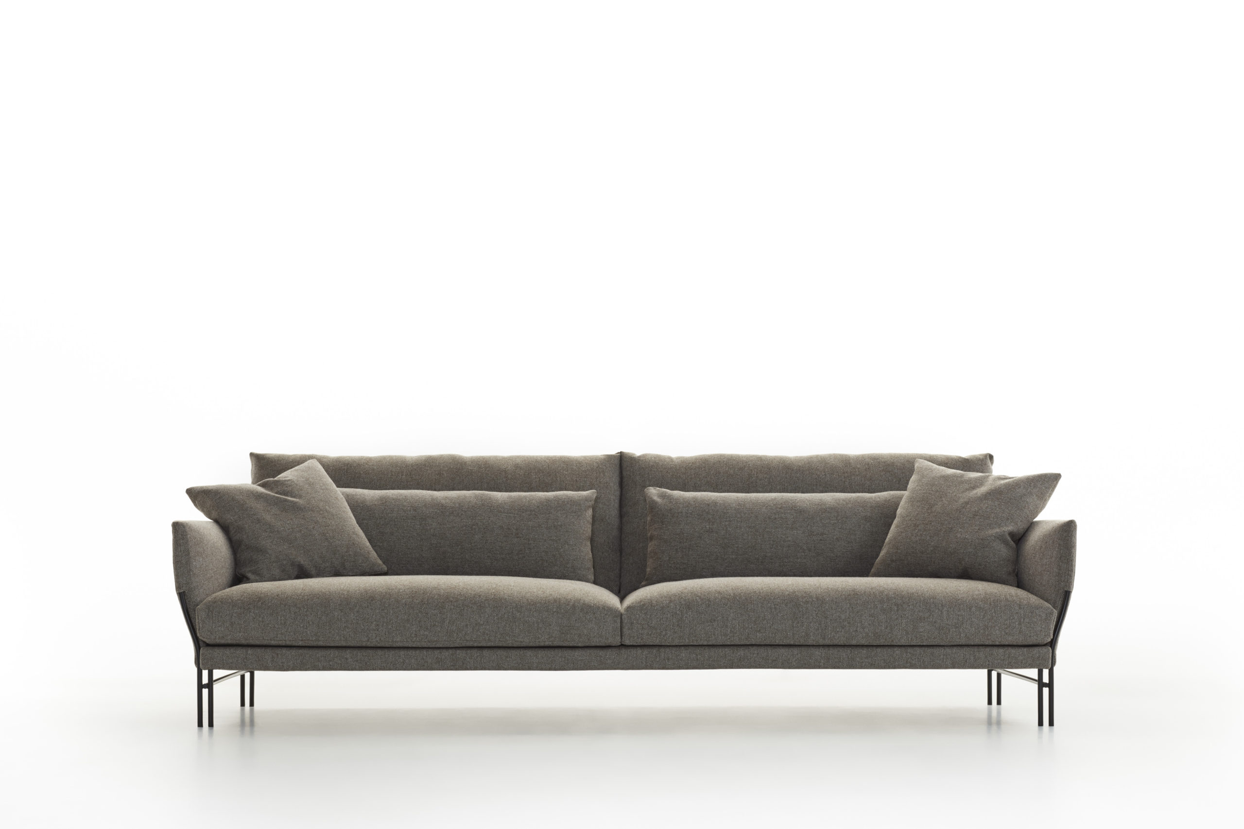 This sofa combines elegant, clean and pure lines with the comfort provided by a thick and soft sitting area, qualities that the back of the sofa also convey. Aesthetically, one of its most distinct features is a visible base made up of a double leg system that reveals the lightness and the strength of the structure.