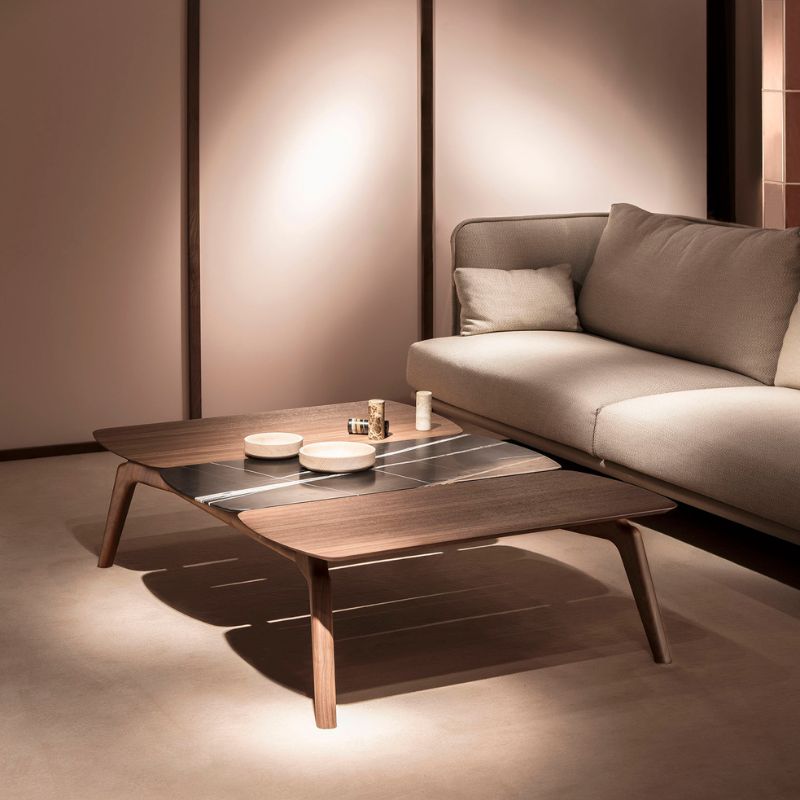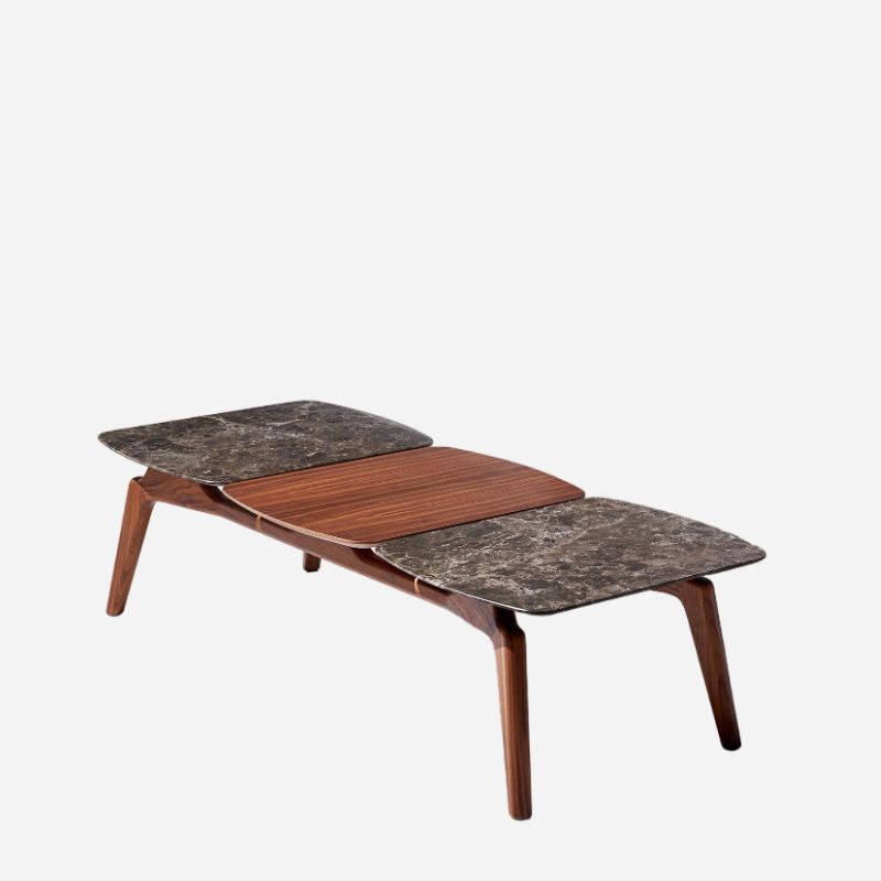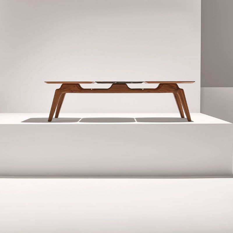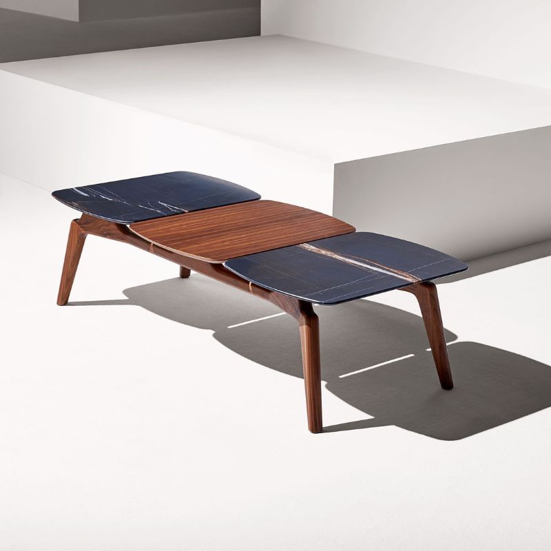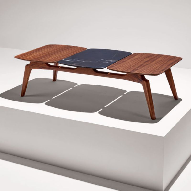 Its attractive design allows to configure tables of different dimensions combining walnut with Calacatta gold, Sahara Noir or Emperador marbles. Its design invites you to participate in its creation.
