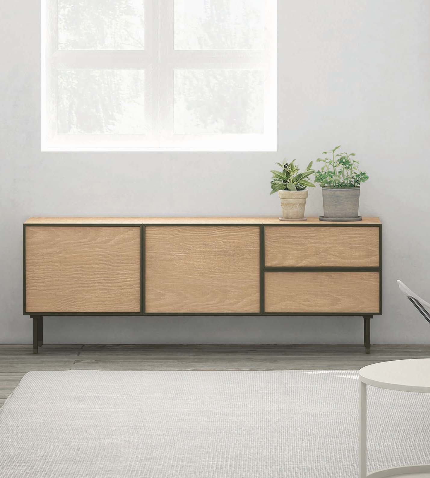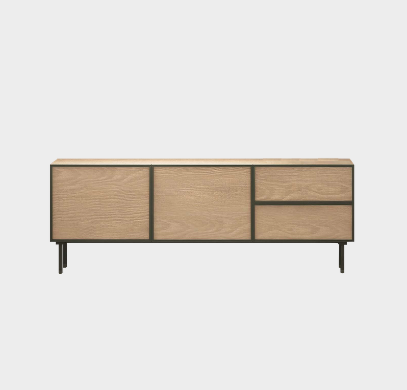 Oak with black open pore lacquer frames and black lacquer metal base. Two drawers, two doors. For more custom options, please contact us.