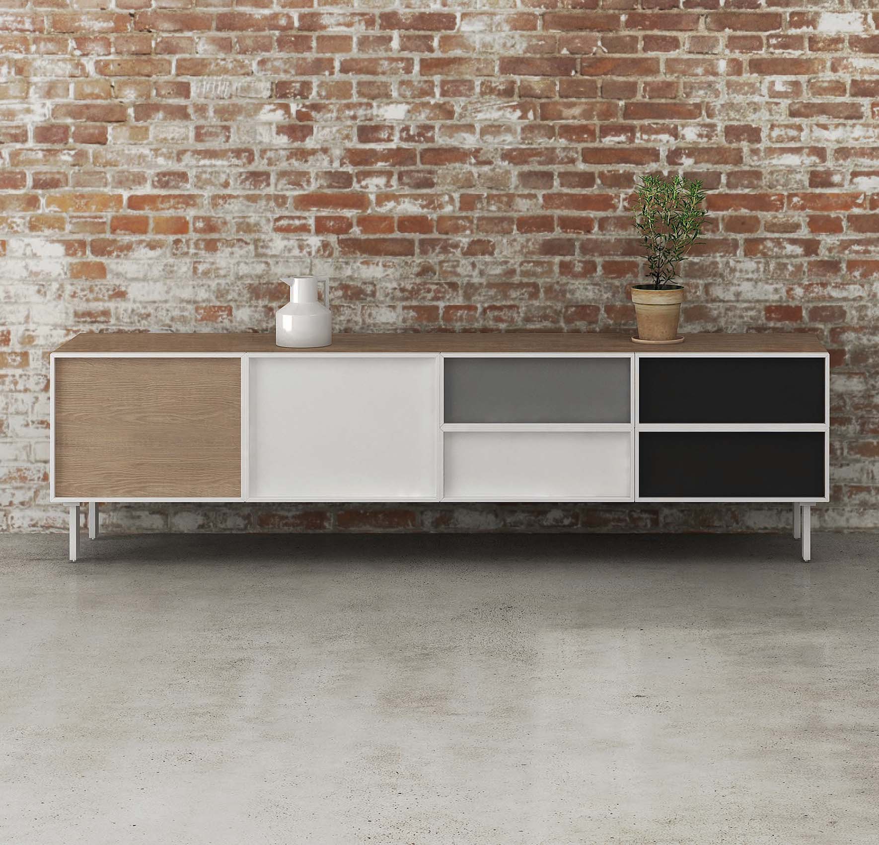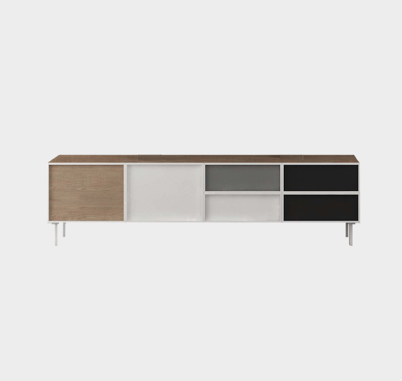 Light walnut structure, one light walnut door, one white lacquer door, one white lacquer drawer, one grey drawer, two black drawers with white open pore lacquer frames and white lacquer metal base. Four drawers and two doors. For more custom options, please contact us.