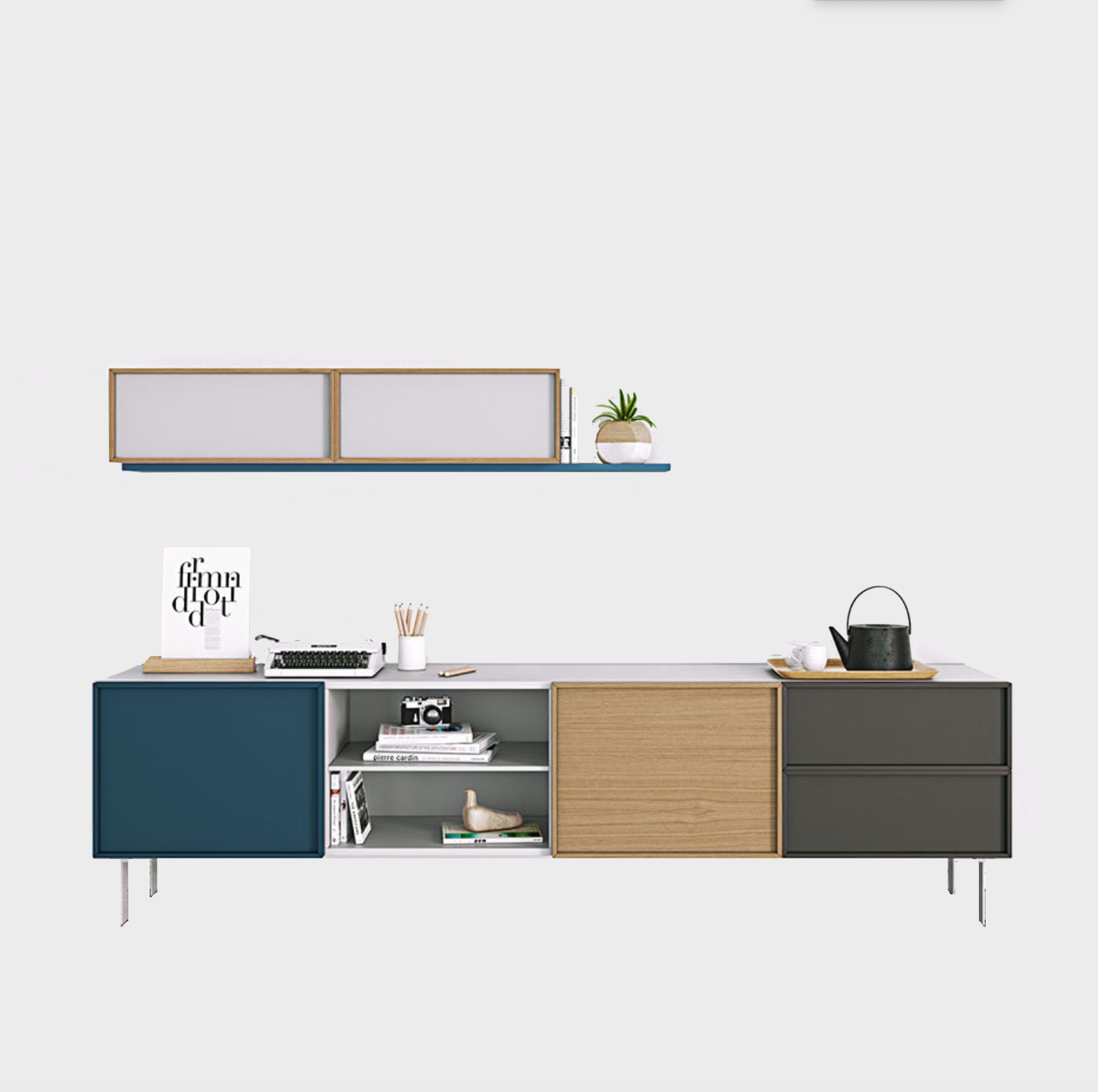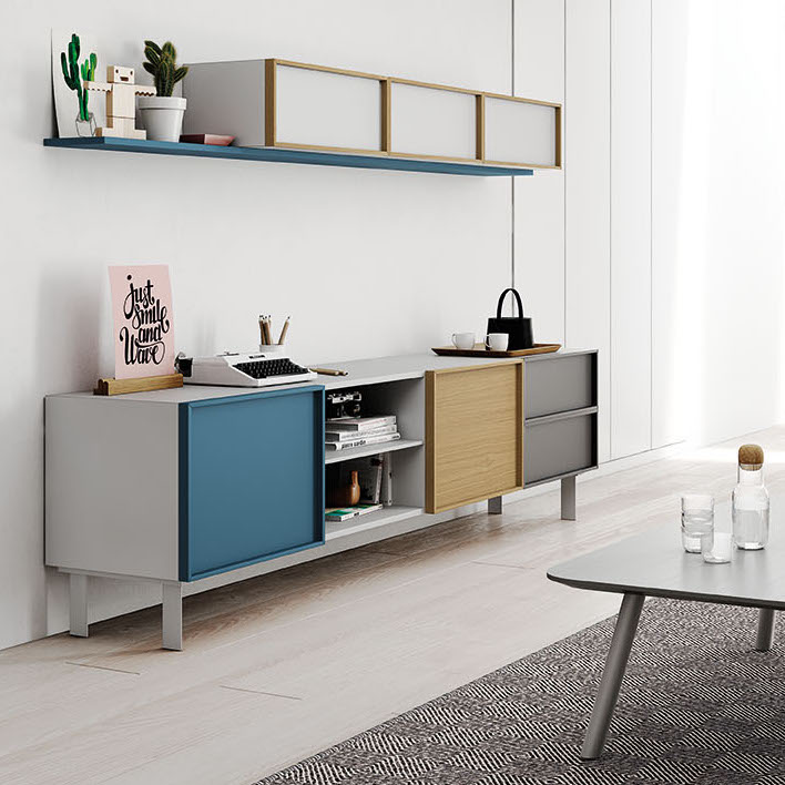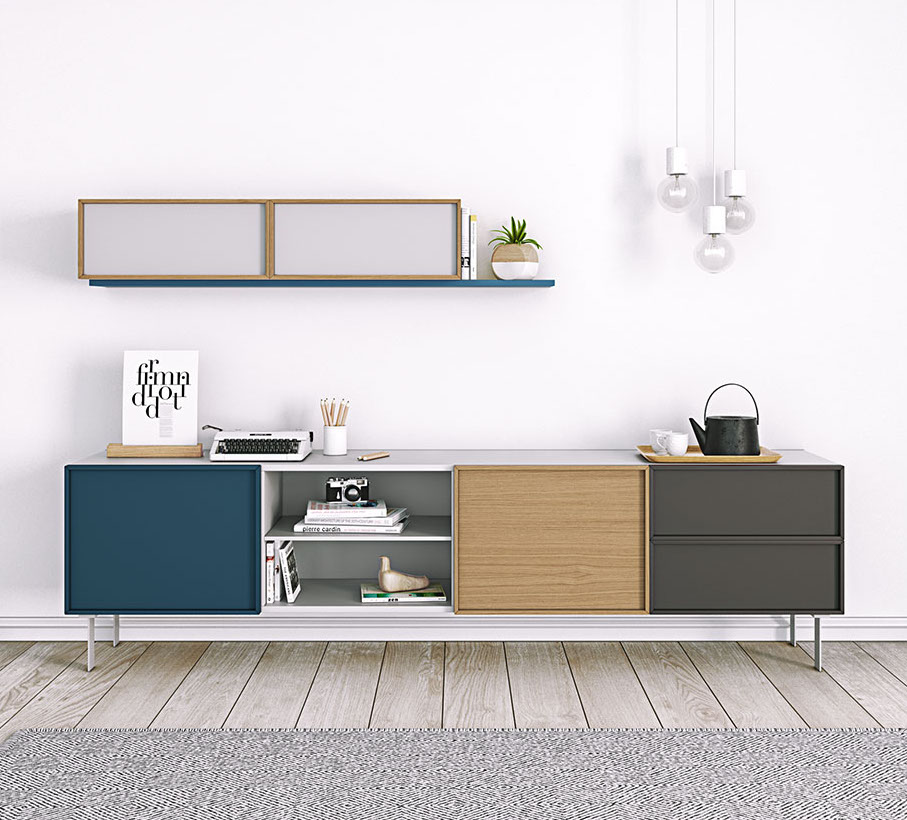 White lacquer structure, one ultramar door with ultamar open pore frame, one oak door with oak frame, two grungrau lacquer drawers with grungrau open-pore frame, one white lacquer open unit with shelf and white lacquer metal base. Two doors two drawers and one open module with shelf. For more custom options, please contact us.
