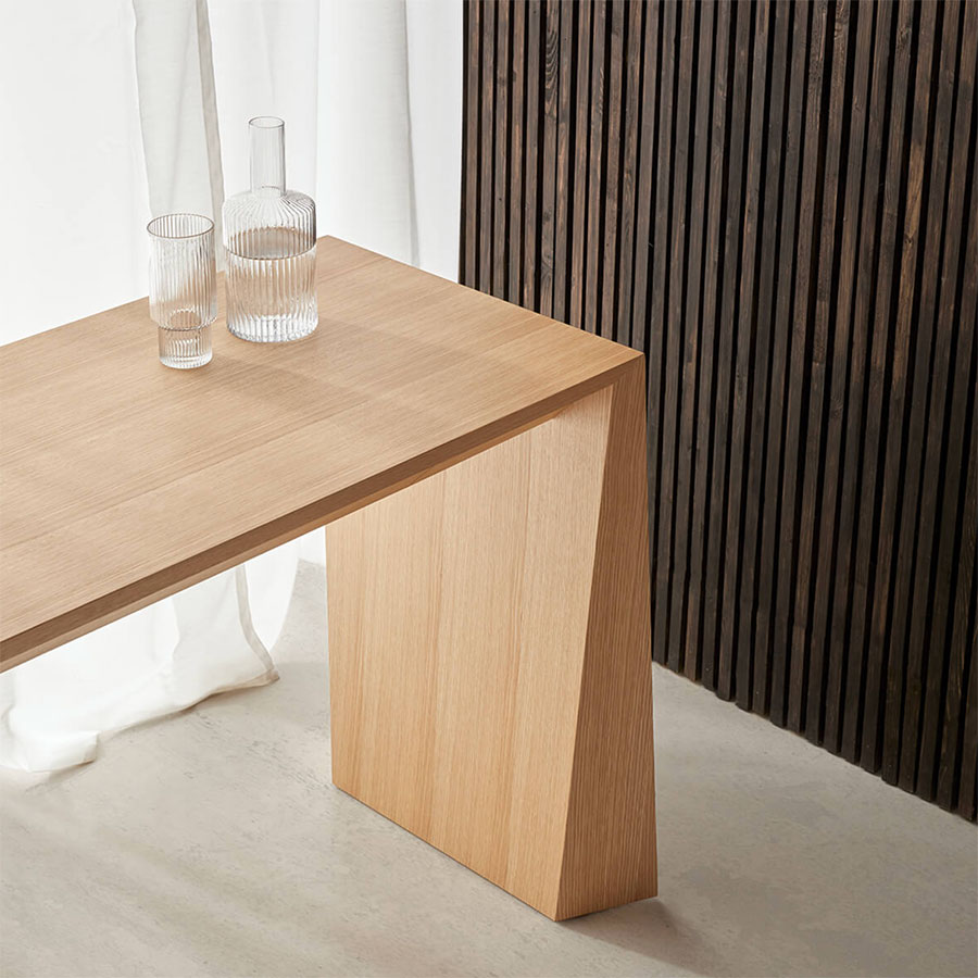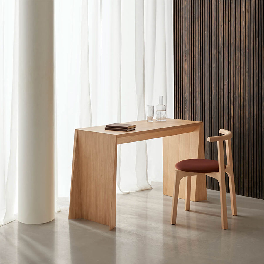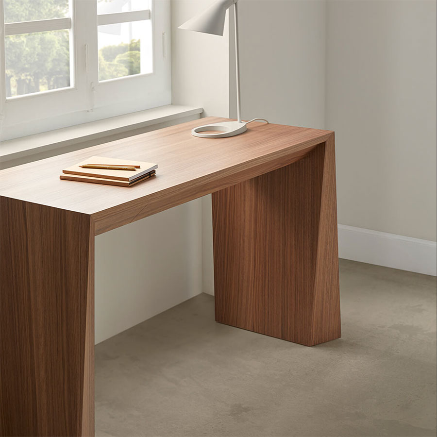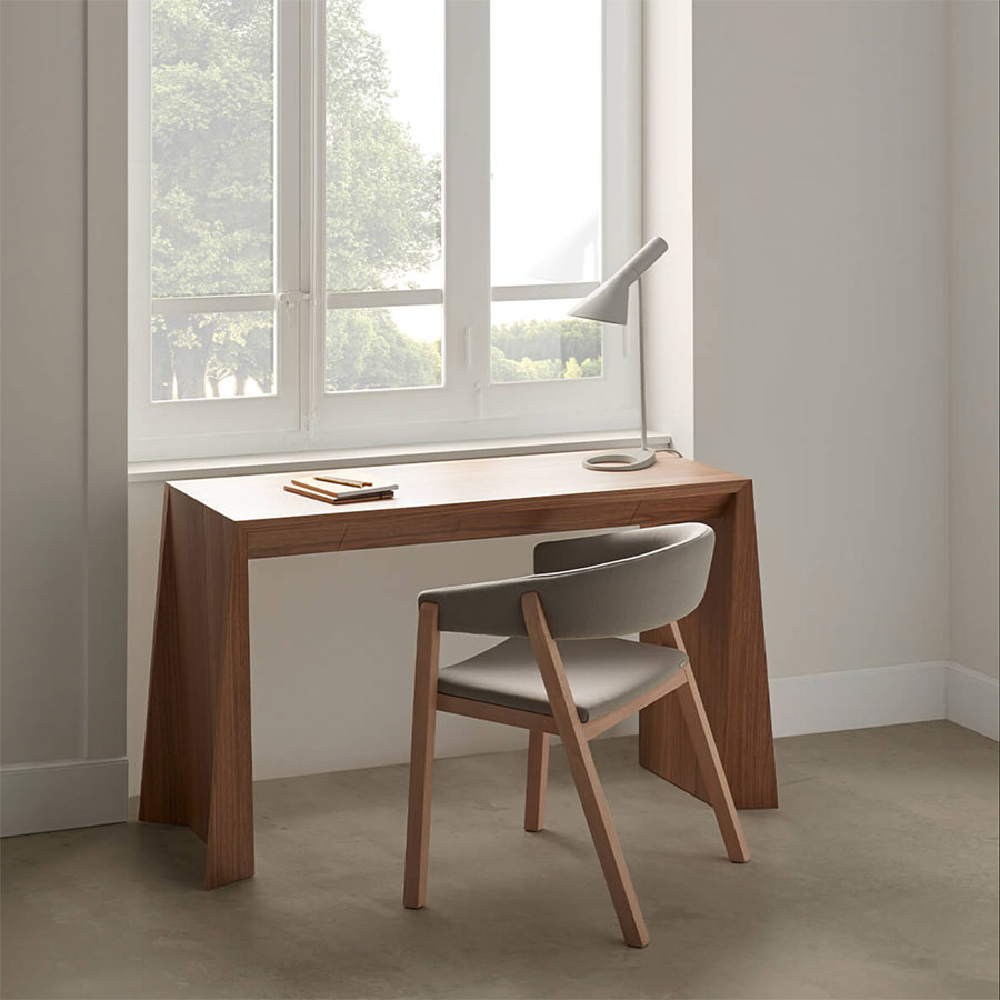 The desk features beautiful materials such as walnut and stained oak in a variety of tones. It stands out for its easy integration both in residential and in offices and hotels, thanks to its great personality in the shapes and noble materials.