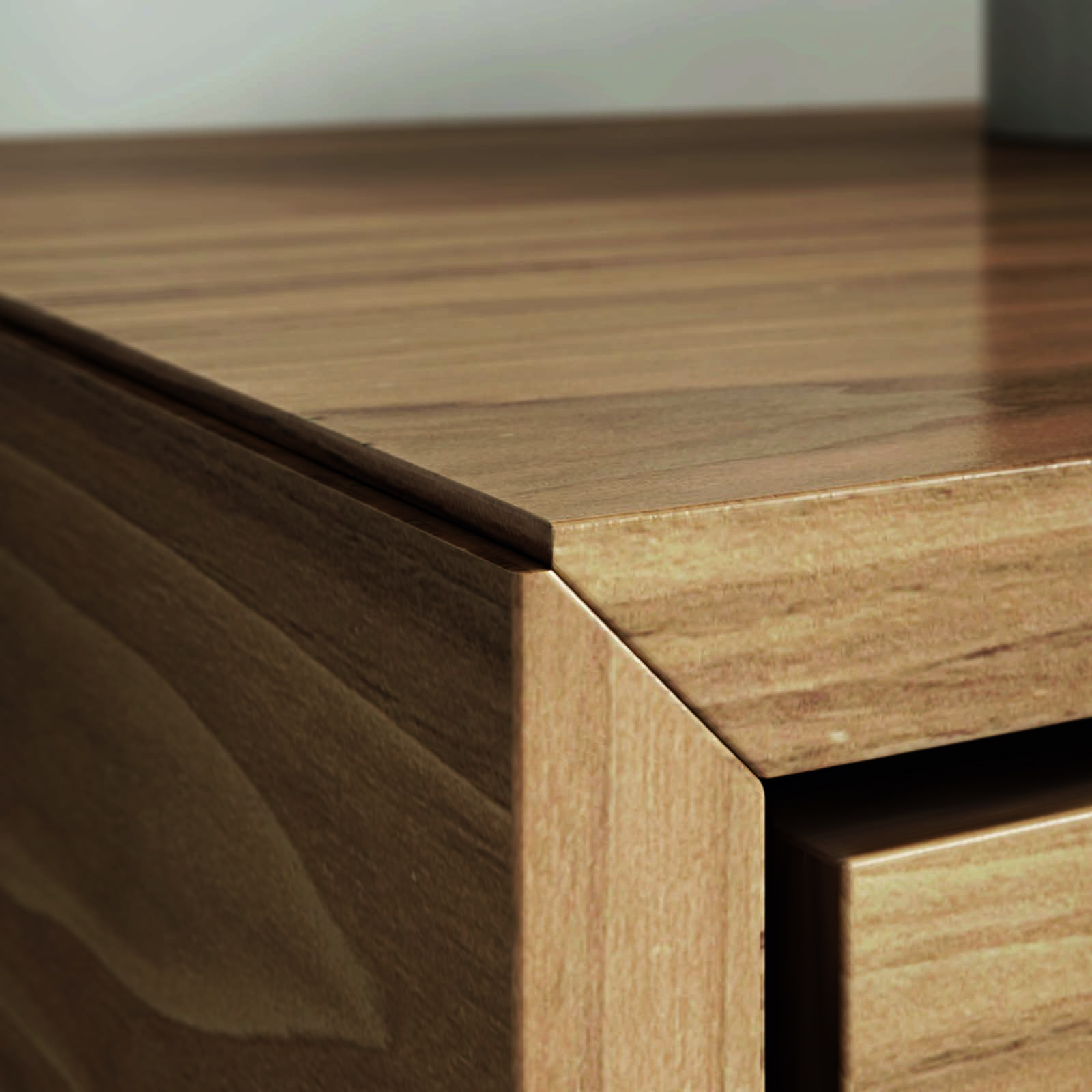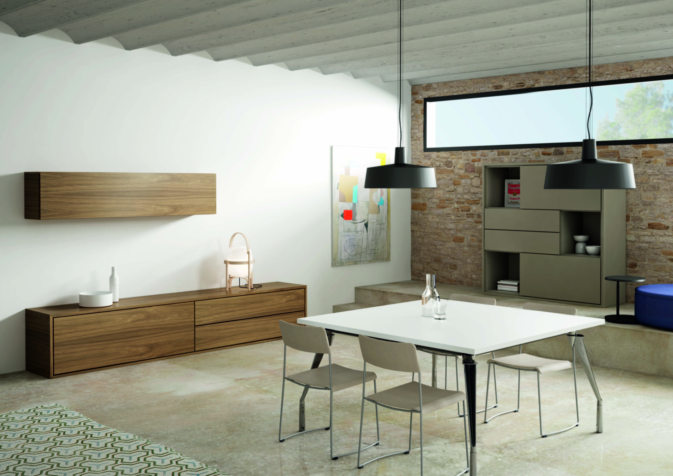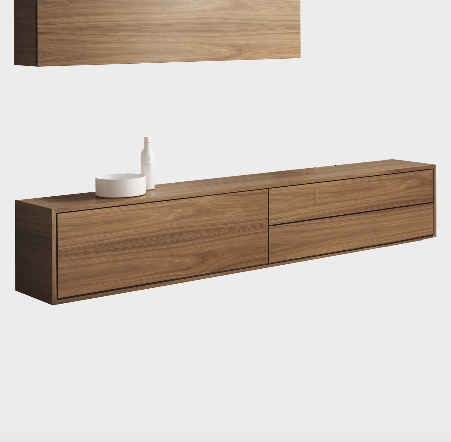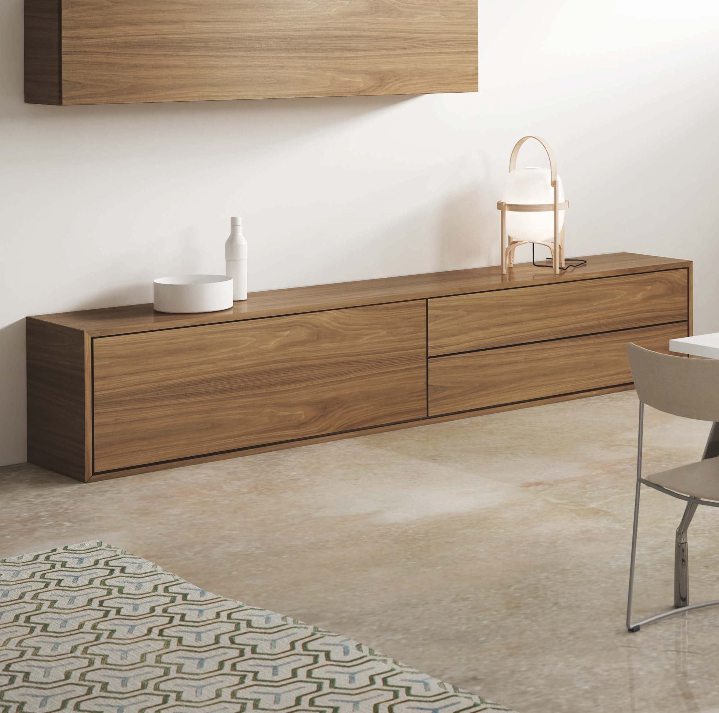 Its construction system is based on structural side and top panels which are 45 mm thick with a mitre joint of 45º. The range has hinged, lift-up and swing doors; the opening and closing system for the drawers is activated via a push-and-pull button, and they can be removed fully. All the elements have the same finish inside and out.