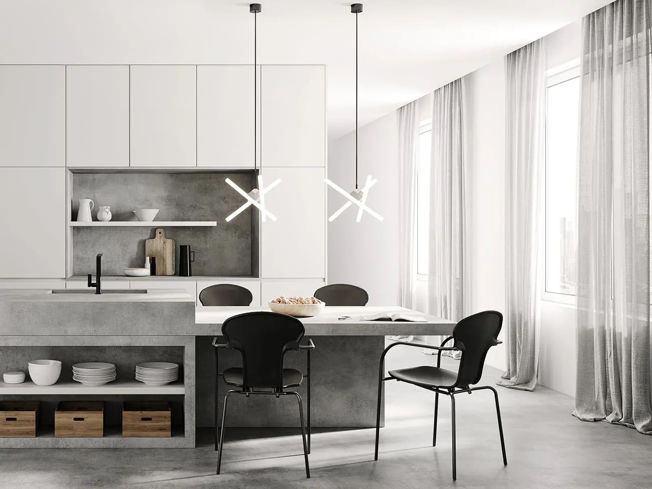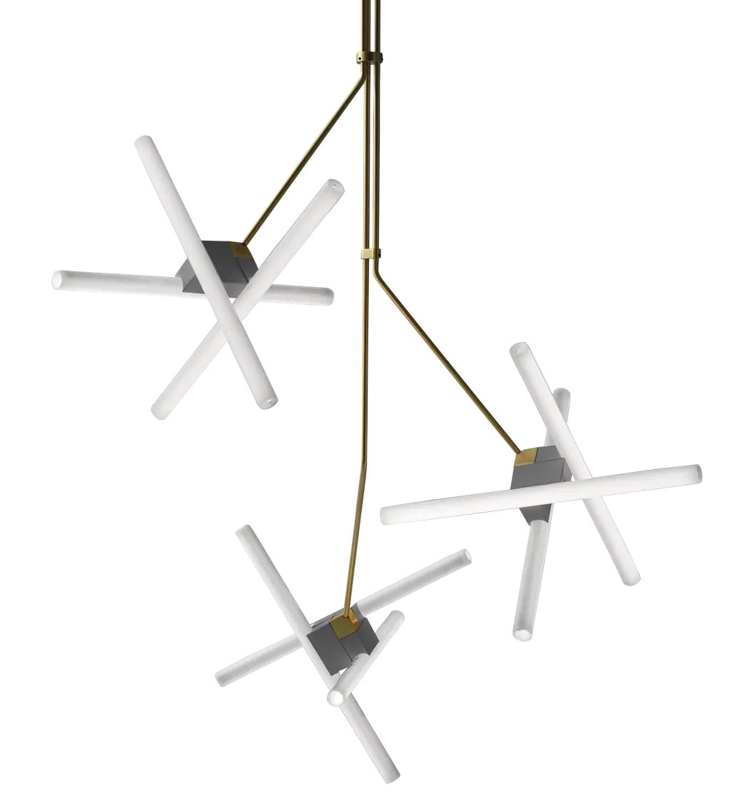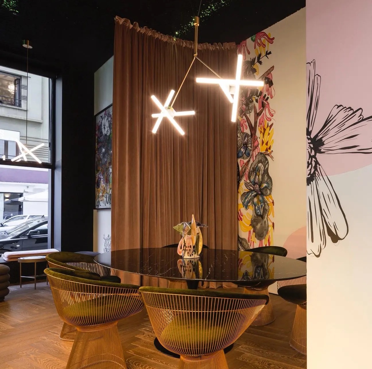 Featuring an industrial yet elegant aesthetic, the Olvidada Pendant consists of slender metal tubing finished in polished brass, copper, or matte black, with exposed bulbs that emit a warm and inviting glow, in 3 sizes. Its linear form makes it ideal for illuminating dining tables, kitchen counters, or bar areas with a distinctive touch of sophistication.