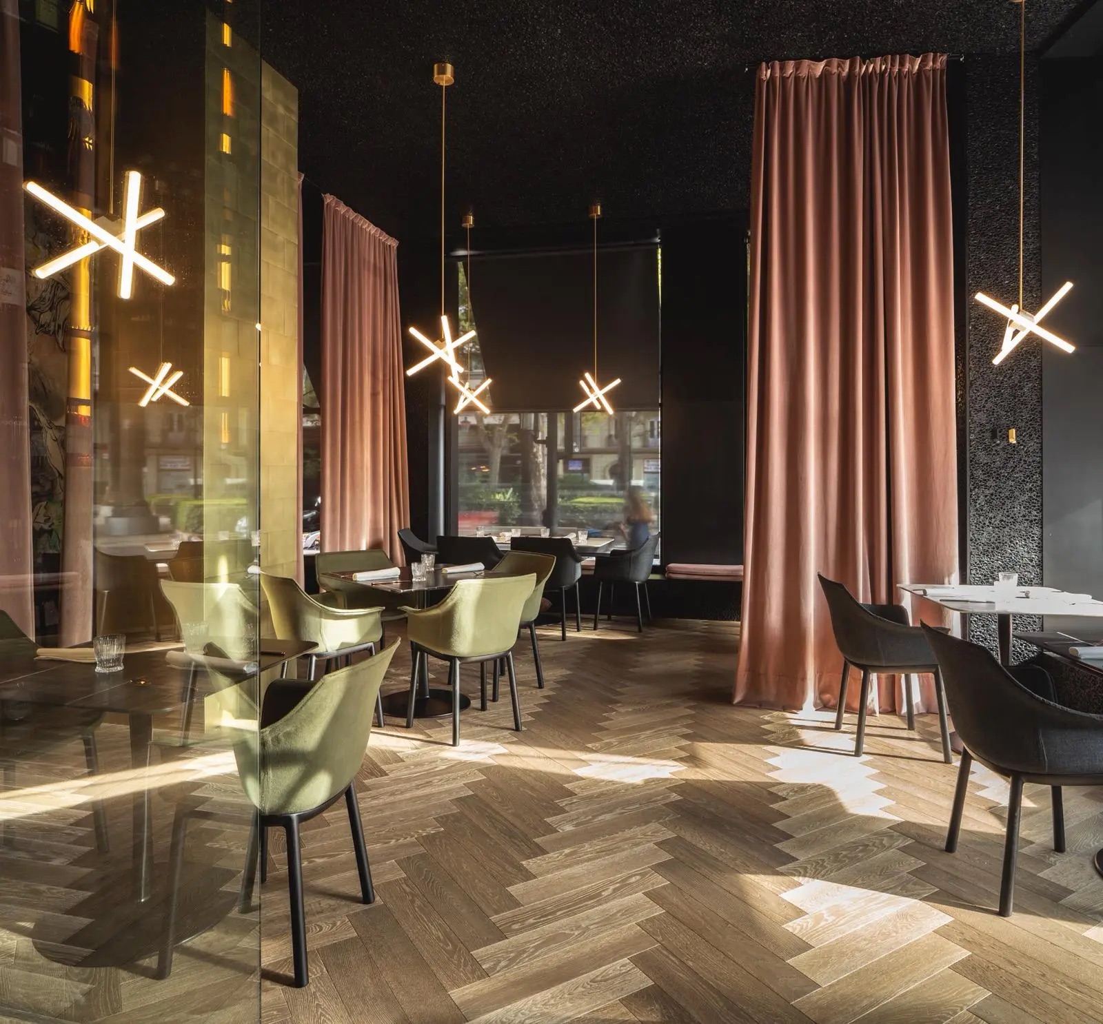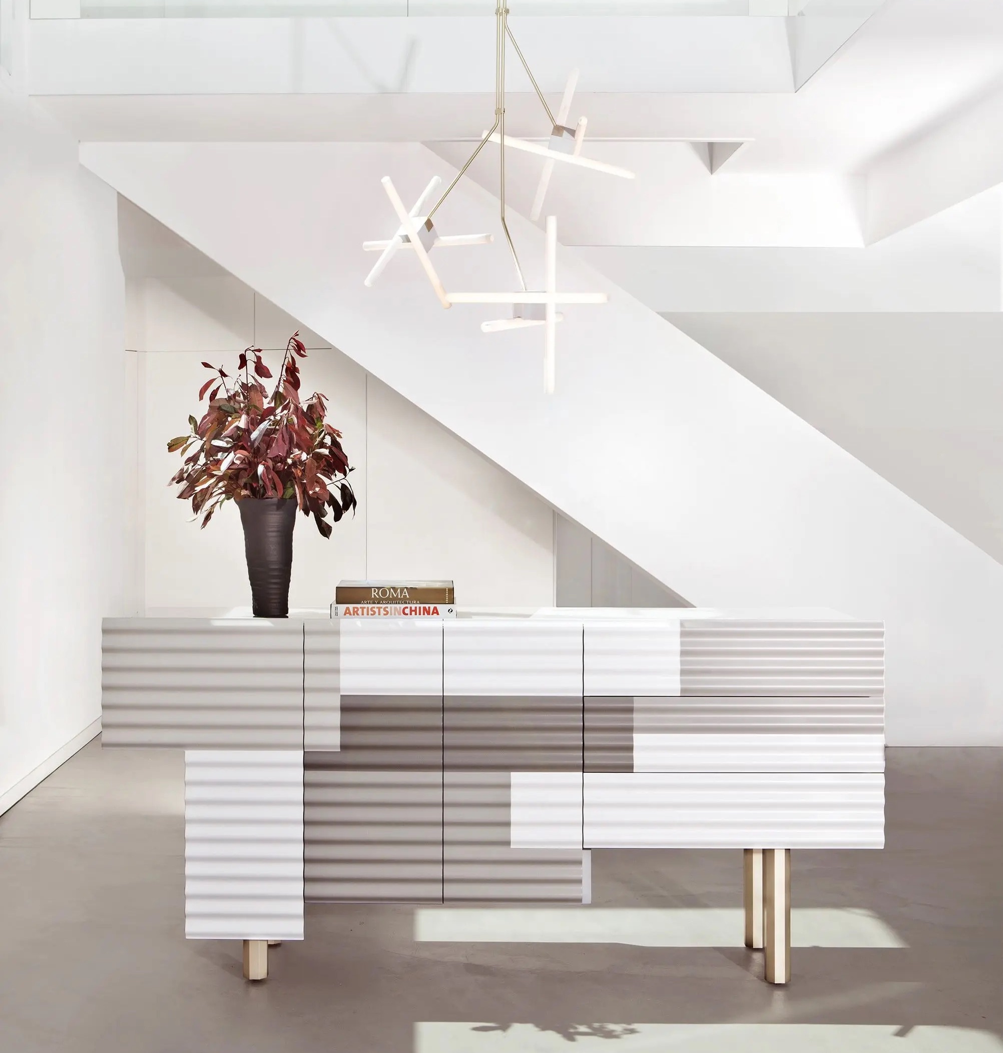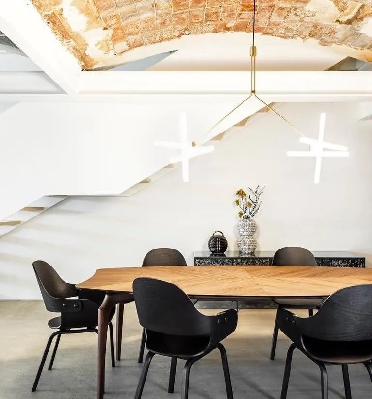 Featuring an industrial yet elegant aesthetic, the Olvidada Pendant consists of slender metal tubing finished in polished brass, copper, or matte black, with exposed bulbs that emit a warm and inviting glow, in 3 sizes. Its linear form makes it ideal for illuminating dining tables, kitchen counters, or bar areas with a distinctive touch of sophistication.