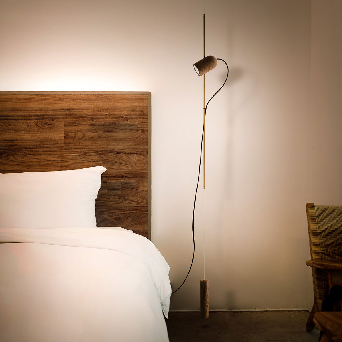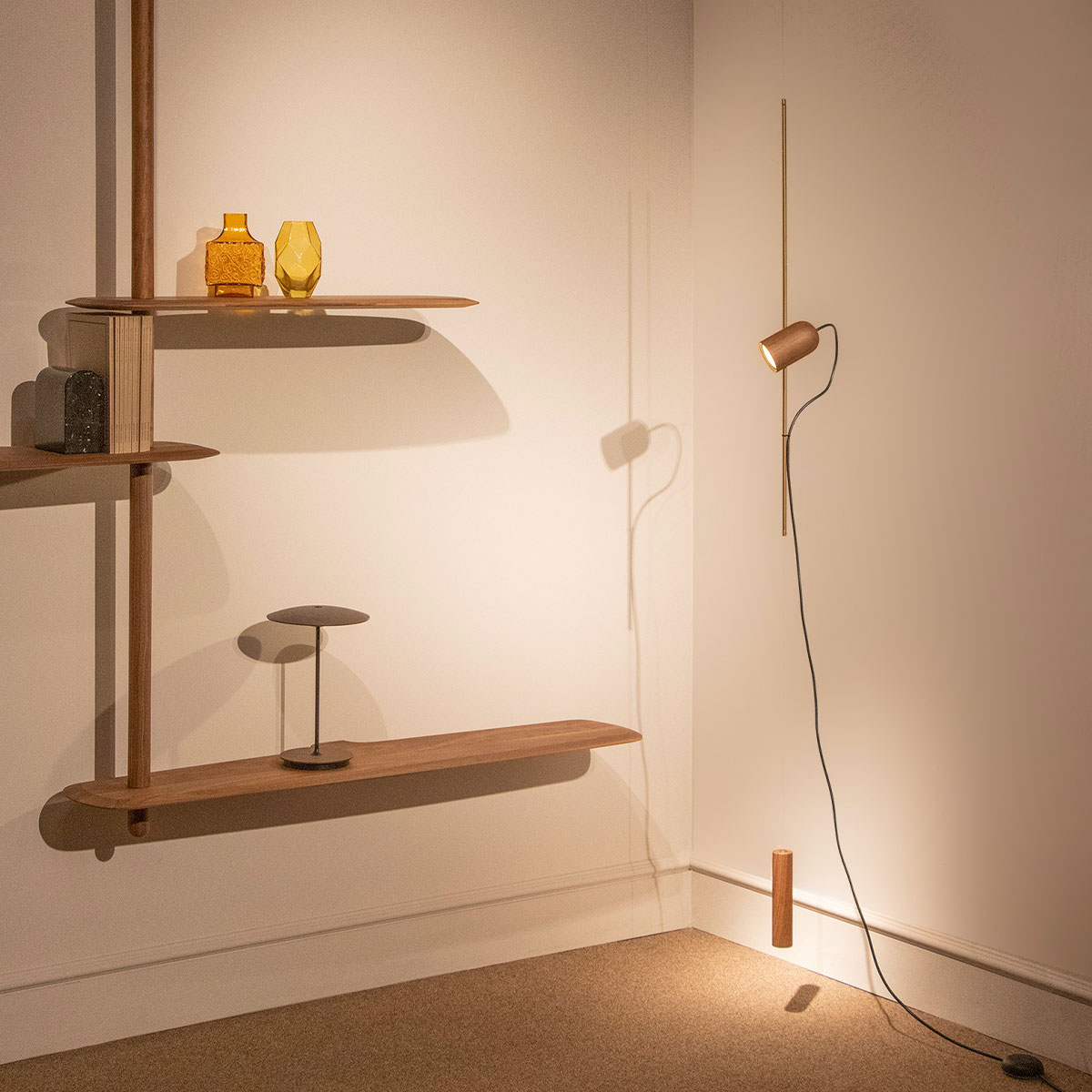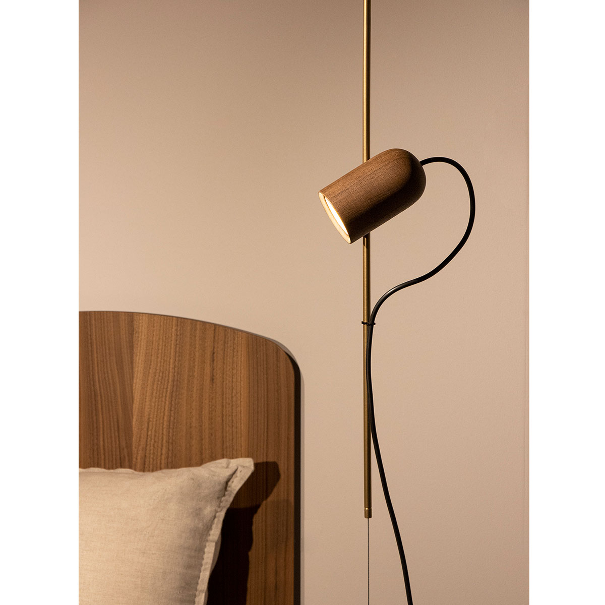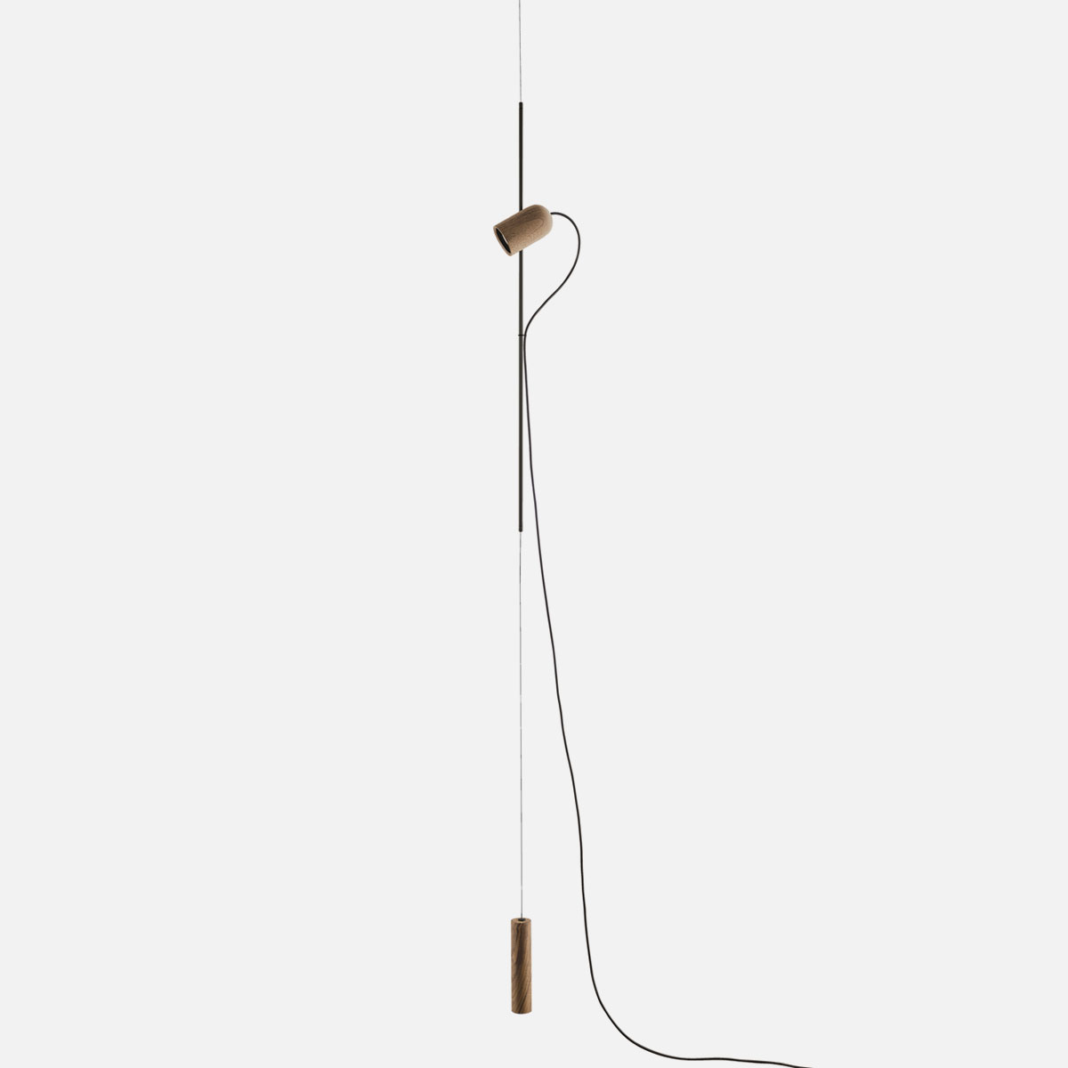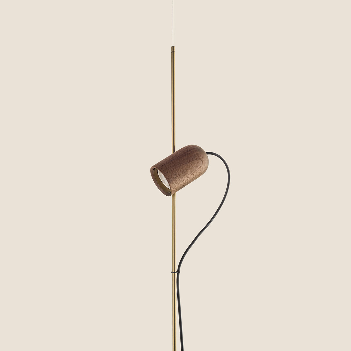 Finished in either solid walnut, black stained ash or natural oak, with metal and cord detailing in either brass or graphite finished metal.