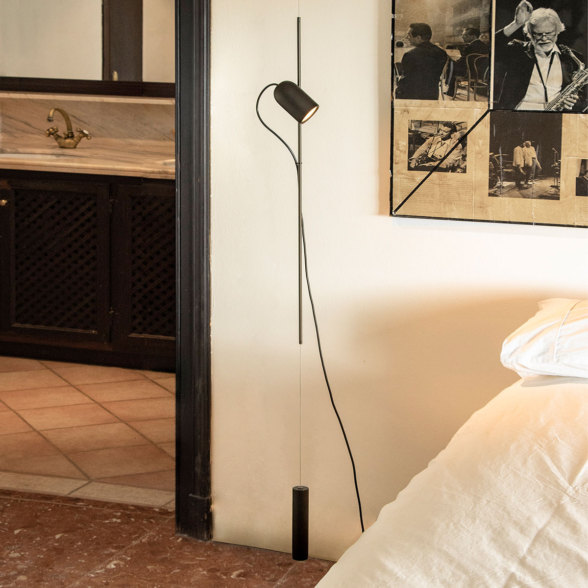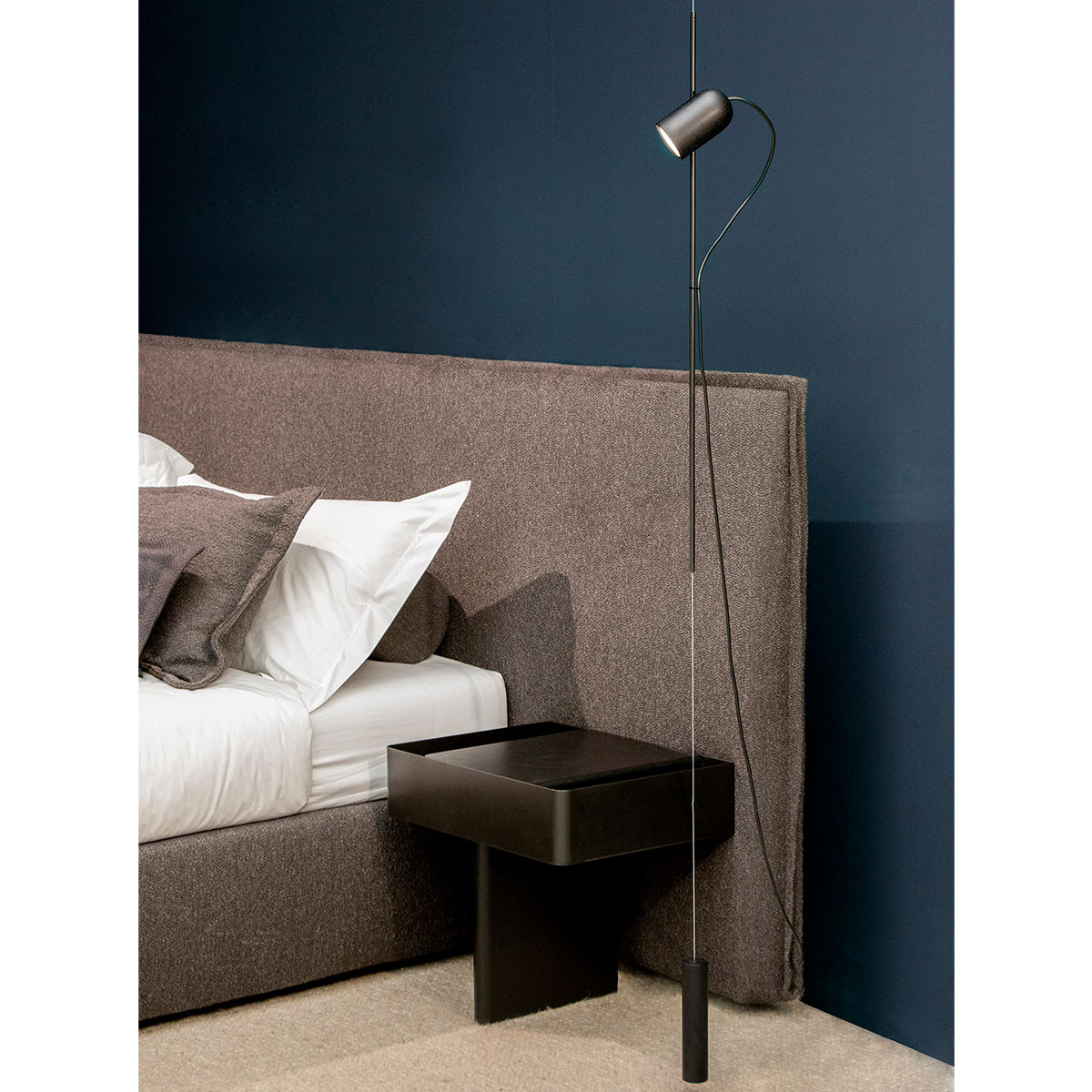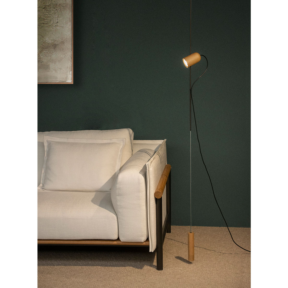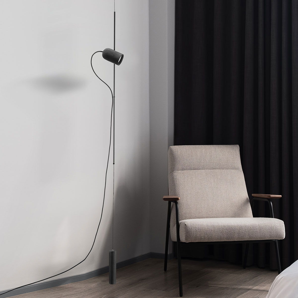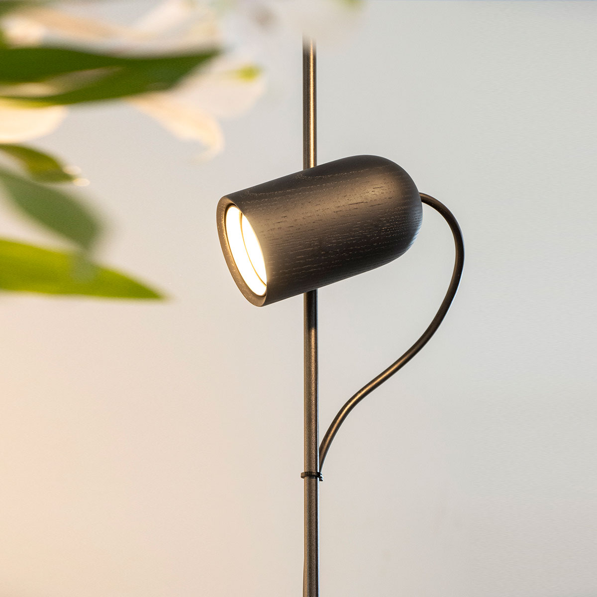 Finished in either solid walnut, black stained ash or natural oak, with metal and cord detailing in either brass or graphite finished metal.