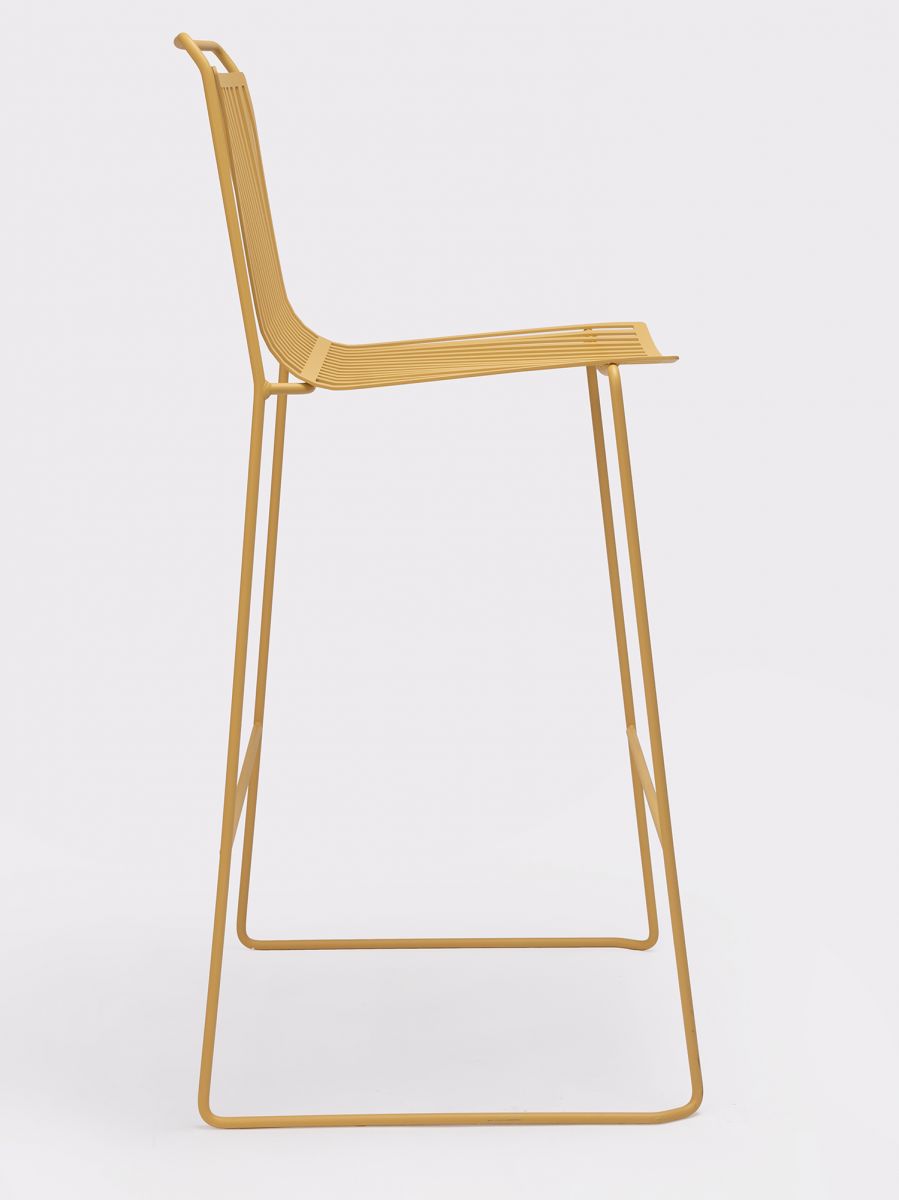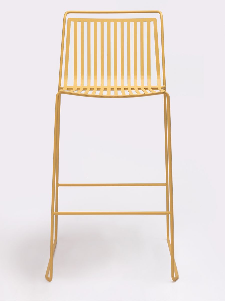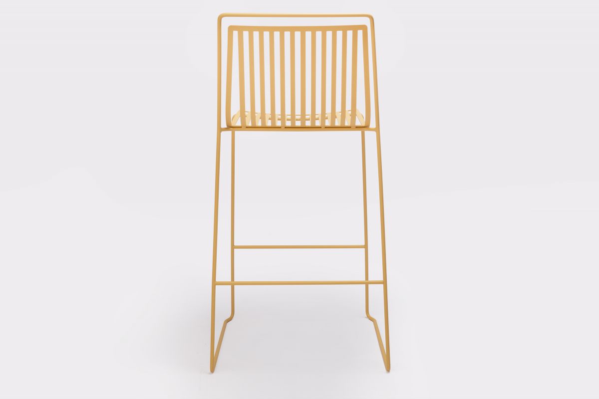A steel structure surrounding a shell of steel slats, which seem as if they are floating, make this stool ideal for terraces or gardens.