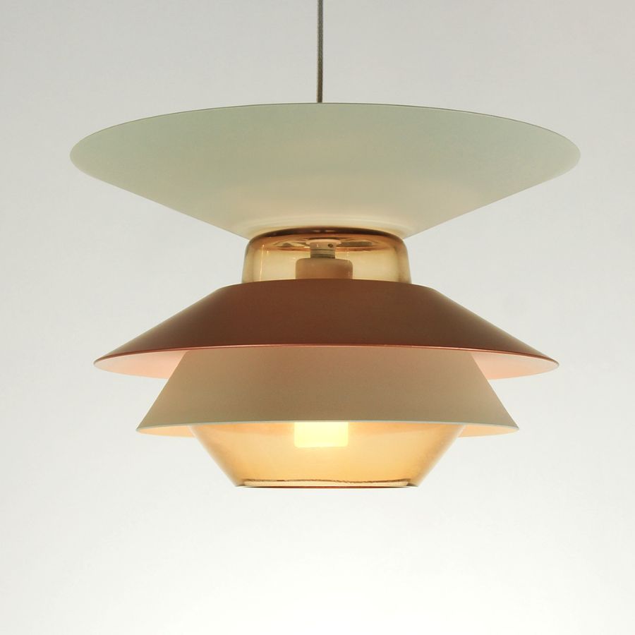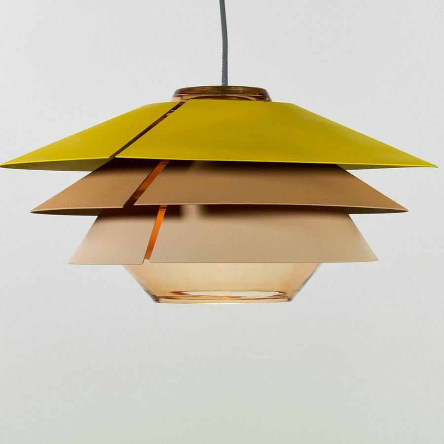 Cognac-coloured glass pairs with reflectors in matte beige, copper, grey-beige, and yellow. Grey glass is complemented by reflectors in matte beige, dark blue, and light blue. Finished with a grey textile cable.