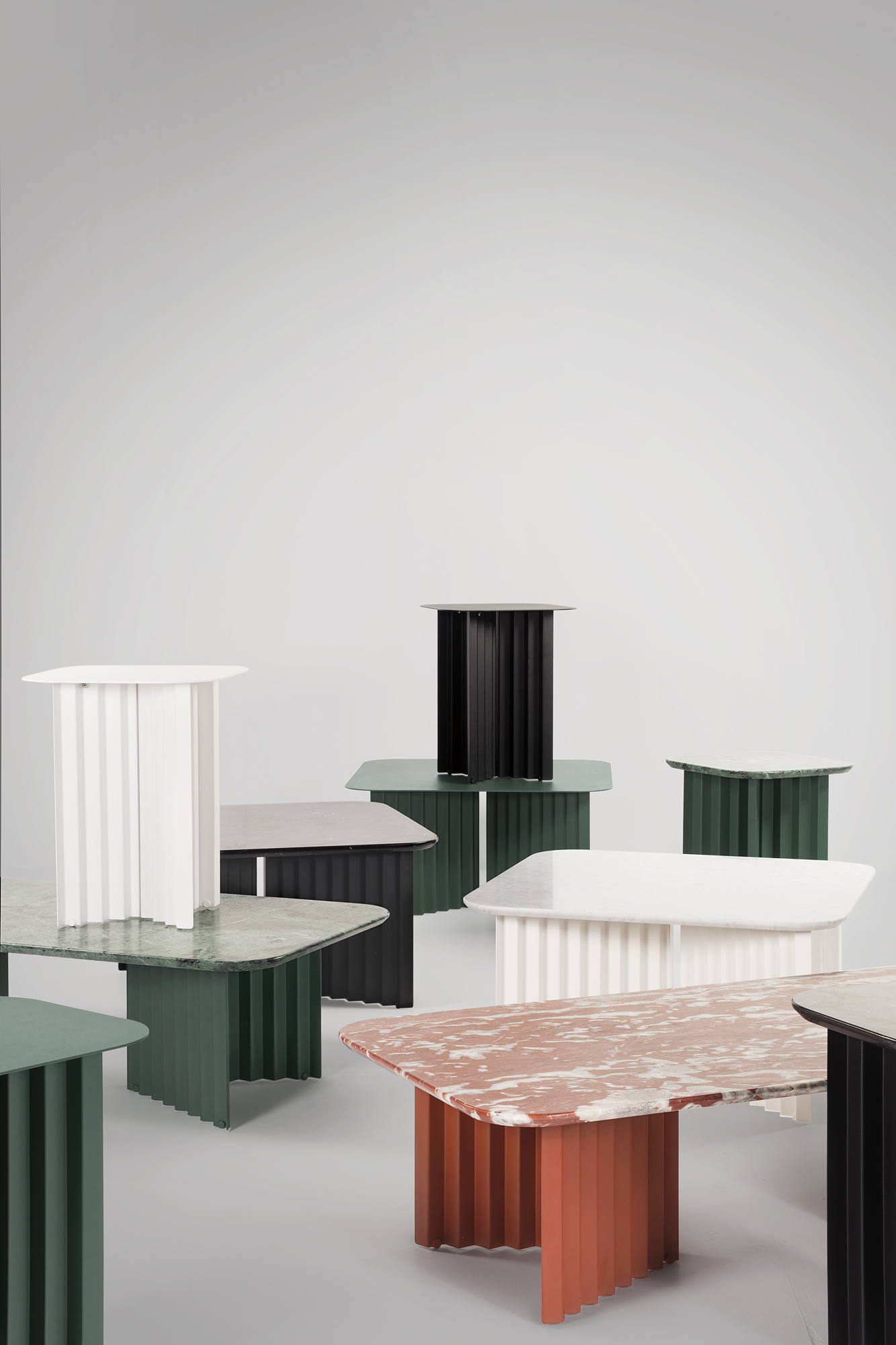Plec was born as a rectangular coffee table in three sizes and heights to combine with each other and fit into any environment, both indoors and outdoors. The distinctive structure of its accordion-shaped legs, when they meet the rays of light, creates light and shade effects that flood the room.