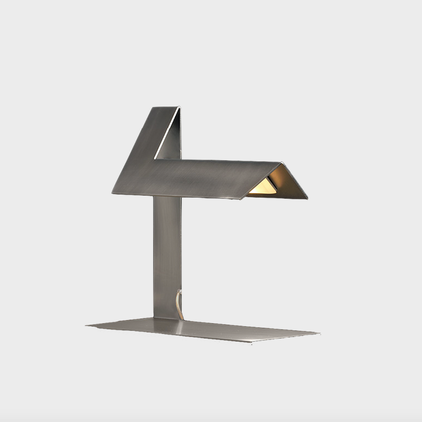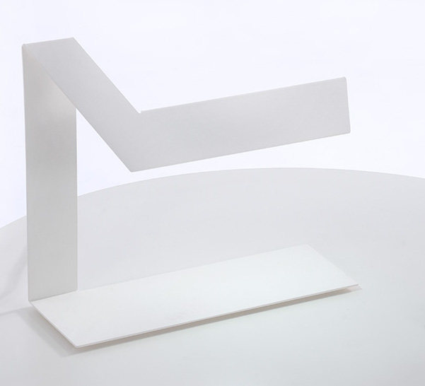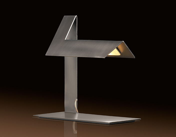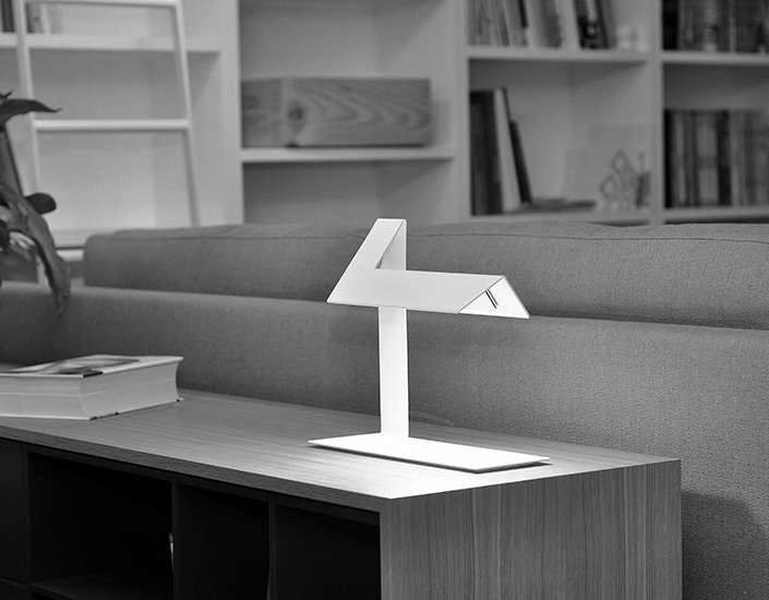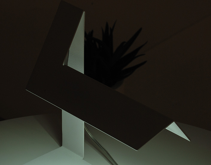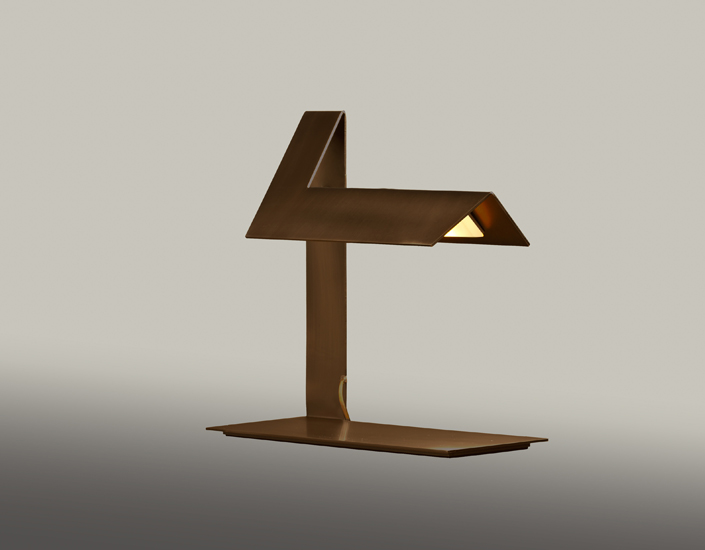 Plié is a table lamp with a strong architectural personality. It is a structure which is formed by a single part, created from the development of the metal. This piece is turned itself till there is a proportional and geometrical form. The result is a simple and asymmetrical fixture with an elegant and sober image.