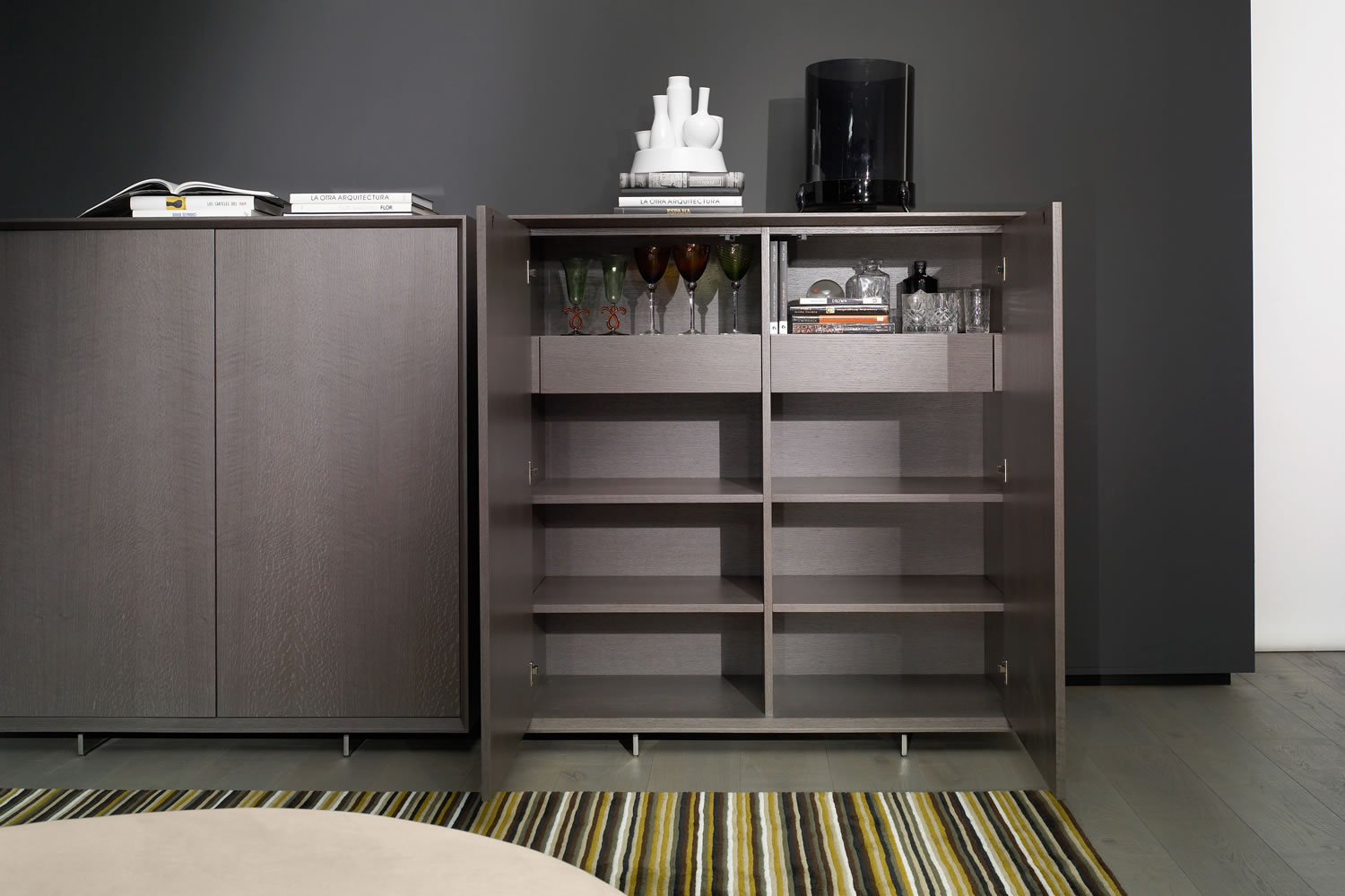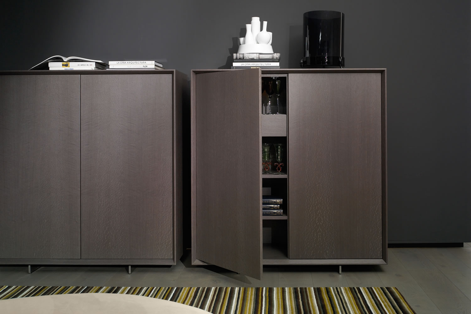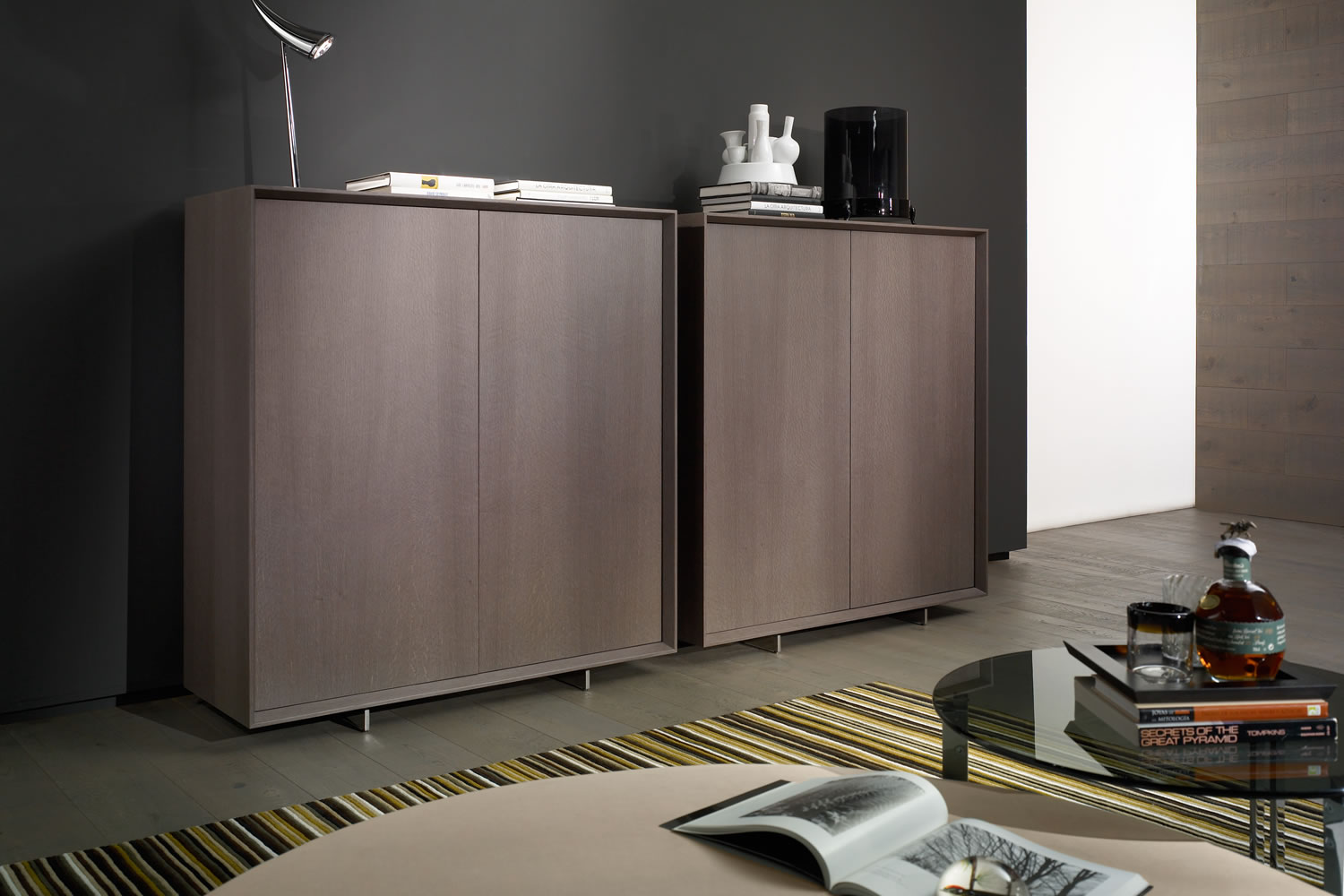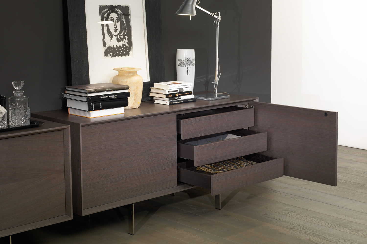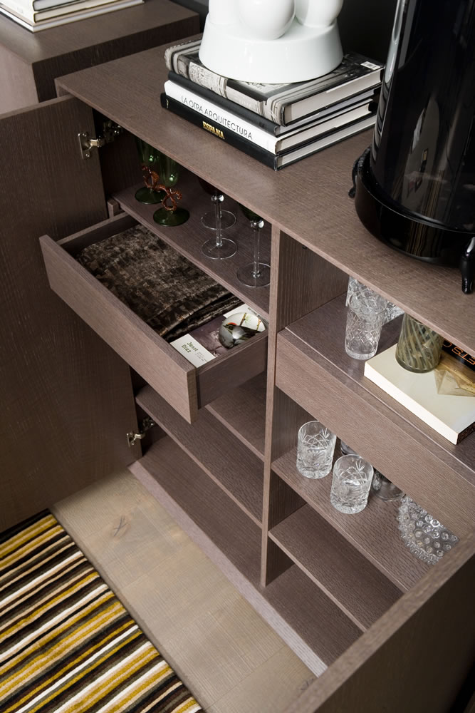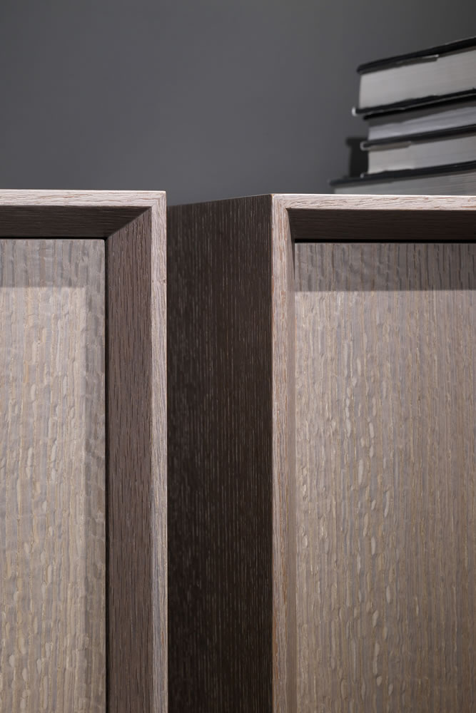 In simplicity and formal purity lies the premise of its design. The uniqueness of this collection is based on the bevel that outlines all the furniture, which gives it the point of distinction and elegance. Prisma is distinguished by the skill of hand worked craftsmanship and besides the quality of finishes for all interiors, are made in original veneer. The collection can be conducted using oak veneer or lacquered all colours according to the line catalogue.