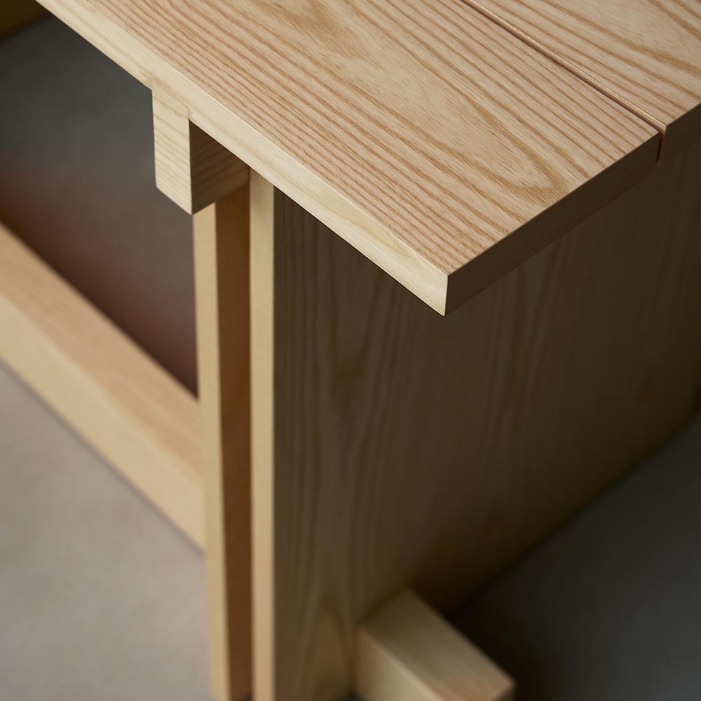 Squares, rectangles and circles which are disposed and dimensioned in such a way that, in spite of its heavy volume, a perfect balance in the resulting pieces is achieved. The hard angles resulting from superposing and intersecting these parts, made of natural or stained ash wood, define this furniture collection.