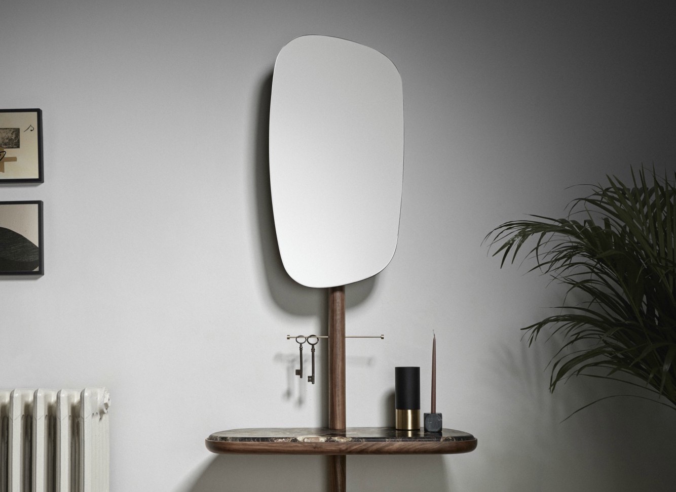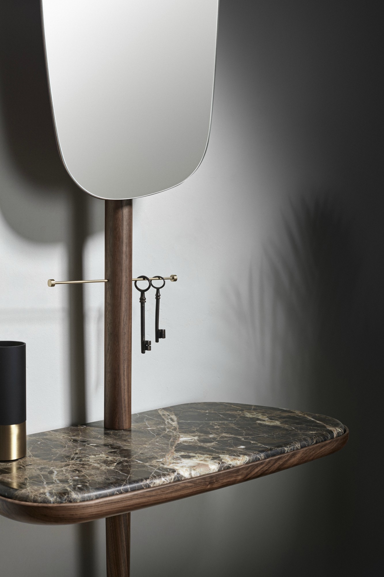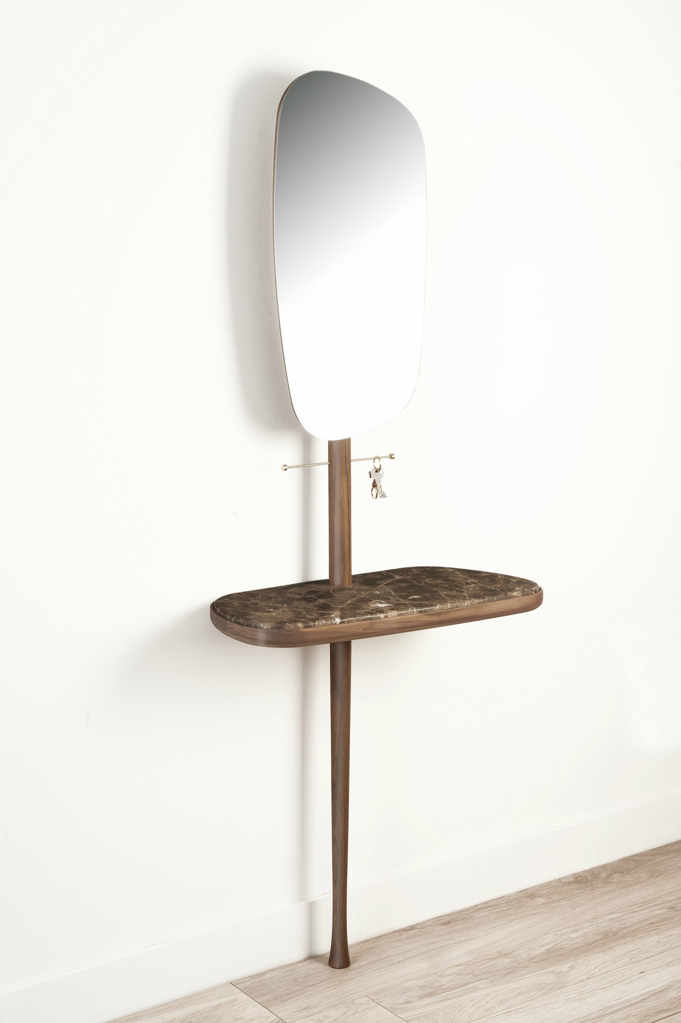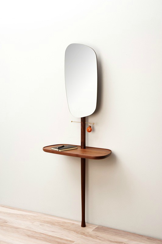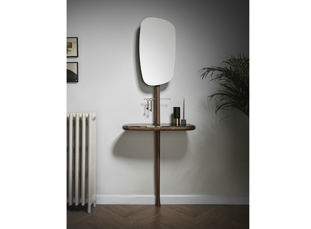 Arriving home glamorously. Functional product, acting as hallway or dressing room furniture, on which one can easily leave every accessory once arriving home. Natural solid walnut and polished brass accessory. The mirror can be adjusted in two heights and two positions.