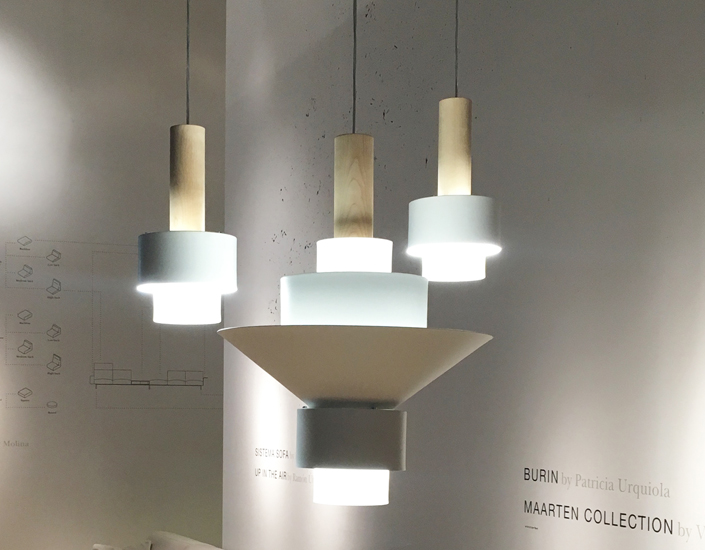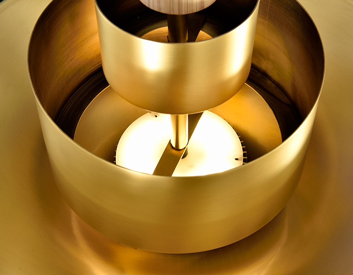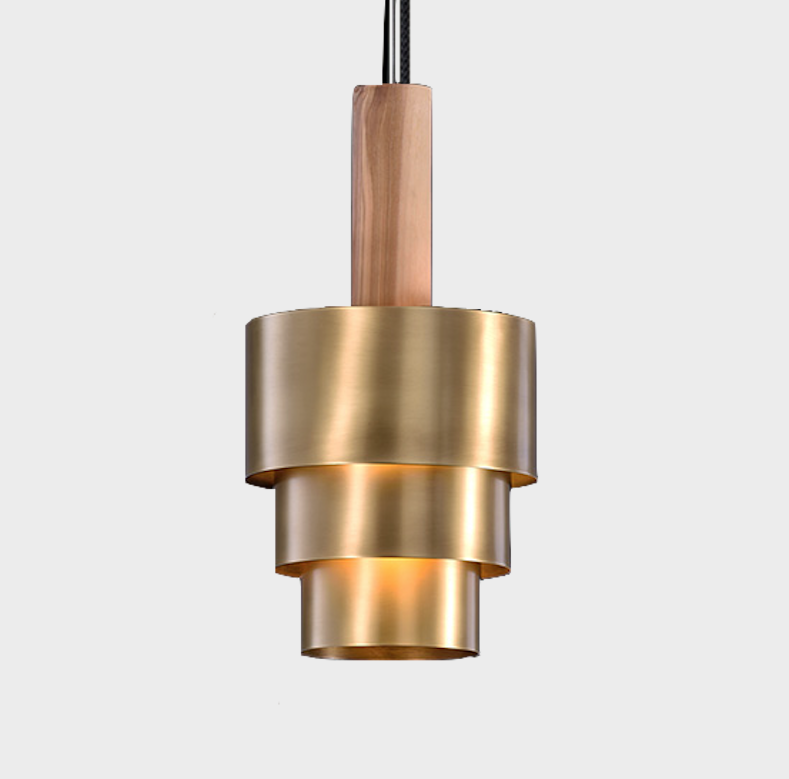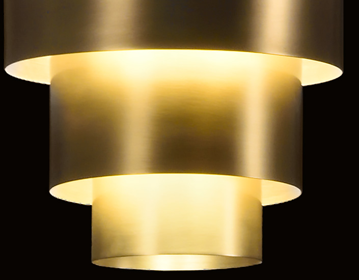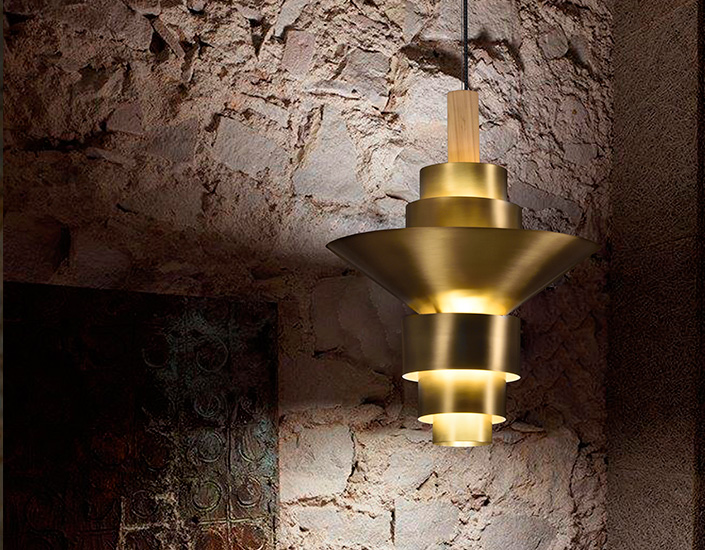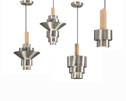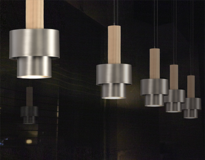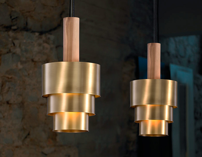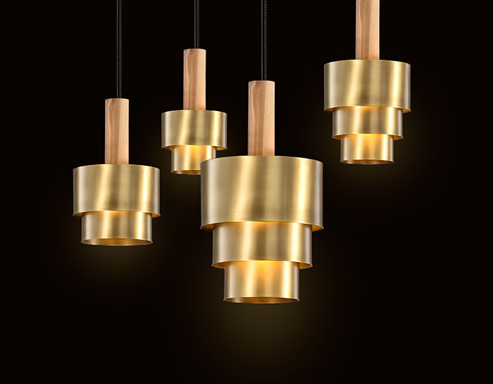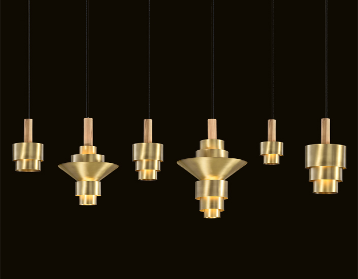 Set of pendants in various sizes, and wall lamp, composed of several brass pieces in brass, pewter or white, combined with a natural ash tree wood cylinder. The light source is integrated LED warm plate which produces a very special reflection on metal and wood pieces.