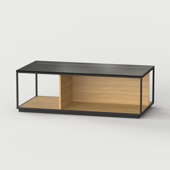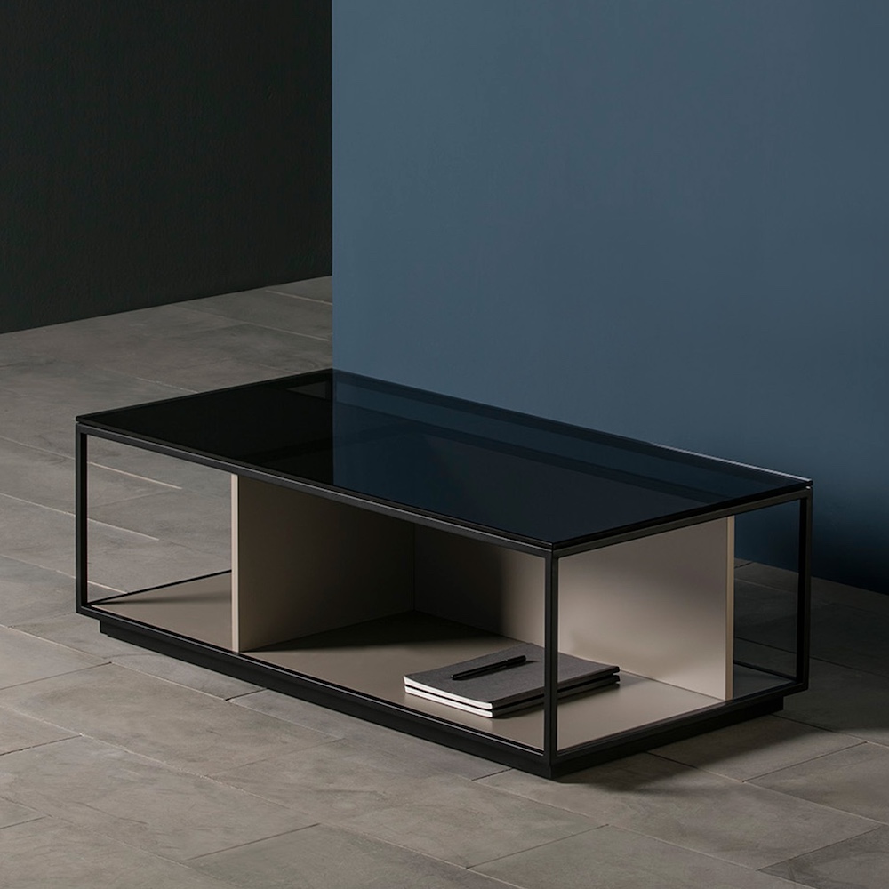 The tables are composed of a black microtexturedthermo-lacquered metal structure, a base and vertical sides, which can be customized in lacquer, walnut or oak, and a gray smoked glass top.