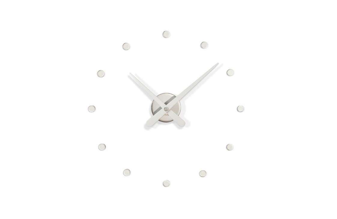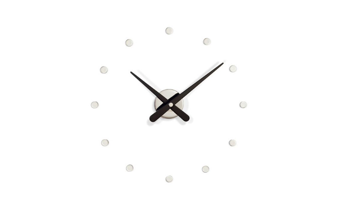 Rodon Mini L is a wall-mounted wooden and brass clock, smaller version of the Rodon watch. Simplicity and lightness define this versatile clock, suitable to any environment. The twelve time signals are marked with polished brass dots. The hands are presented in different options, metallic or in colored wood. A discrete proposal that, once installed, acquires its own personality.