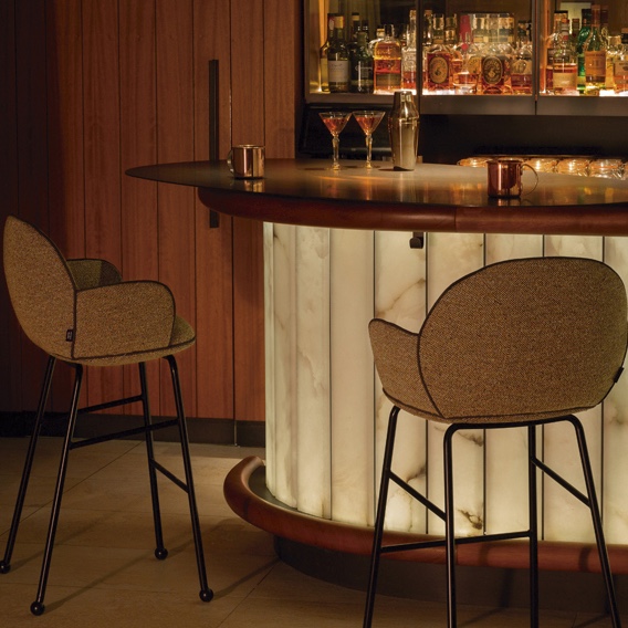 The stool of the Round Collection, which comes in two heights, is generous and handsome, and made to support even the most fulsome behinds. Like the other pieces in the collection, the colours and finishes can be customised, adding personality and class to restaurants and bars.