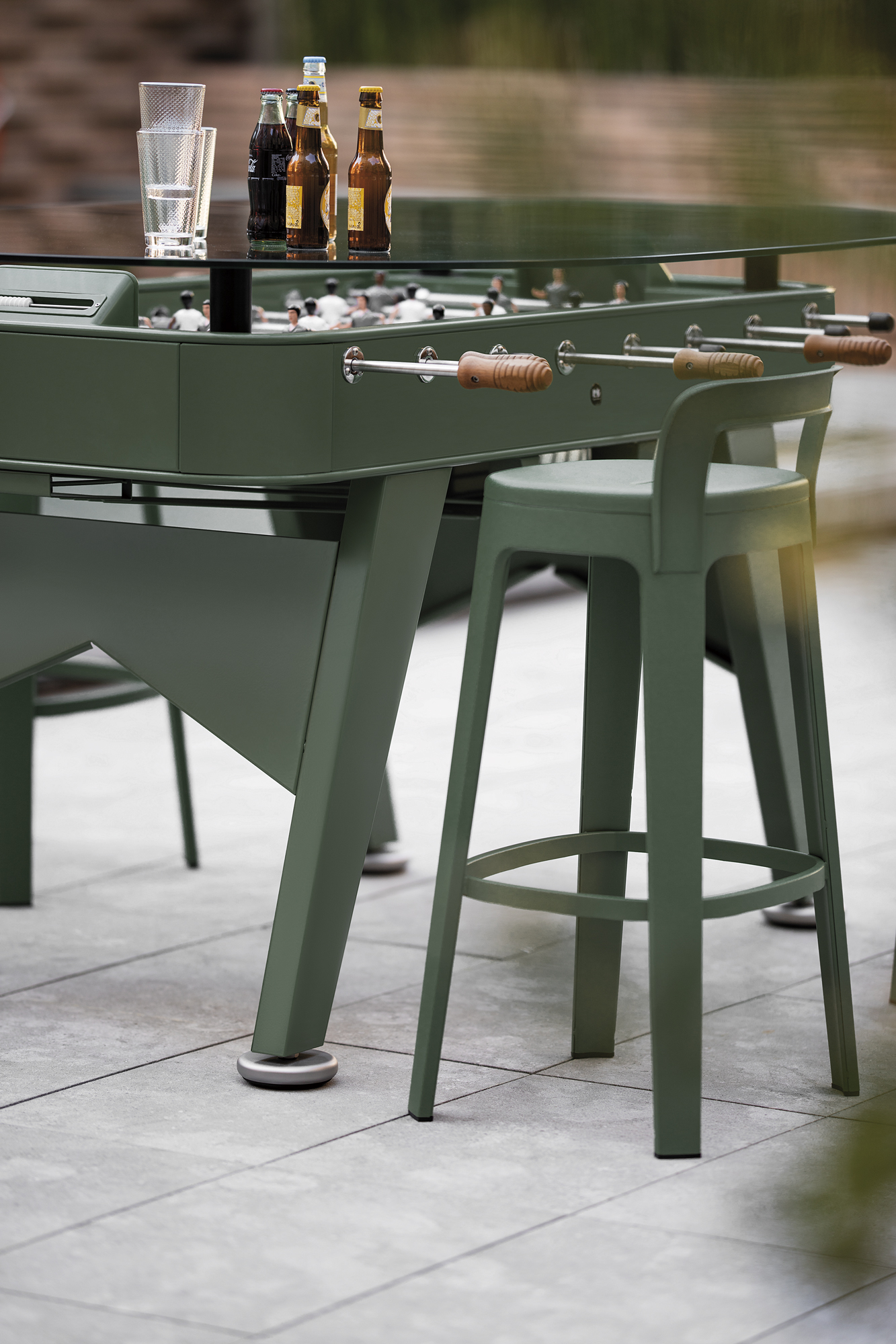 Frame finished in either Inox shot-blasted stainless steel lacquered or in steel structure with cataphoretic coating process and polyester paint in choice of colour. 1-cm-thick tempered glass top in oval or rectangular, Iroko wooden legs and handles, HPL field in choice of finish (cream, green, or black), and cast aluminium players in choice of finish or custom. All models suitable for indoor use, optional outdoor finish at additional cost, protective cover recommended when not in use outdoors.