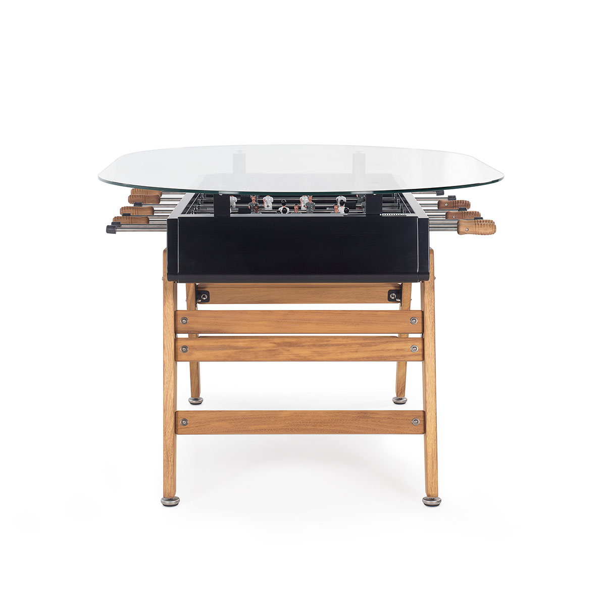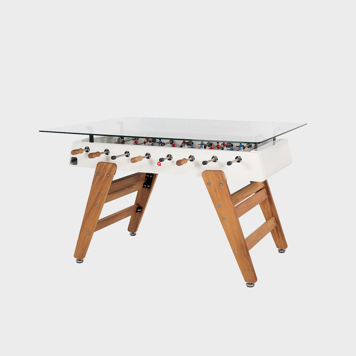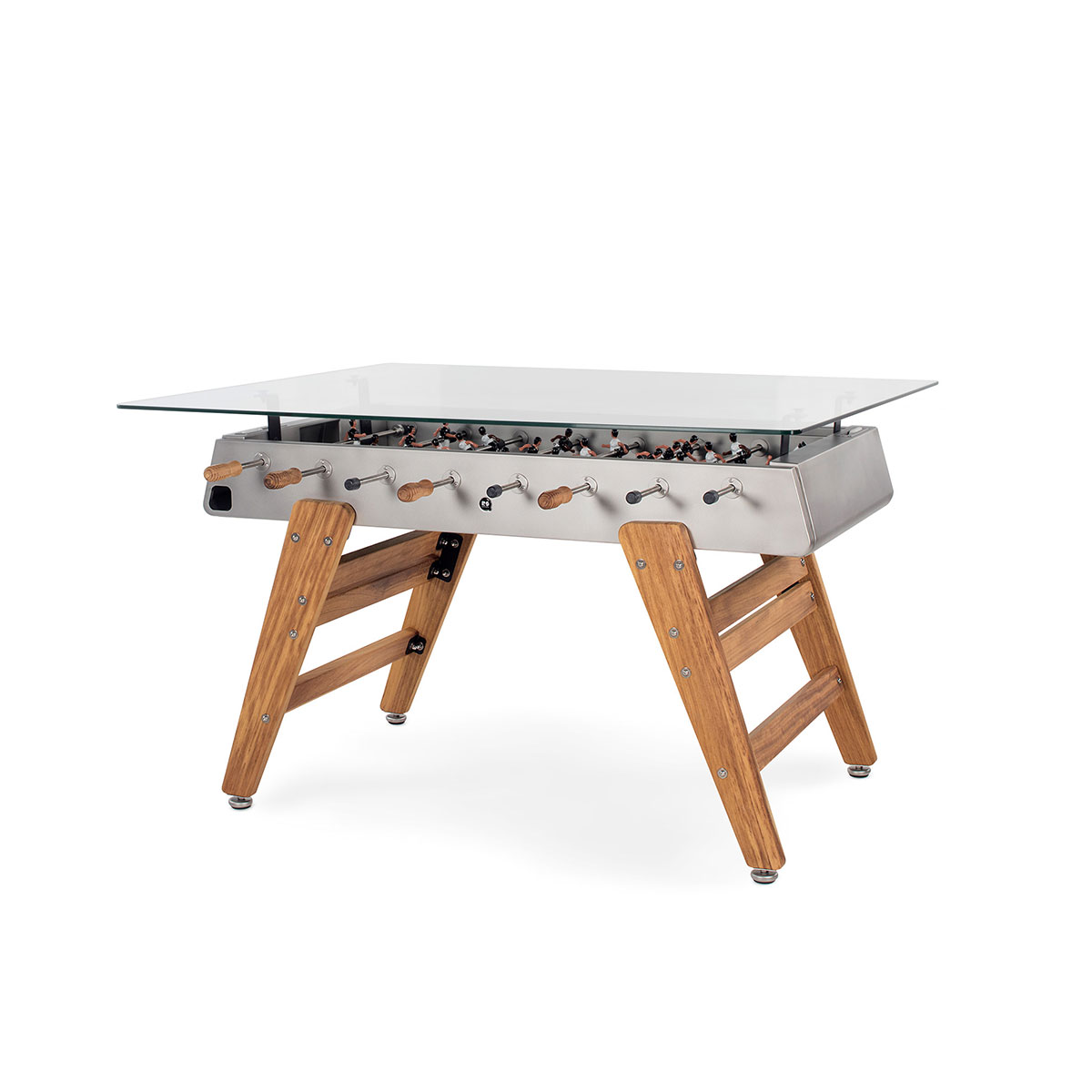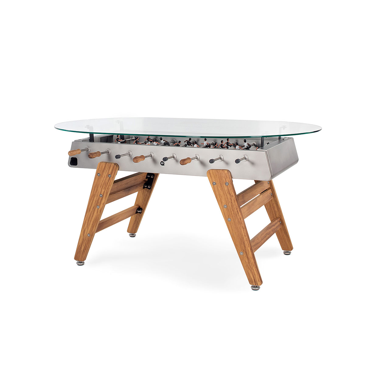 Crafted with a sturdy steel structure and solid Iroko wood legs, the RS3 Wood Dining is built for durability and timeless appeal. Its spacious tabletop transforms the foosball table into a sleek dining or conference table, while the integrated foosball setup remains ready for play at a moment’s notice. Designed for both indoor and outdoor use, it offers a customisable experience with team player options, handle styles, and field finishes.