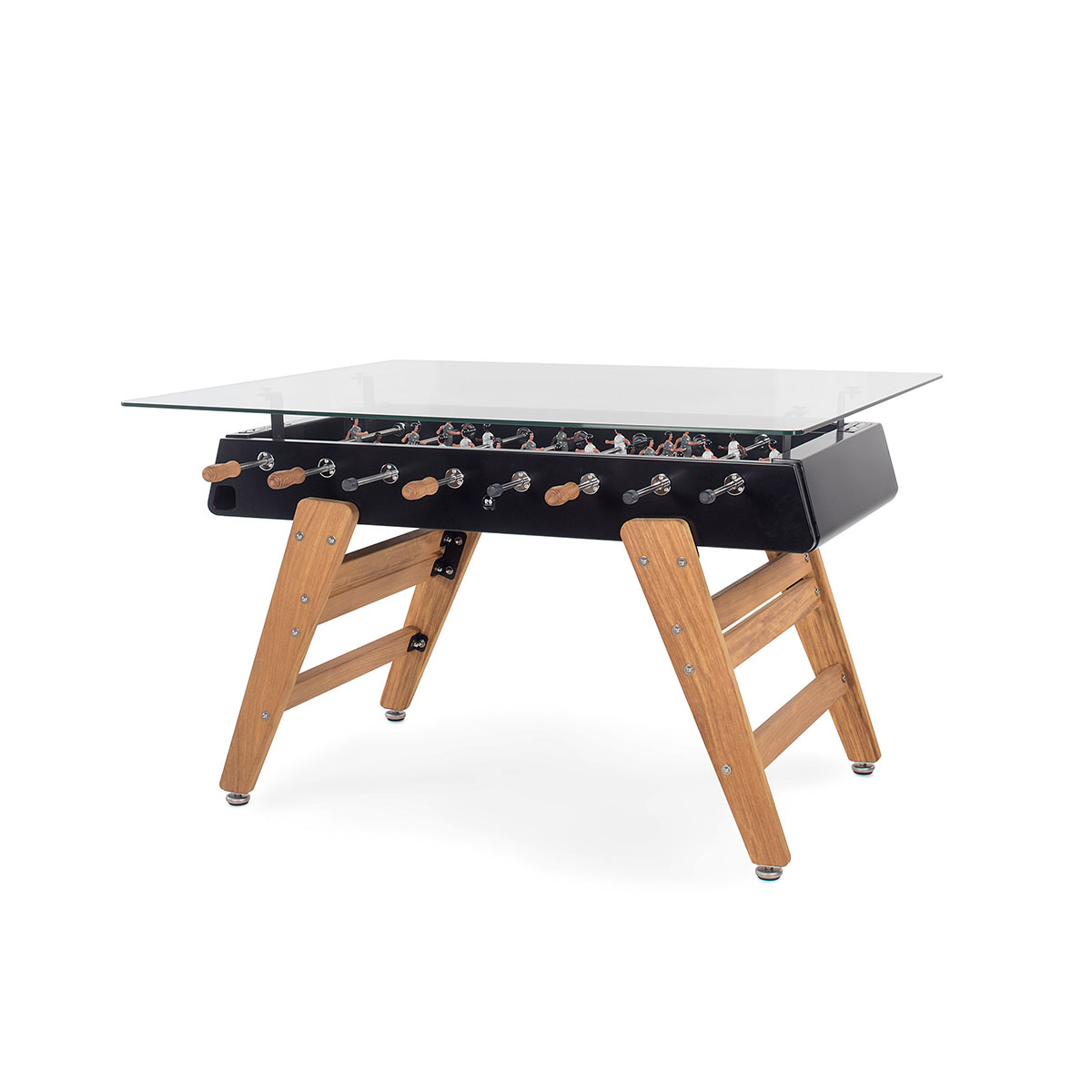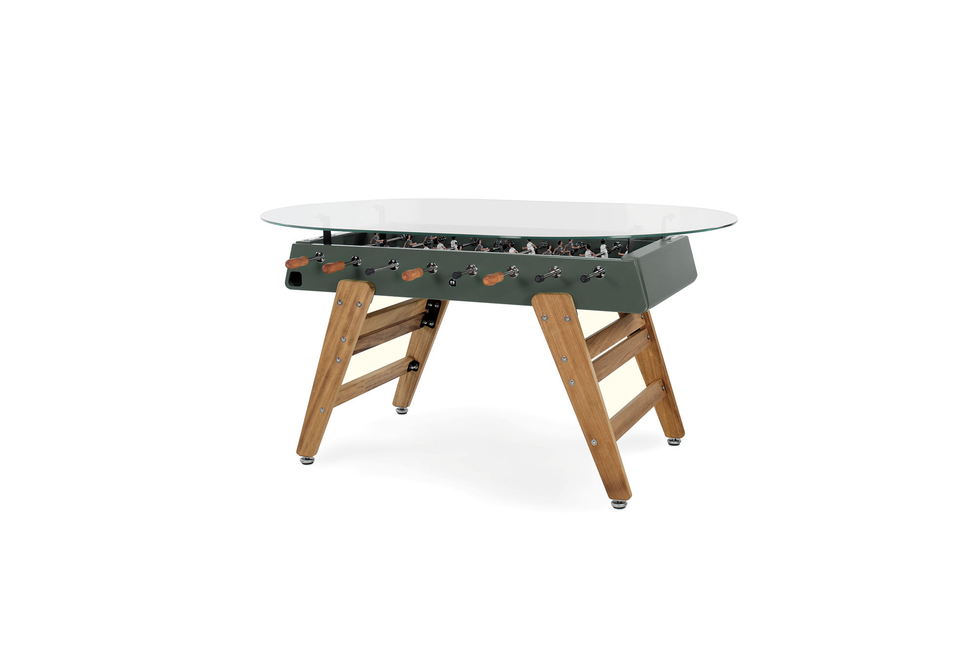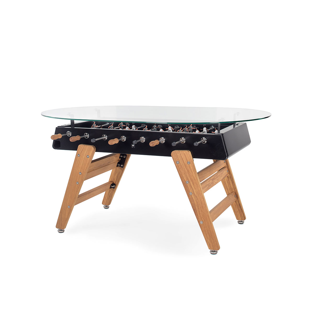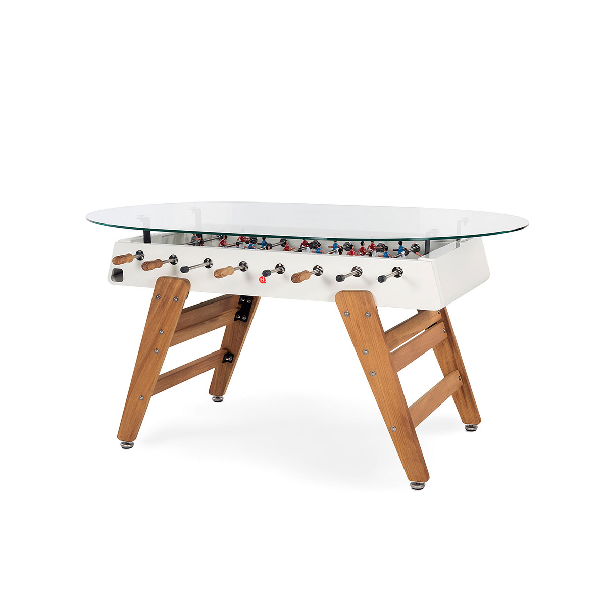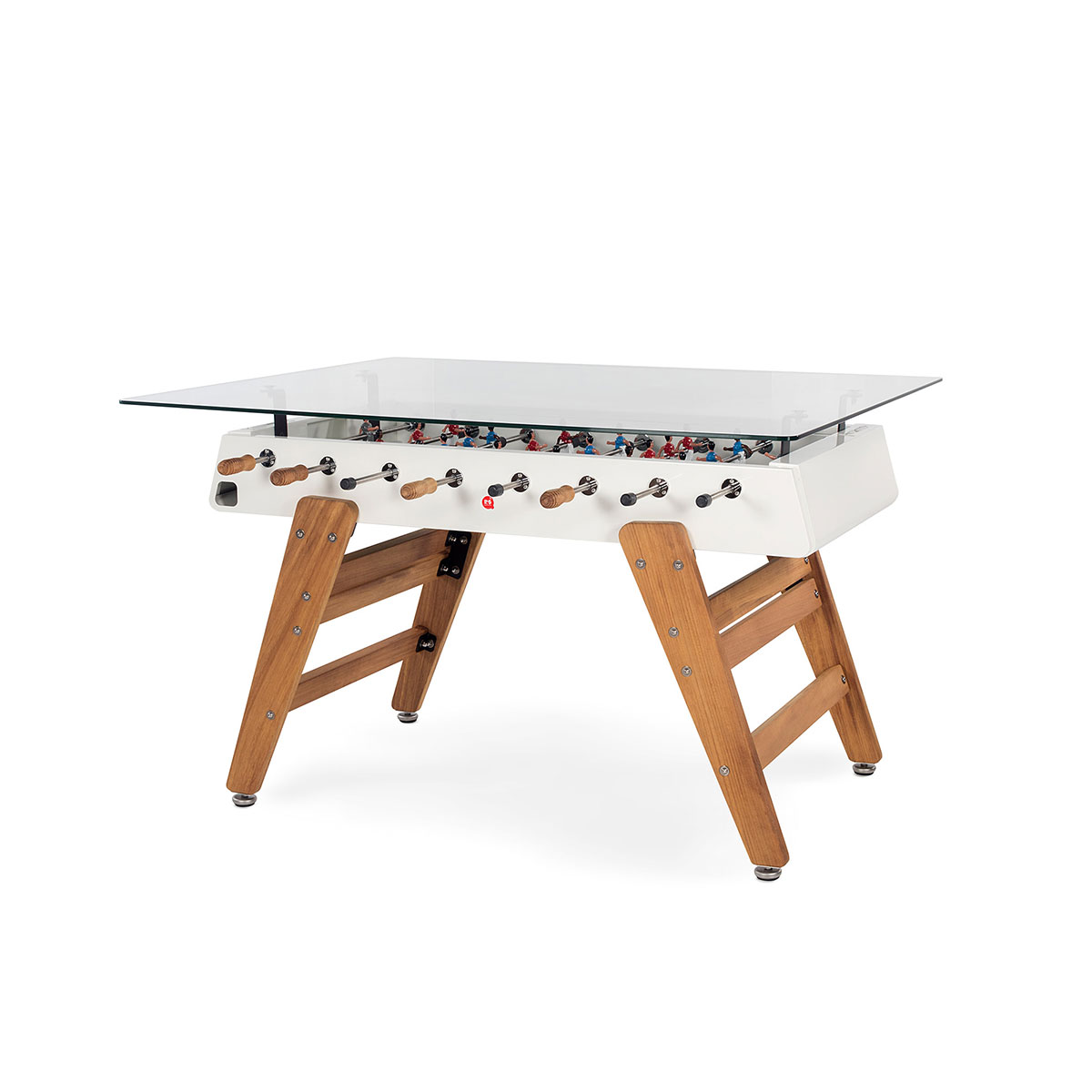 Crafted with a sturdy steel structure and solid Iroko wood legs, the RS3 Wood Dining is built for durability and timeless appeal. Its spacious tabletop transforms the foosball table into a sleek dining or conference table, while the integrated foosball setup remains ready for play at a moment’s notice. Designed for both indoor and outdoor use, it offers a customisable experience with team player options, handle styles, and field finishes.
