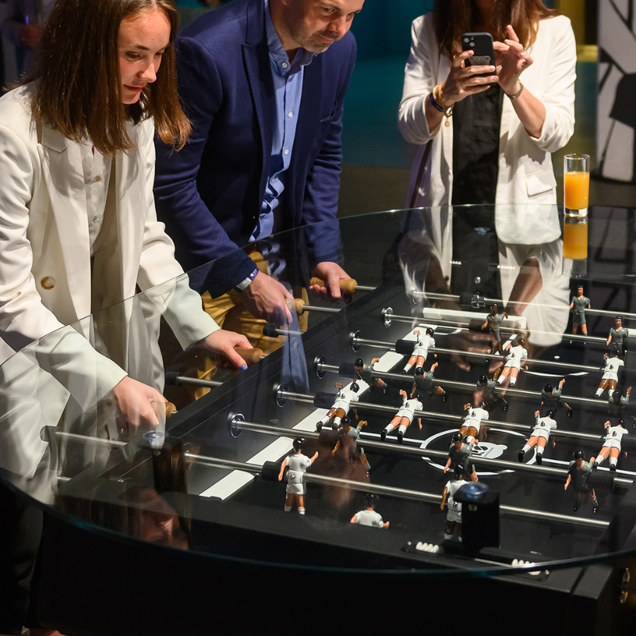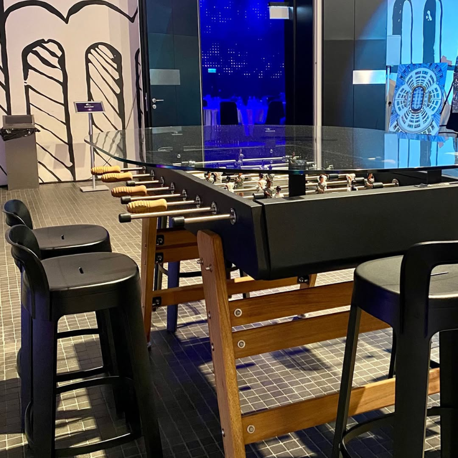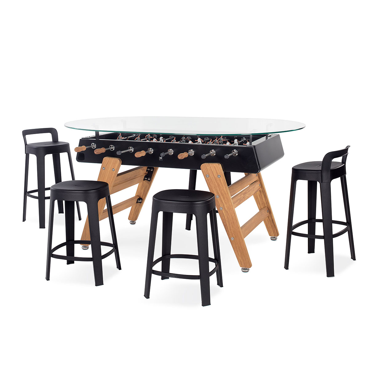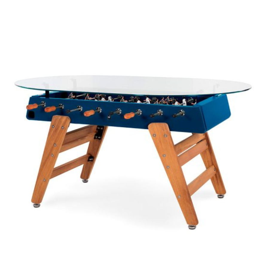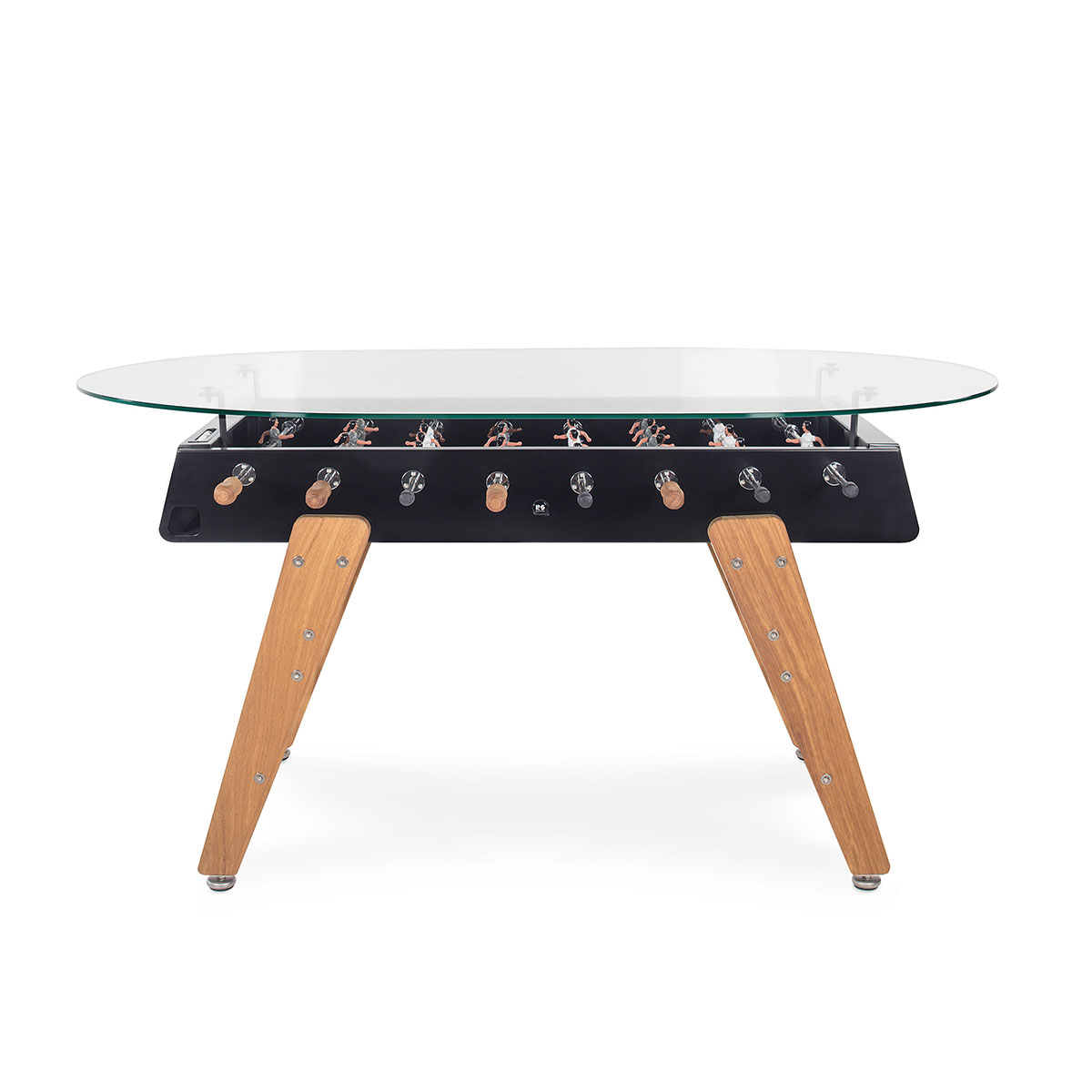 Crafted with a sturdy steel structure and solid Iroko wood legs, the RS3 Wood Dining is built for durability and timeless appeal. Its spacious tabletop transforms the foosball table into a sleek dining or conference table, while the integrated foosball setup remains ready for play at a moment’s notice. Designed for both indoor and outdoor use, it offers a customisable experience with team player options, handle styles, and field finishes.