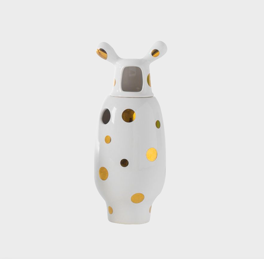 Crafted from glazed stoneware, each piece in the collection features a timeless white finish adorned with 24-carat gold-plated details, adding a layer of luxury to its bold sculptural design. The result is a vase that exudes sophistication while retaining Hayon’s signature playful aesthetic.