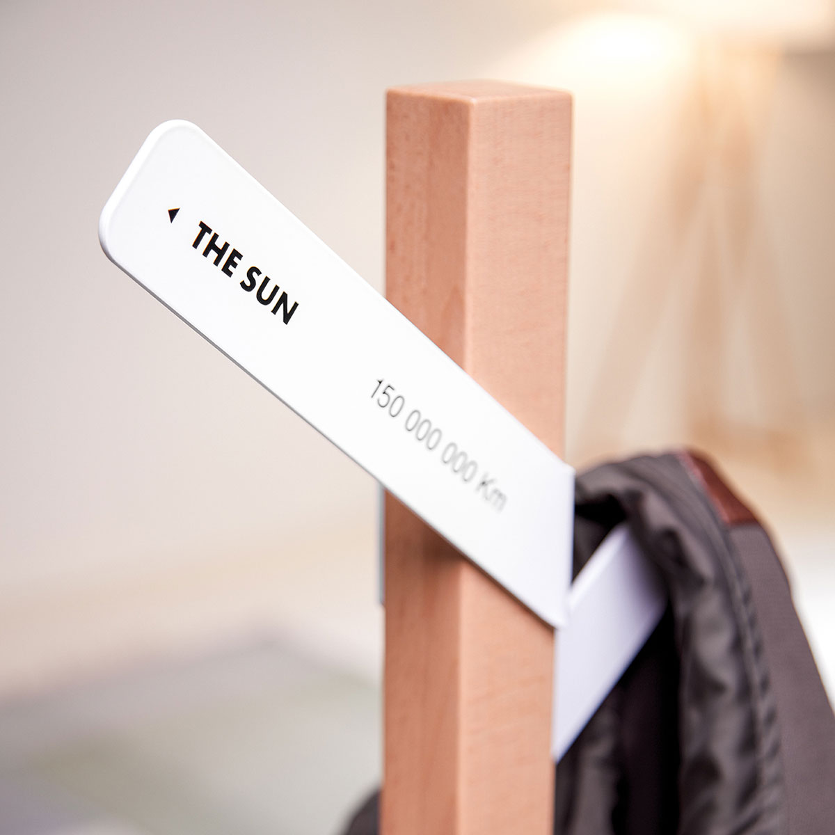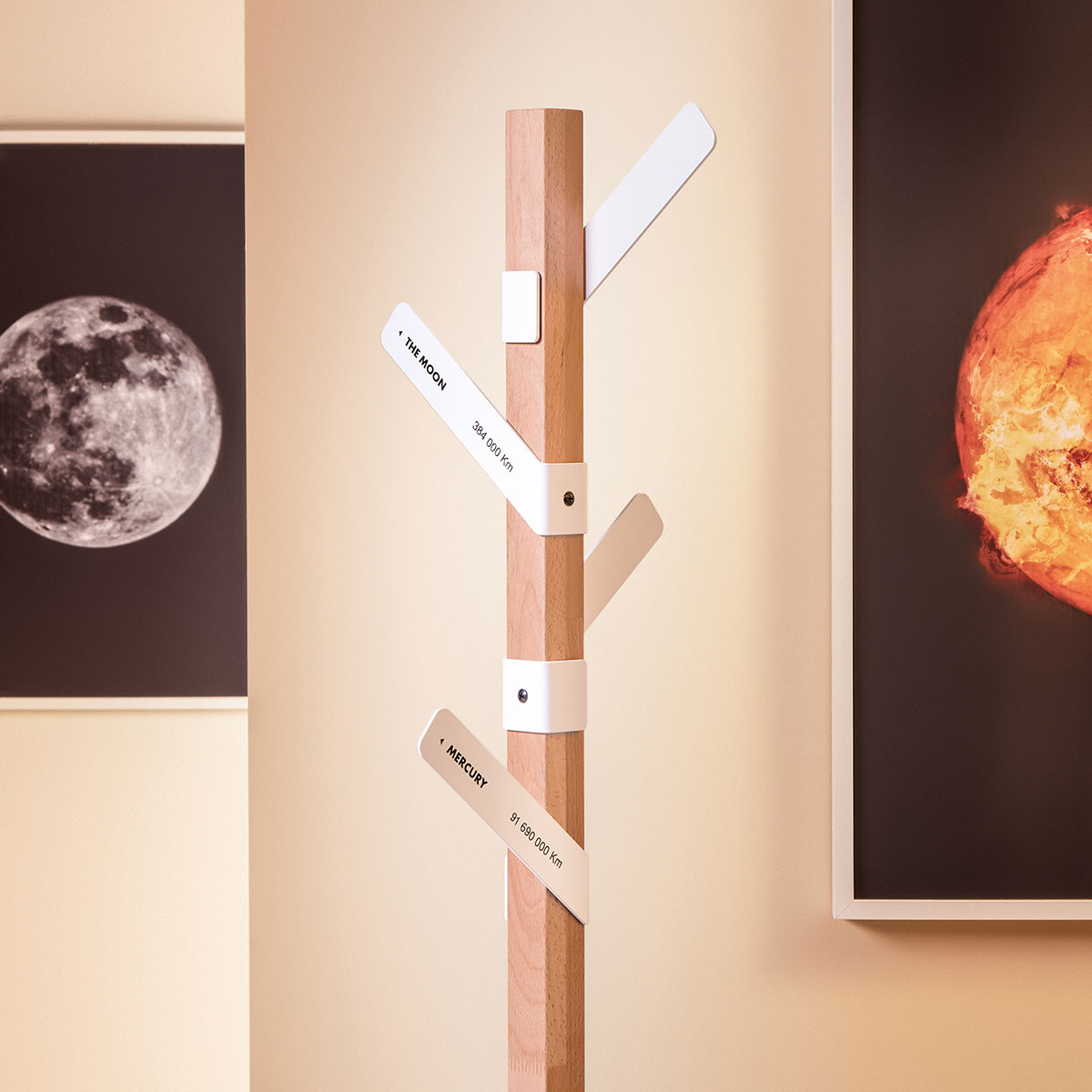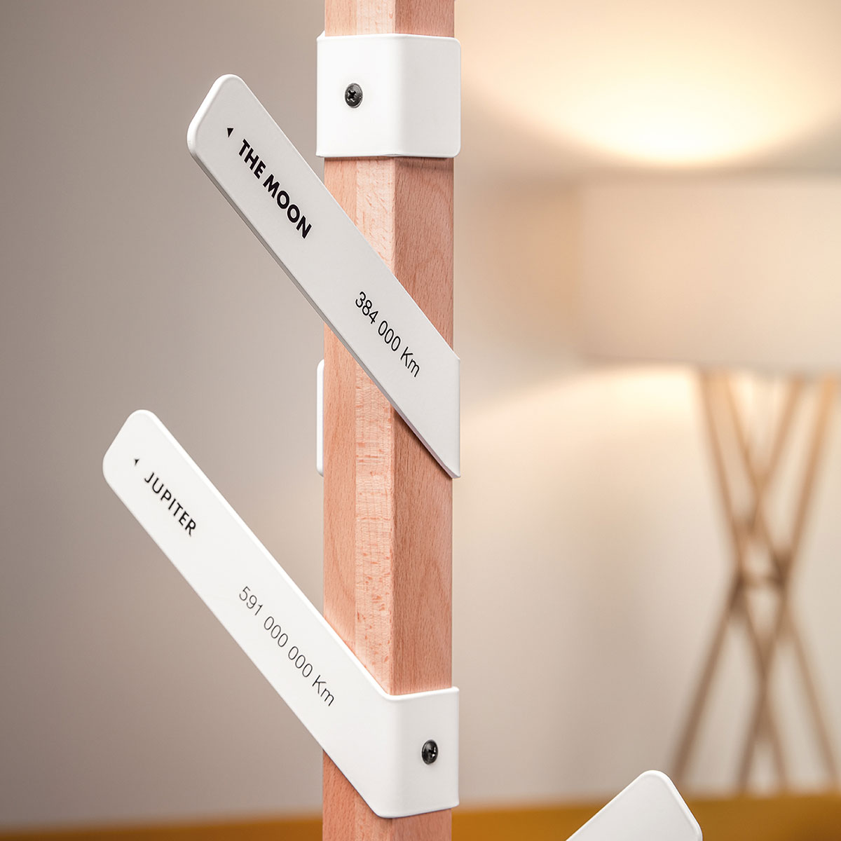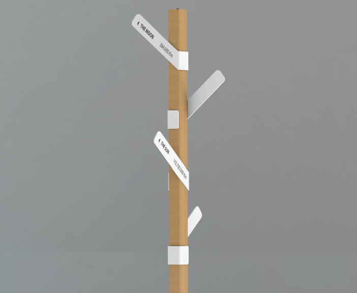 What if, besides a coat stand it’s a signpost. Made from wood with four metal hooks pointing to four different places: The Moon, the Sun, Jupiter and Mercury are the preferred destinations of the standard model, but you can customise them with whatever you want. It is ideal in any environment.