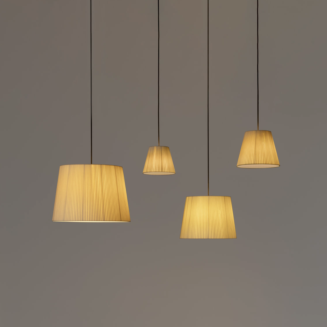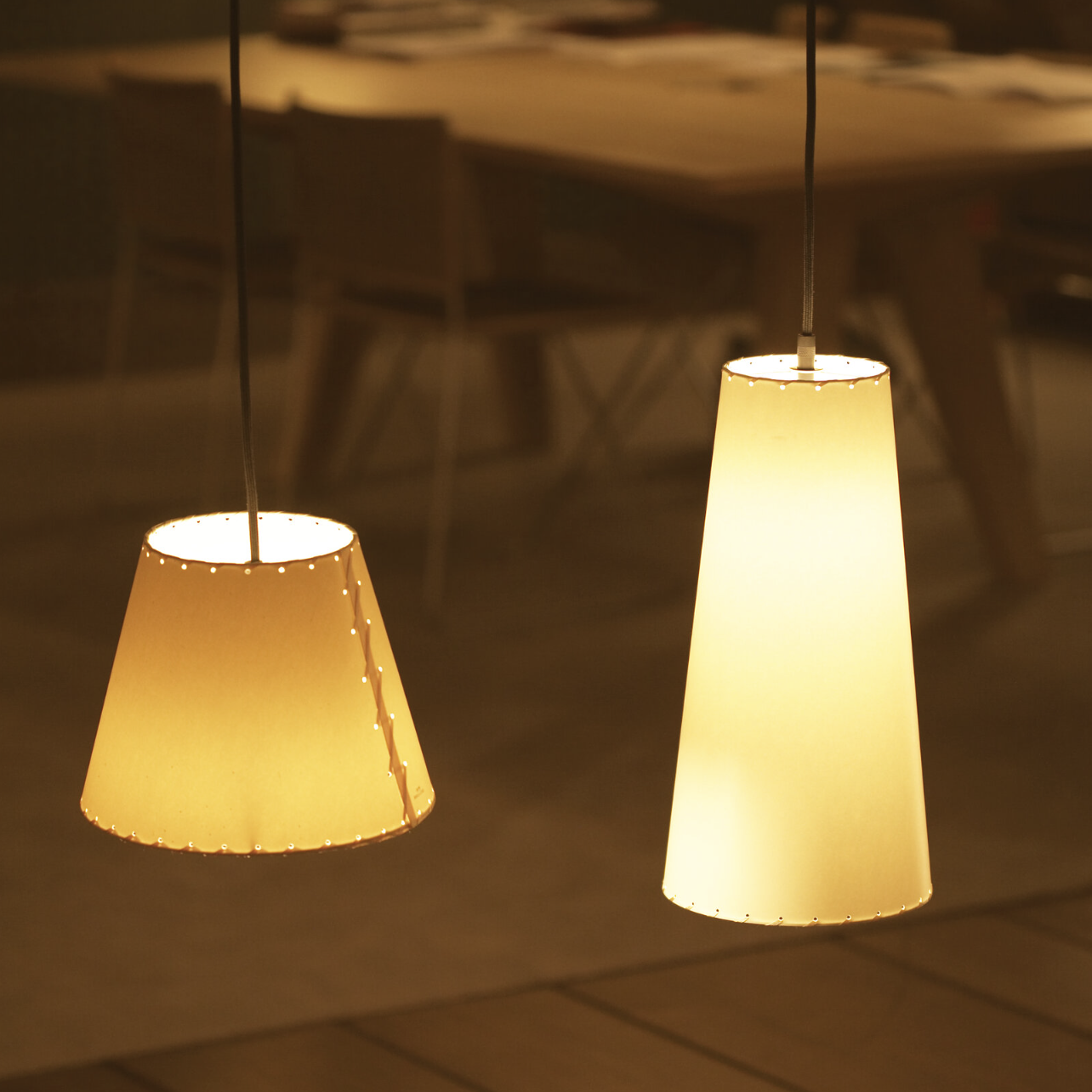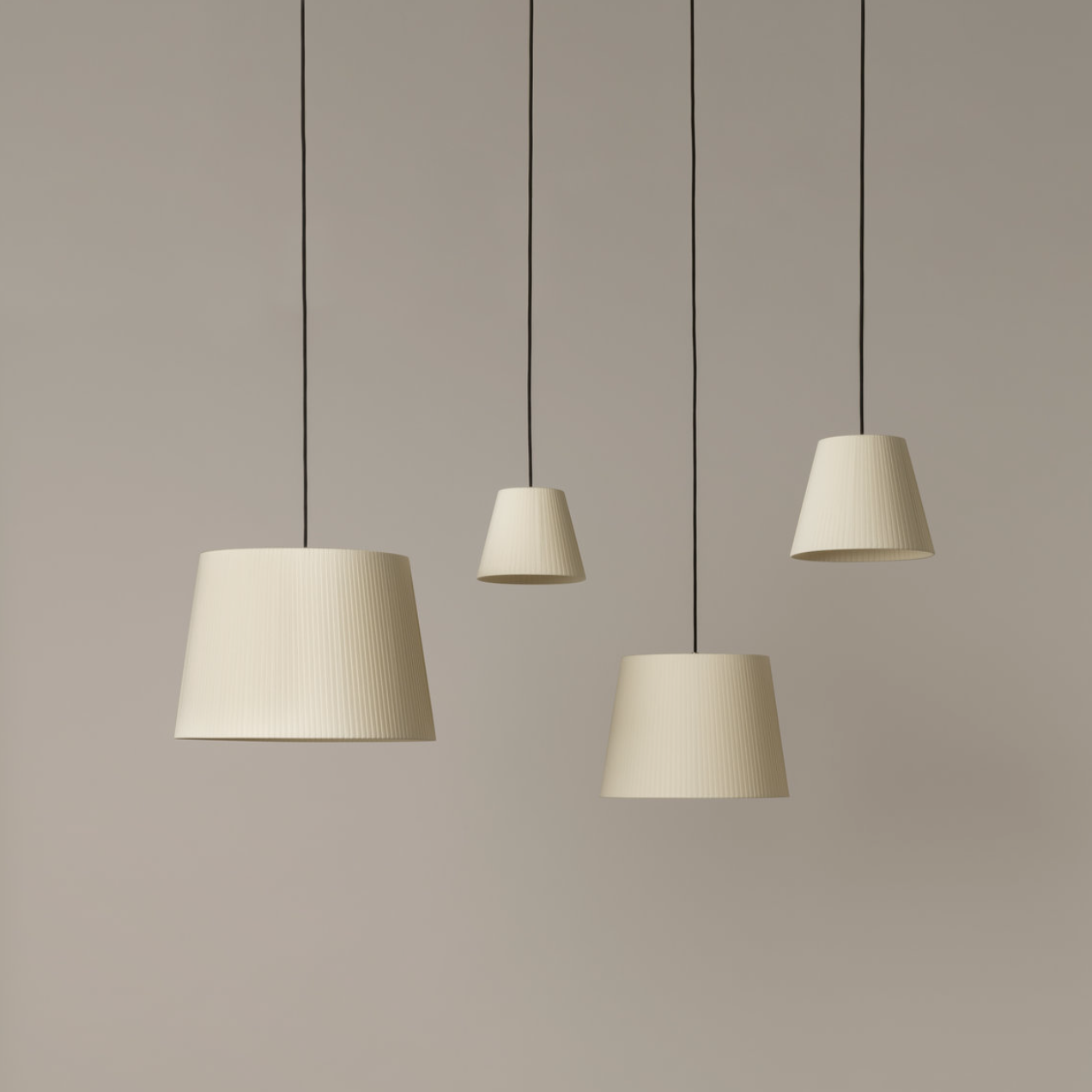 The conical screen group has multiple finishes and sizes. It is made up of four screen sizes: PT1, MT1, GT1 and GT3, and has three different material options: cardboard, ribbon or linen. Sísísí is a versatile system that adapts to the different needs of the space, with screens of good proportion and different aesthetics