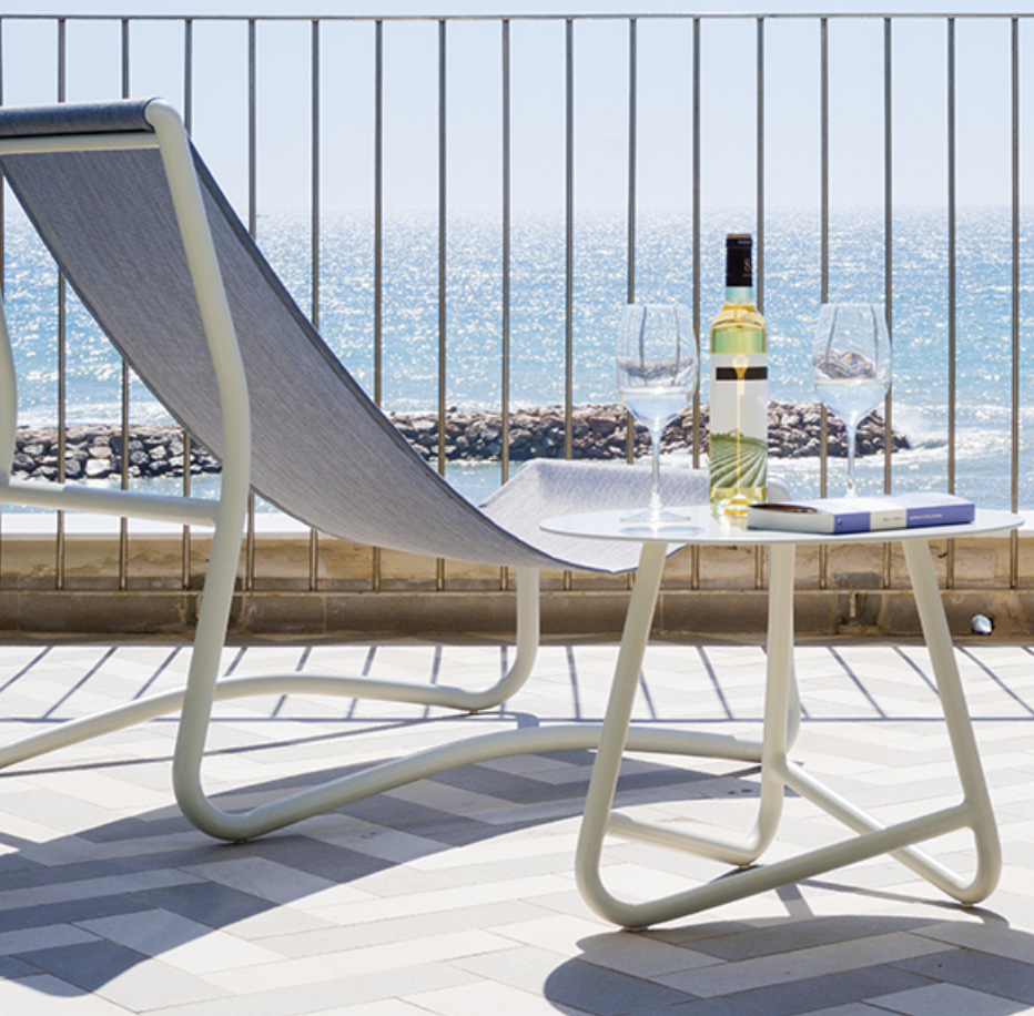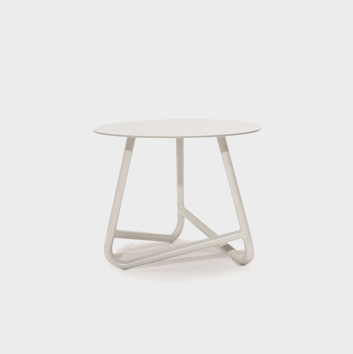 Side table with a tubular aluminium base and a 5 mm thick table top made of aluminium sheet with a lacquer finish. Suitable for indoor or outdoor use. Available in two standard colours: dark grey and light grey.