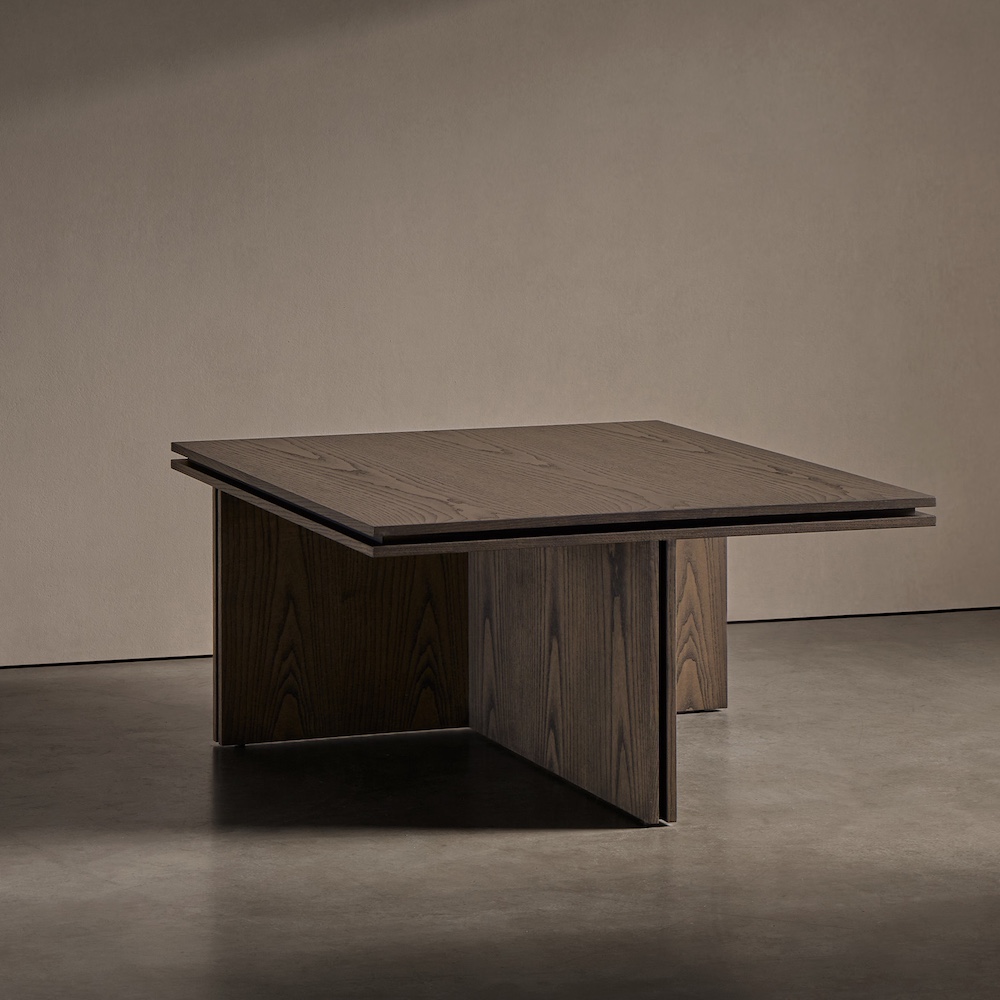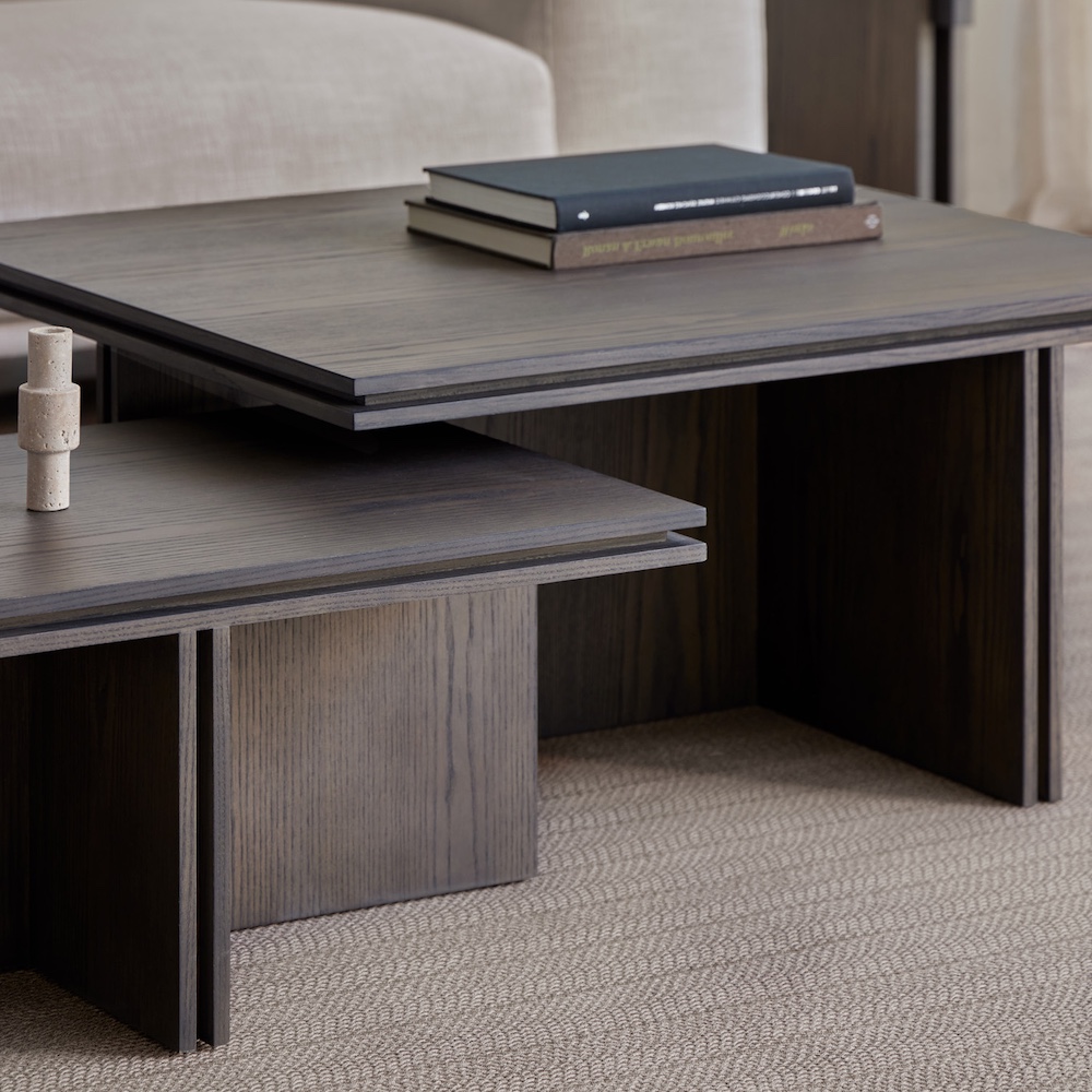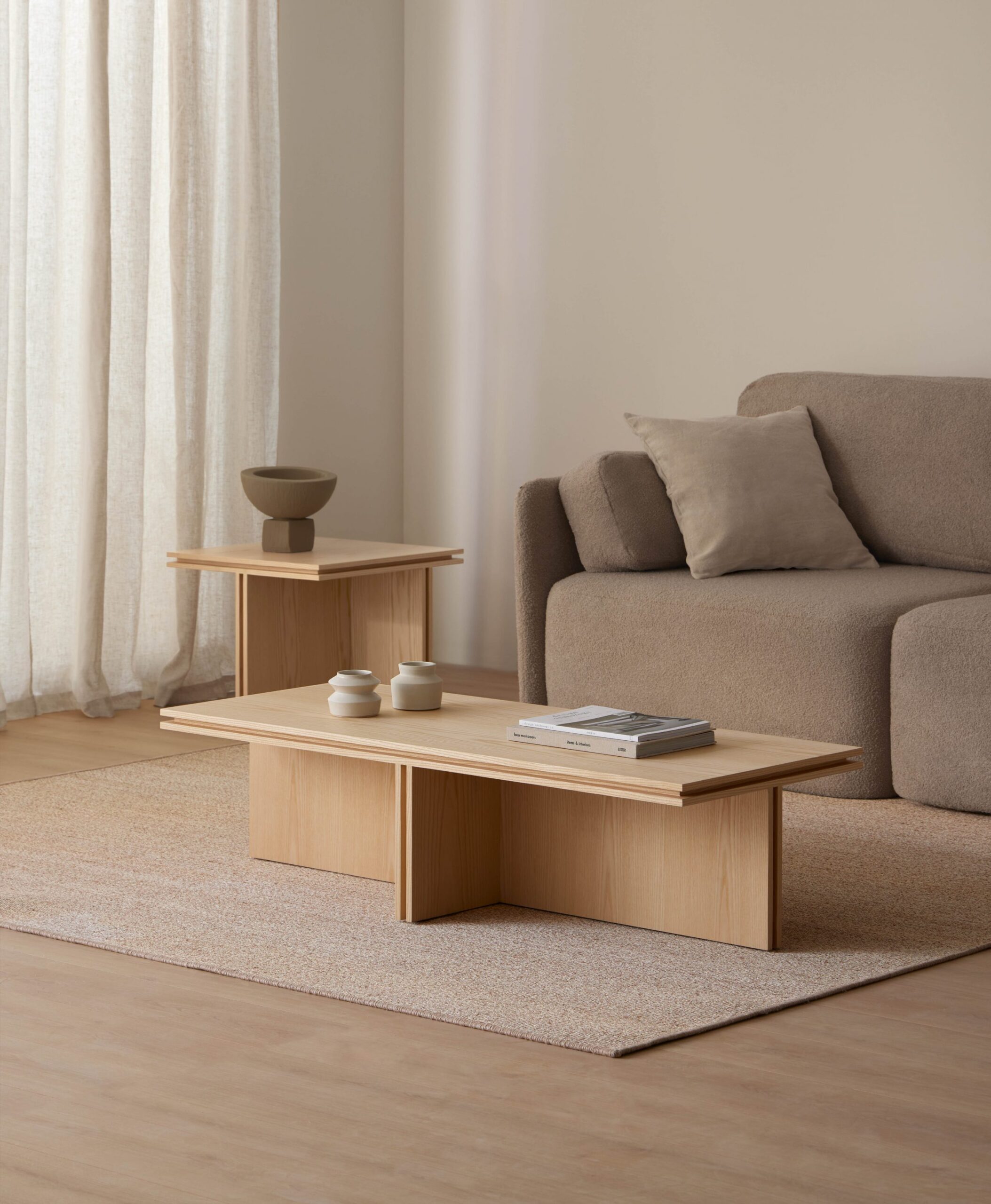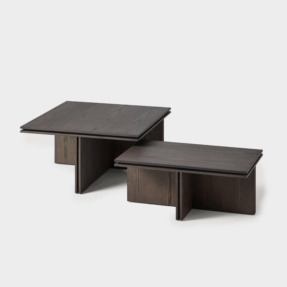 Top and structure in ash veneered MDF. The top and structure are made of double boards with a separation between them that has a 2cm offset from the border. The size and shape of the tables makes it possible to place them both individually and superposing, creating sets.