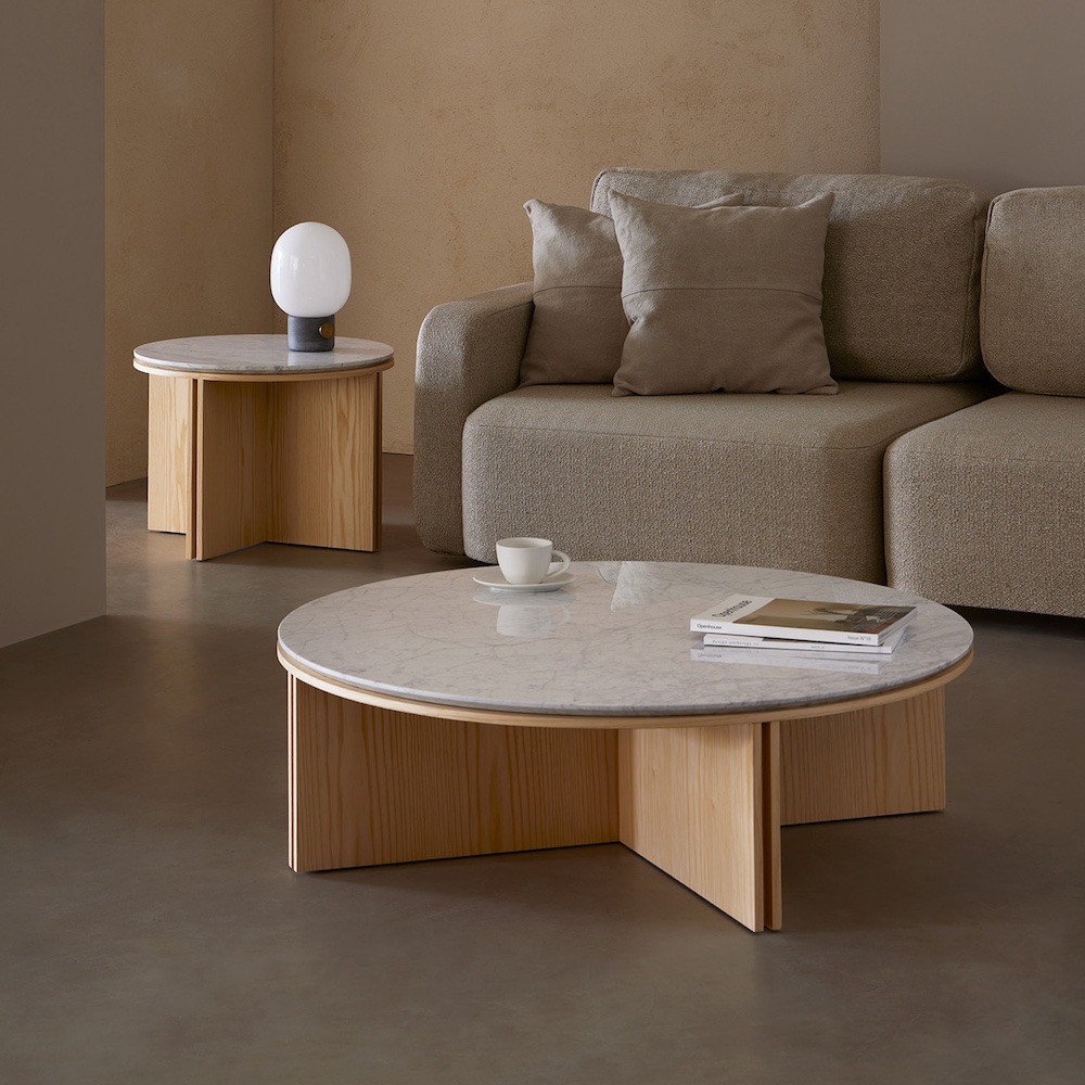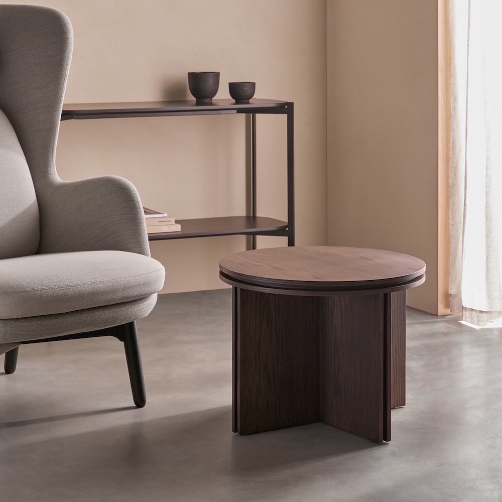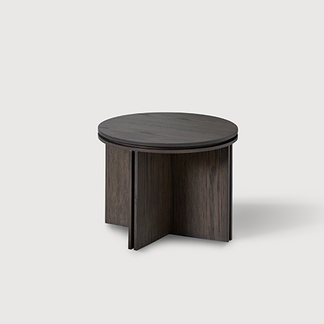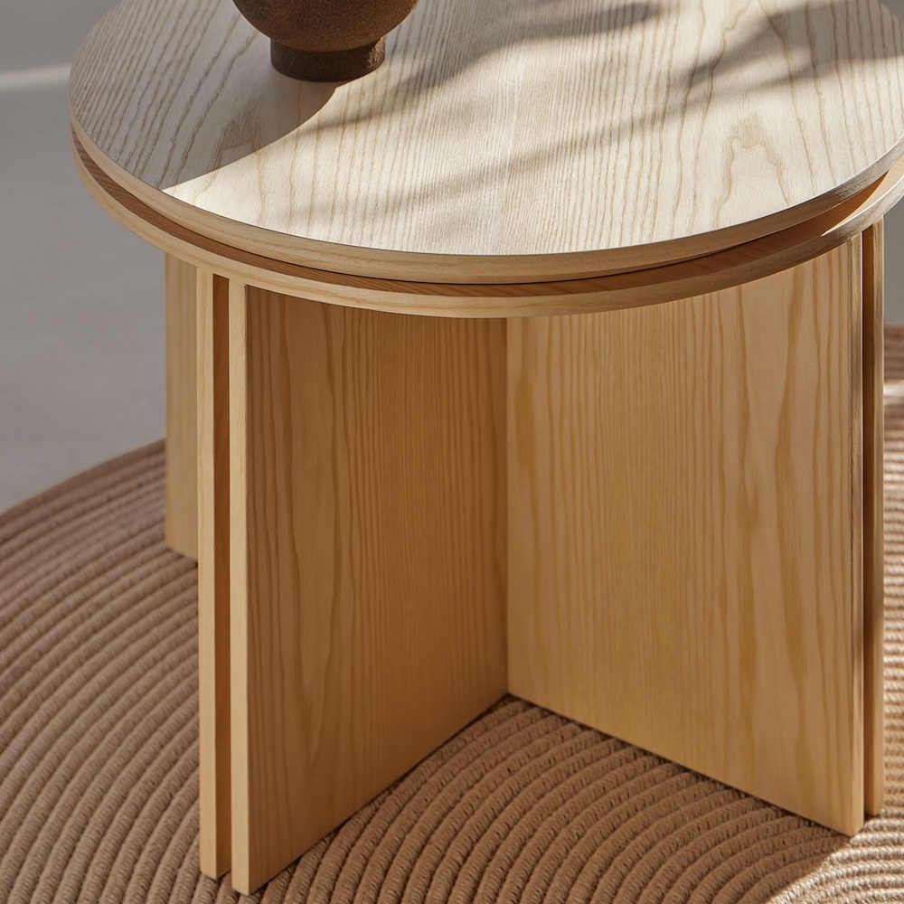 Top and structure in ash veneered MDF. The top and structure are made of double boards with a separation between them that has a 2cm offset from the border. The size and shape of the tables makes it possible to place them both individually and superposing, creating sets.