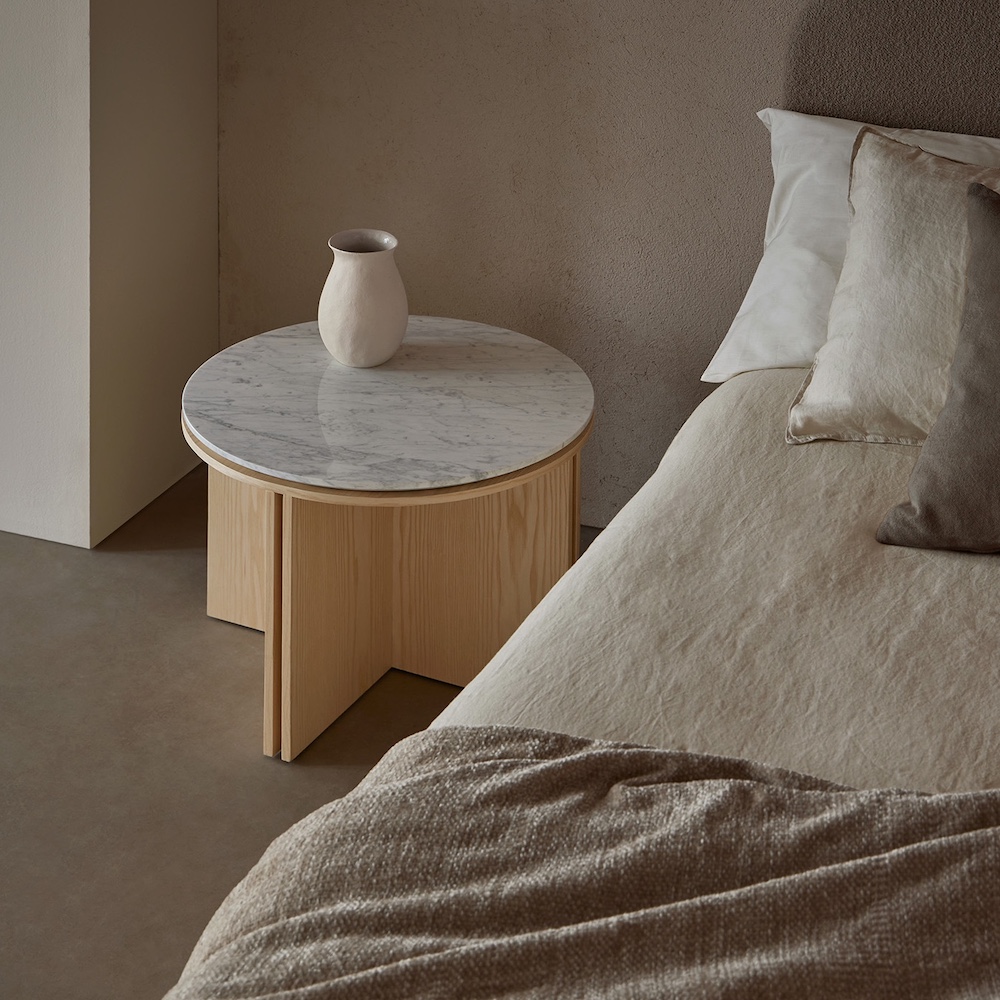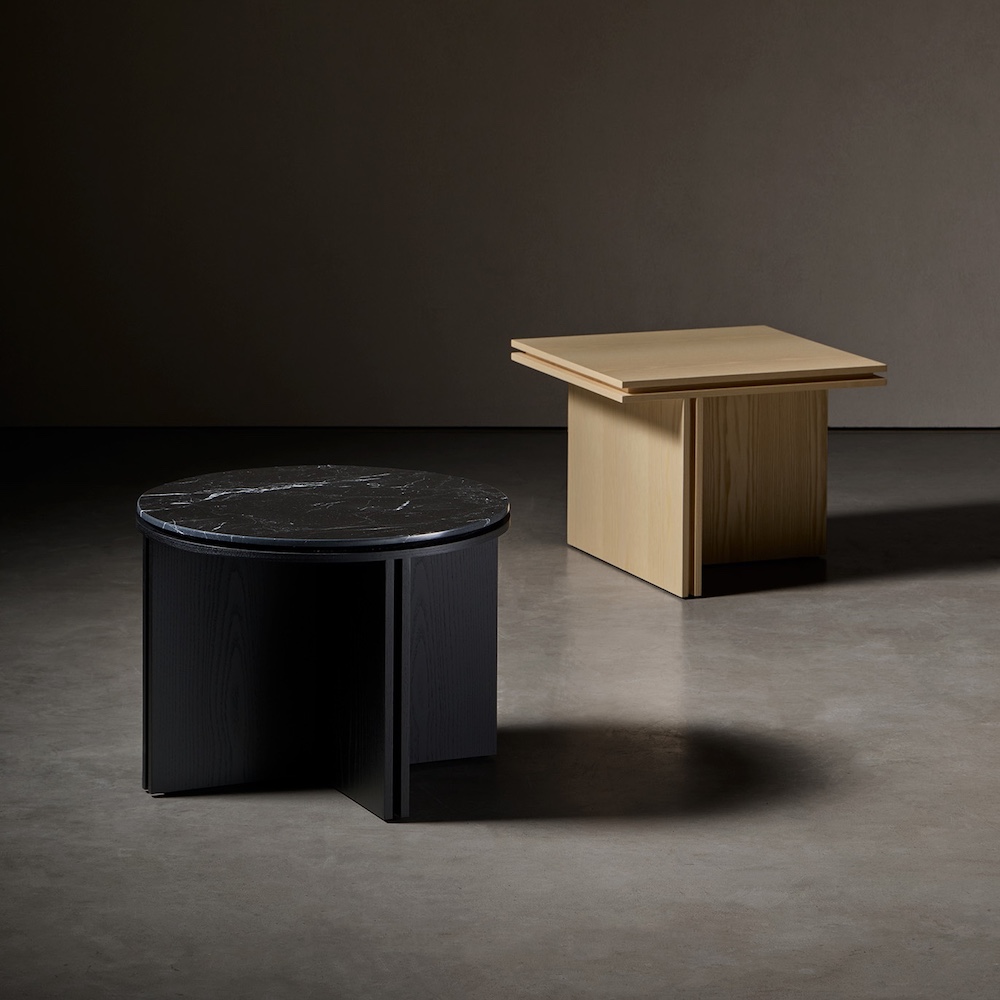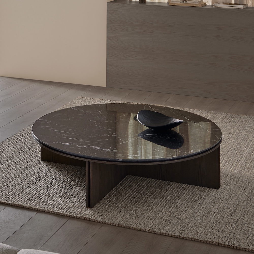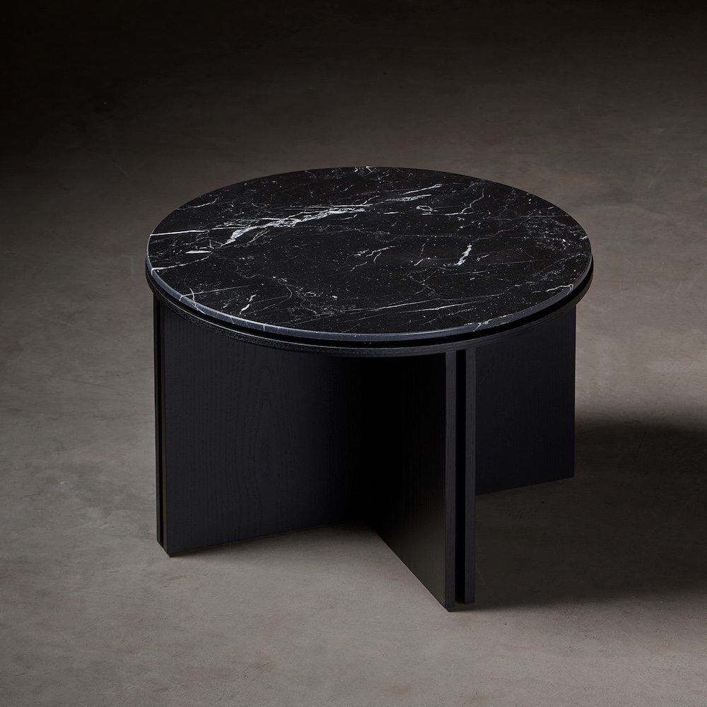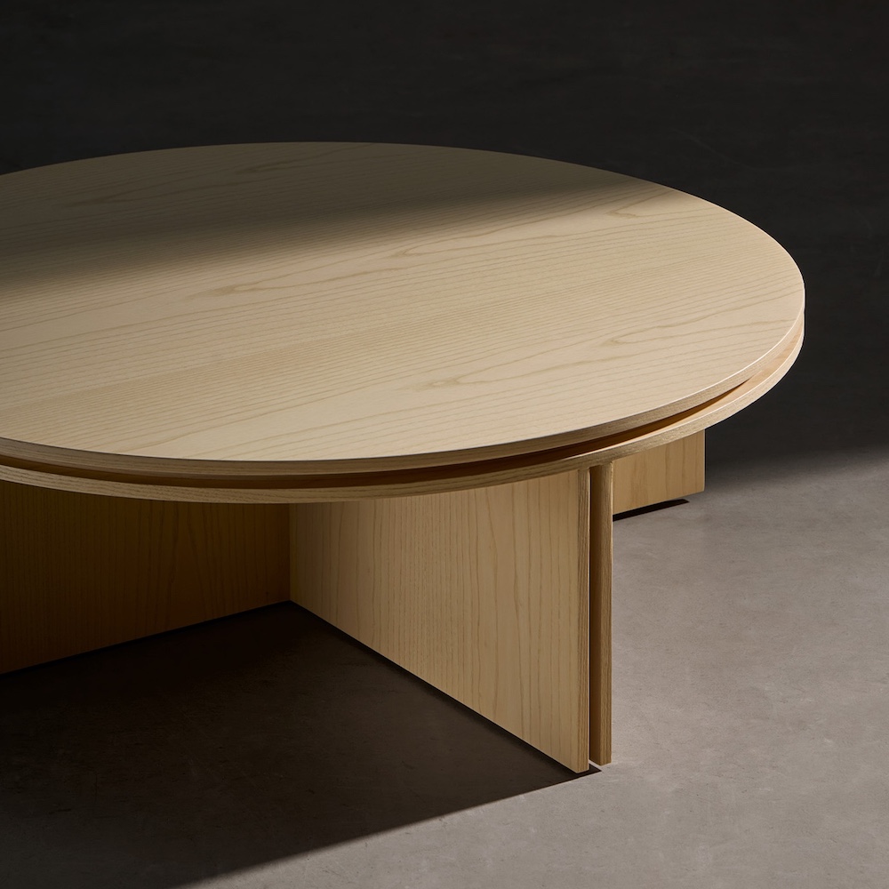 Collection of tables, meticulously handcrafted, are made from MDF boards veneered in ash wood. The symmetry of the geometry is complemented by the rich texture of the ash, which is available in natural, ash, toasted, black, green or blue. The Slot Round top is also available in travertine and white and black marble stone.