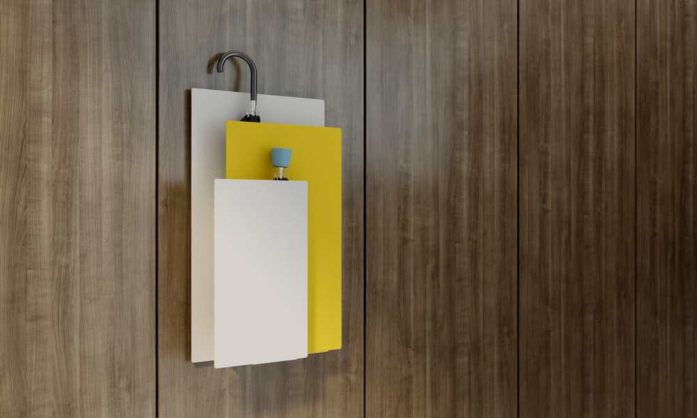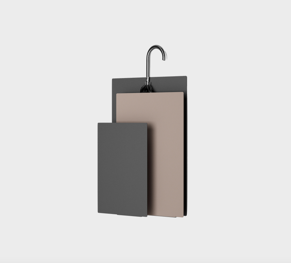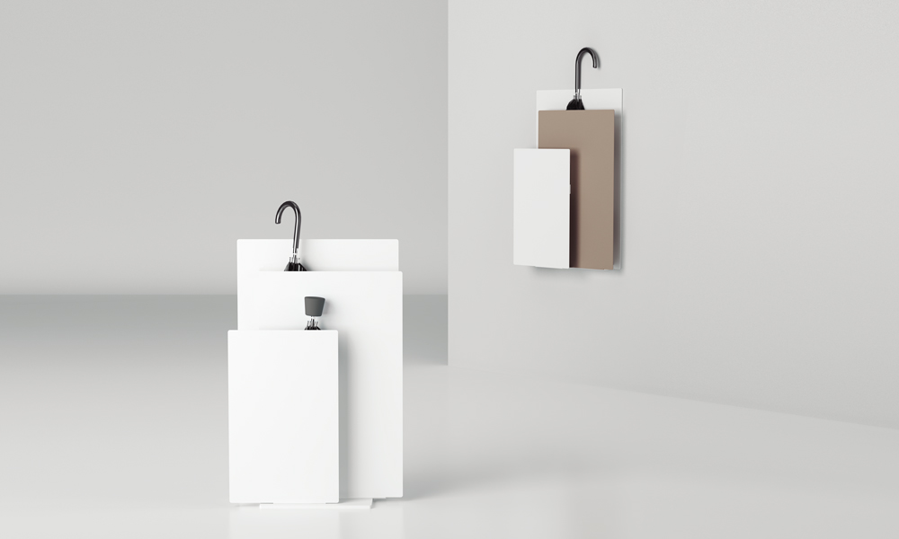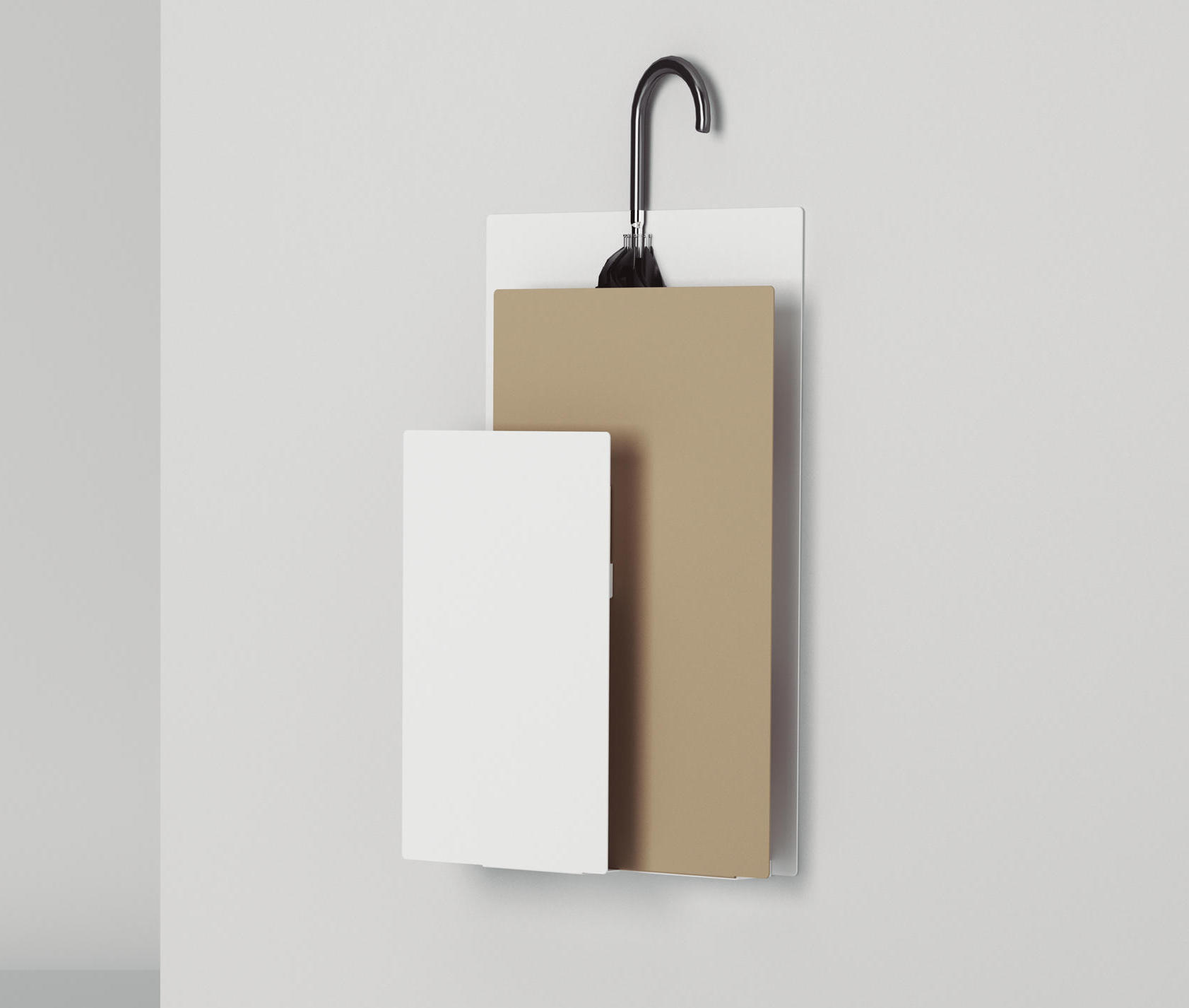 Umbrella stand composed by three painted steel panels thought-out for either big or small umbrellas.