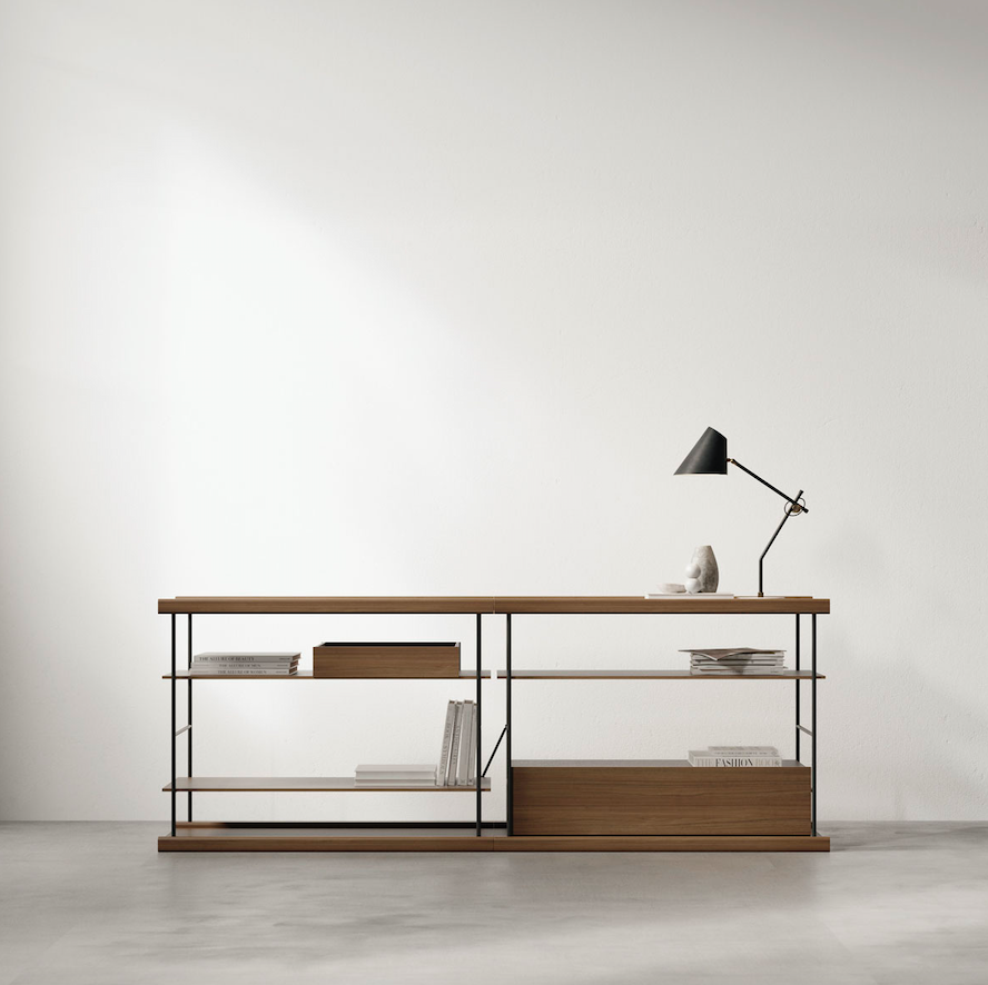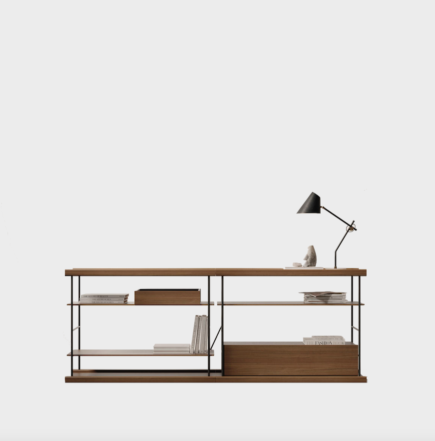 Sideboard with lacquered metal structure, and timber top, base, shelves and drawer. Includes one module 1100w x 830h mm with two shelves, one open box 480w x 110h mm and one module 1100w x 830h mm with one drawer and one shelf. For more custom options, please contact us.