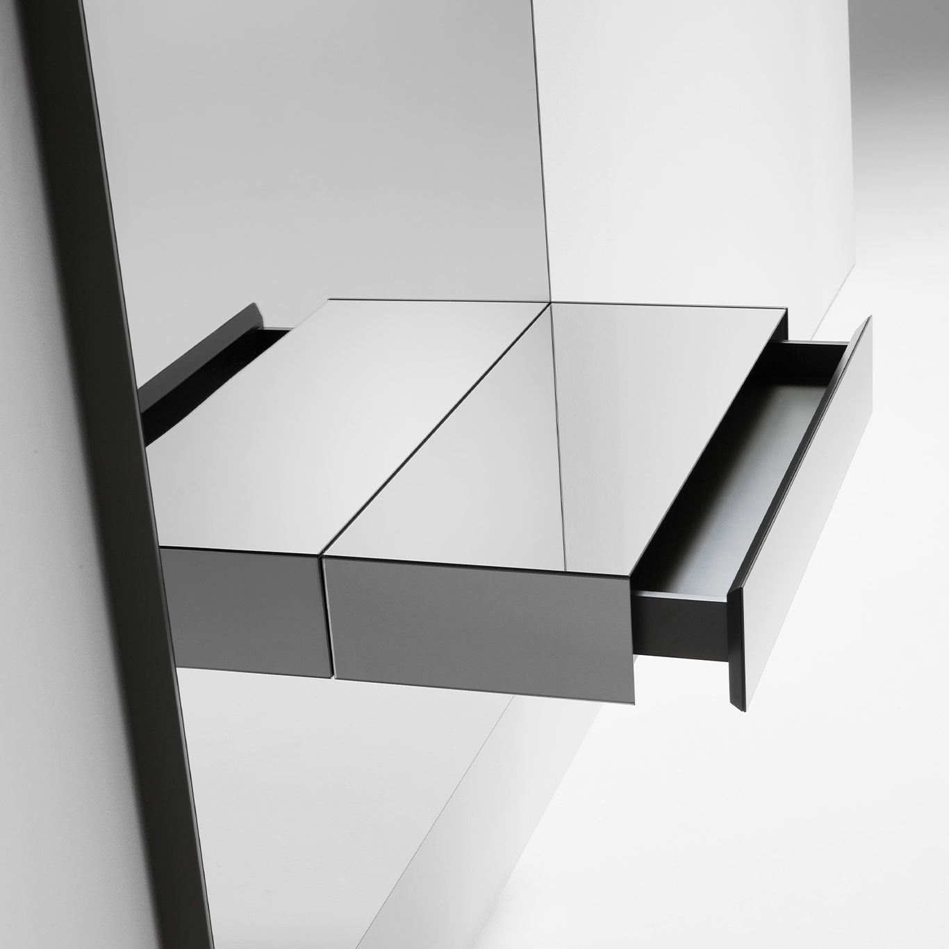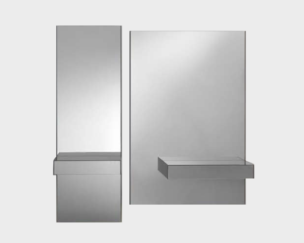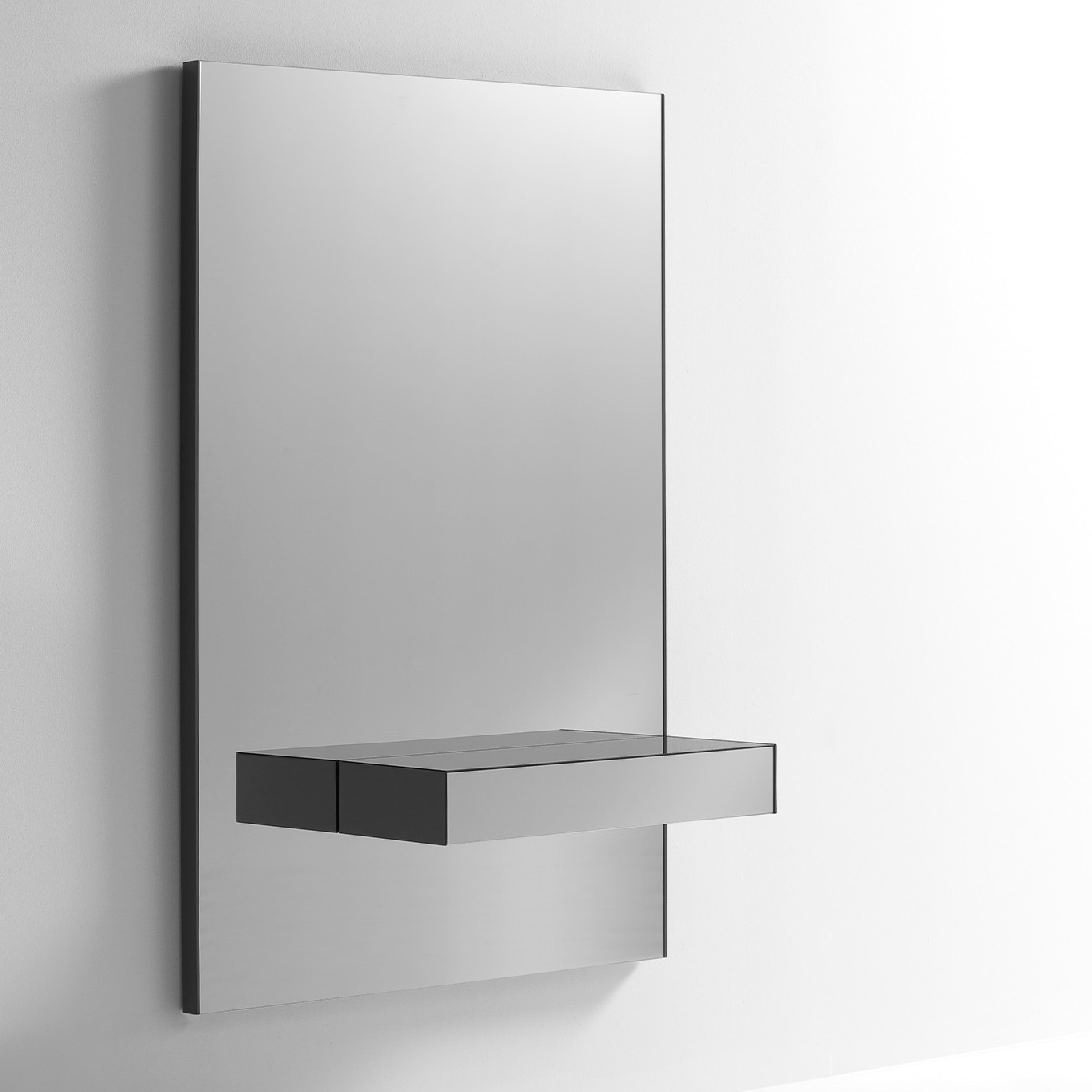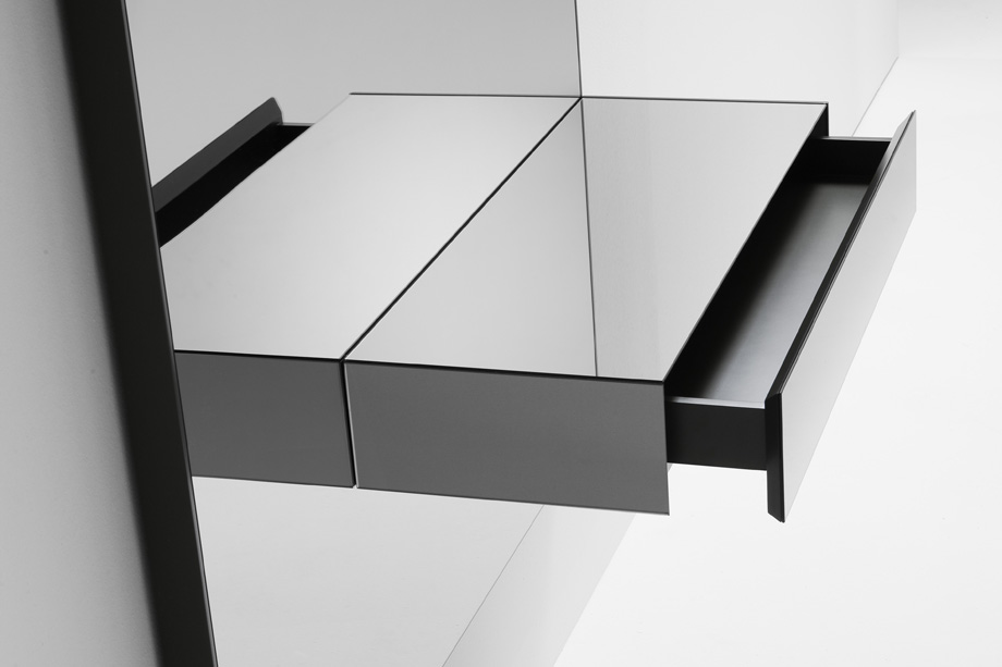 A collection of consoles comprising a back panel with a smoke grey mirror and a drawer in the same material. Optionally, the base of the drawer can be fitted with LED lights for indirect lighting. Available in 2 versions with different back panel sizes and drawer positions.