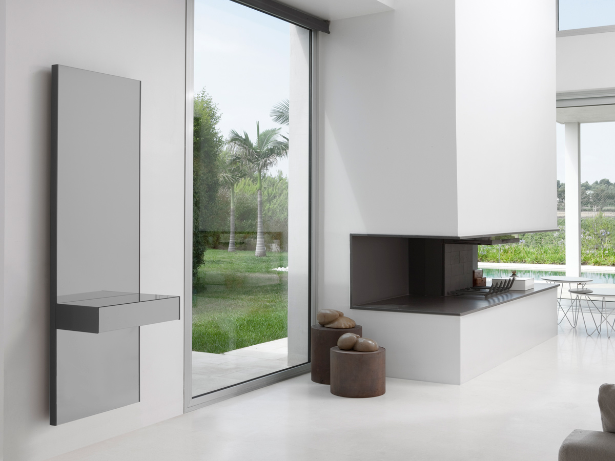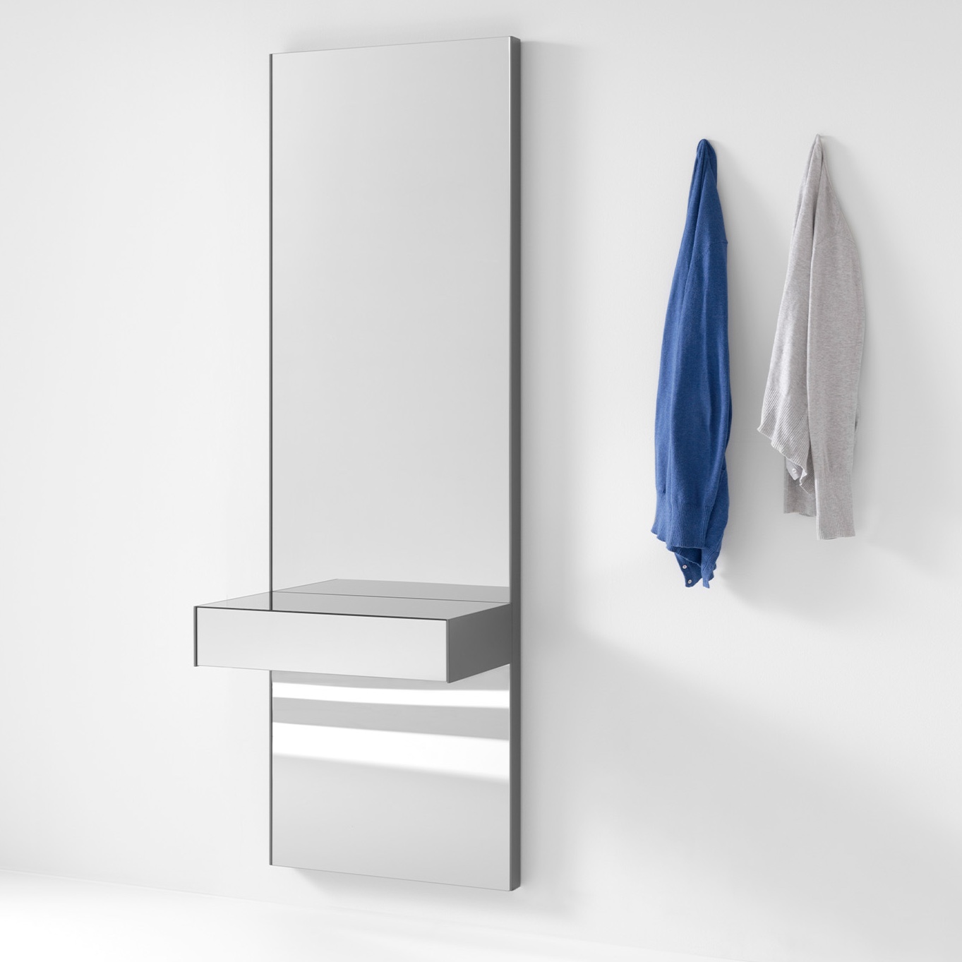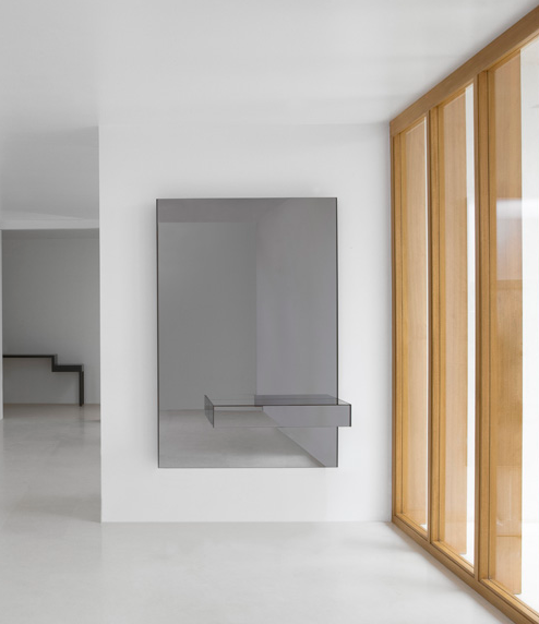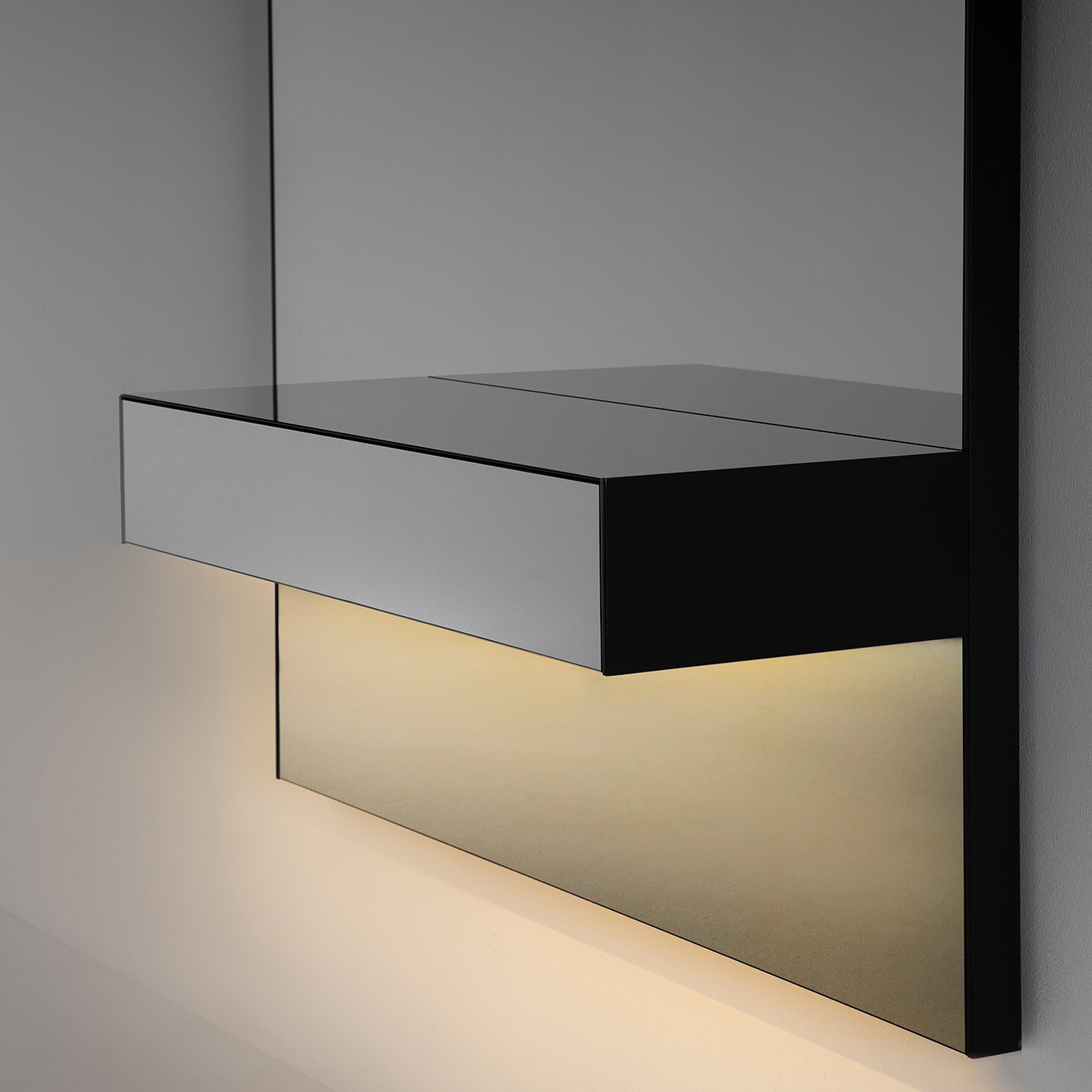 A collection of consoles comprising a back panel with a smoke grey mirror and a drawer in the same material. Optionally, the base of the drawer can be fitted with LED lights for indirect lighting. Available in 2 versions with different back panel sizes and drawer positions.