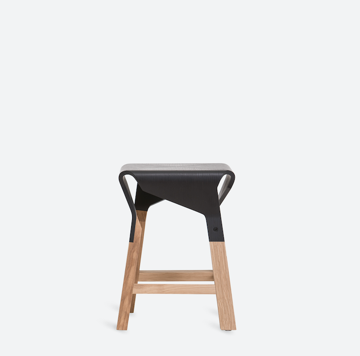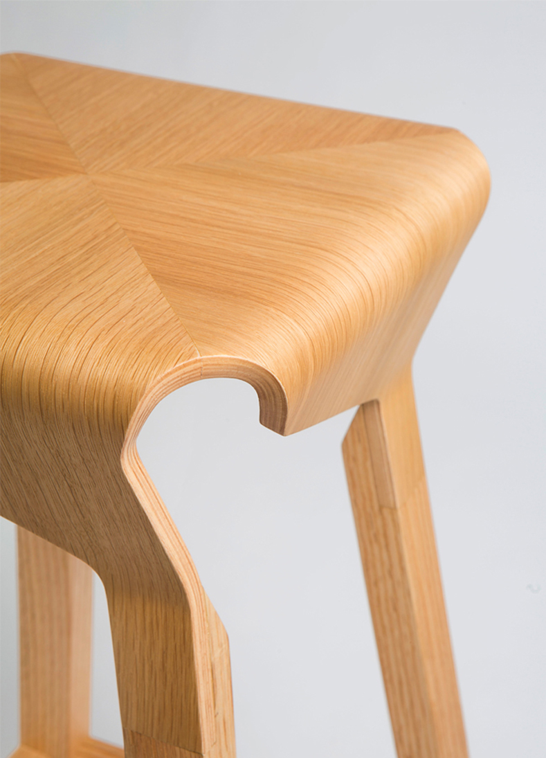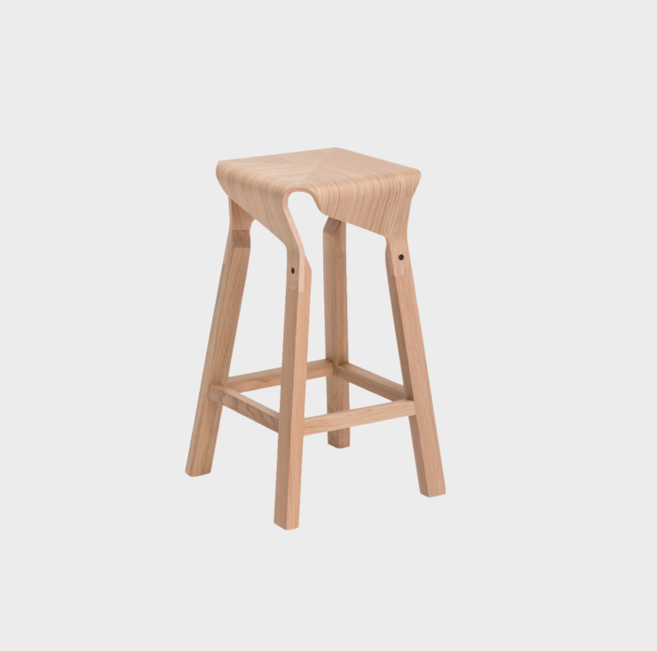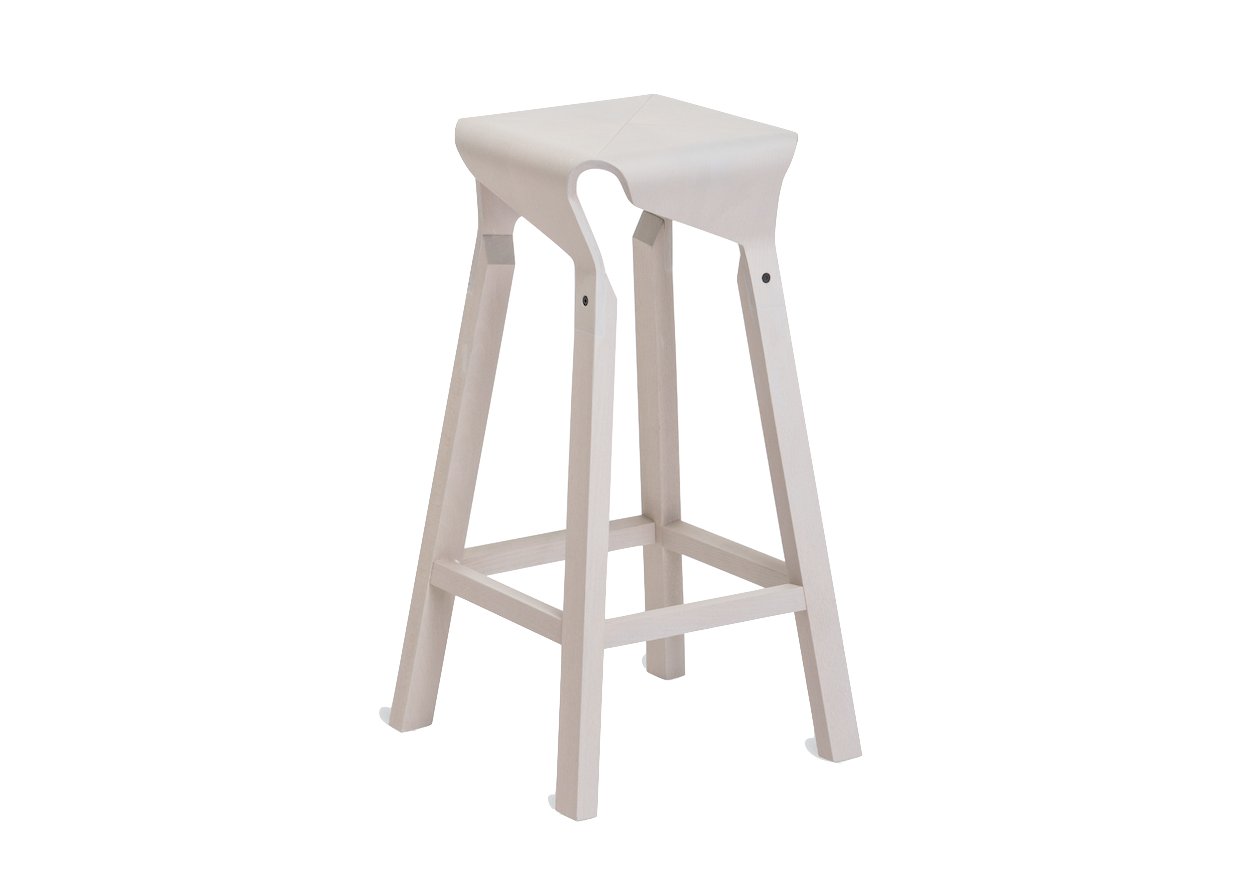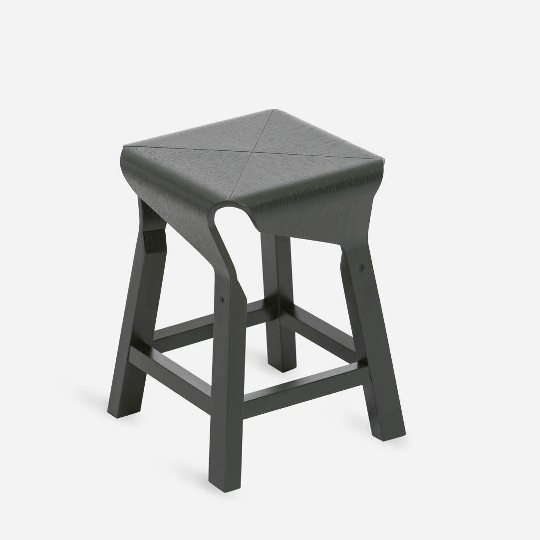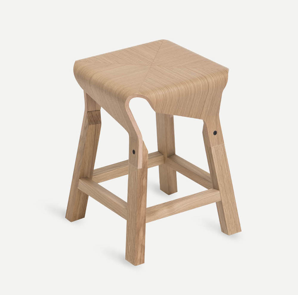 A collection of stools that explores the expressive and structural potential of bent plywood. The Naoshima stool combines four identical pieces to build the seat, the prolongation of which connects with the legs made of solid wood, creating a solid and stable stool.