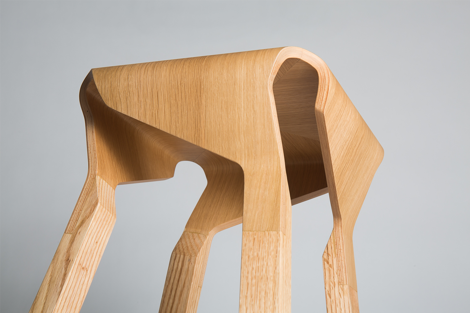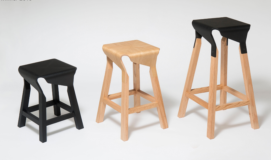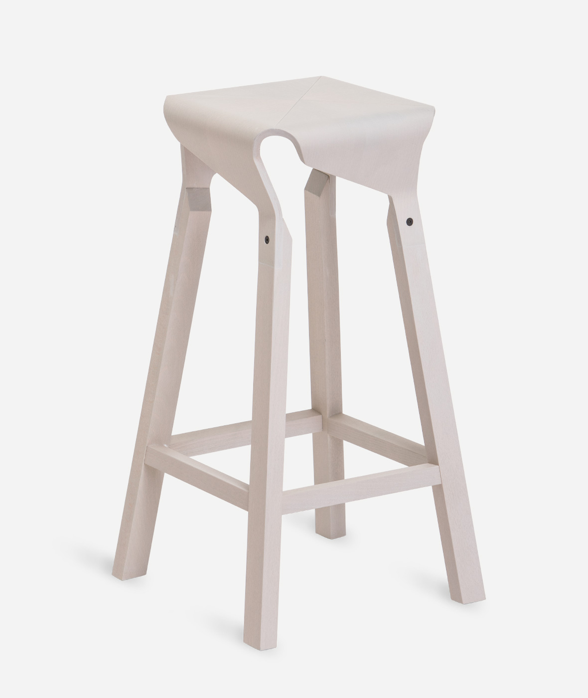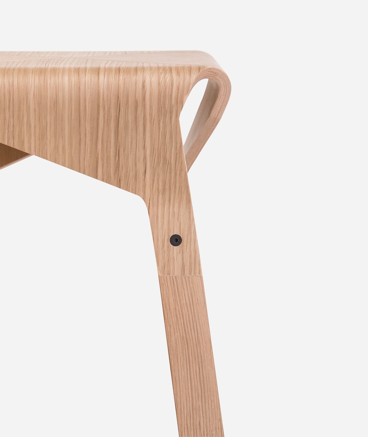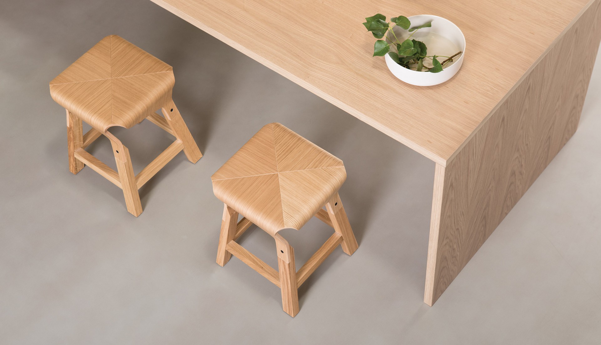 A collection of stools that explores the expressive and structural potential of bent plywood. The Naoshima stool combines four identical pieces to build the seat, the prolongation of which connects with the legs made of solid wood, creating a solid and stable stool.