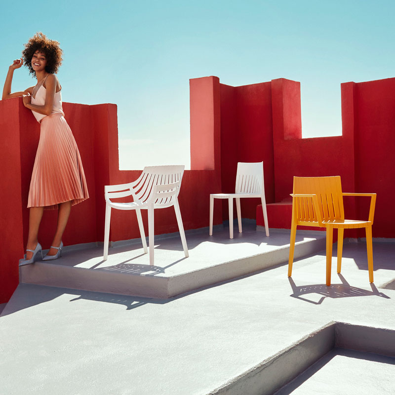 The Spritz Chair, designed by Archirivolto Design for Vondom, brings together clean lines and a fresh, modern aesthetic inspired by the subtle elegance of Mediterranean design. Its slatted backrest and lightweight structure evoke a sense of openness, making it an ideal seating solution for both indoor and outdoor spaces.
