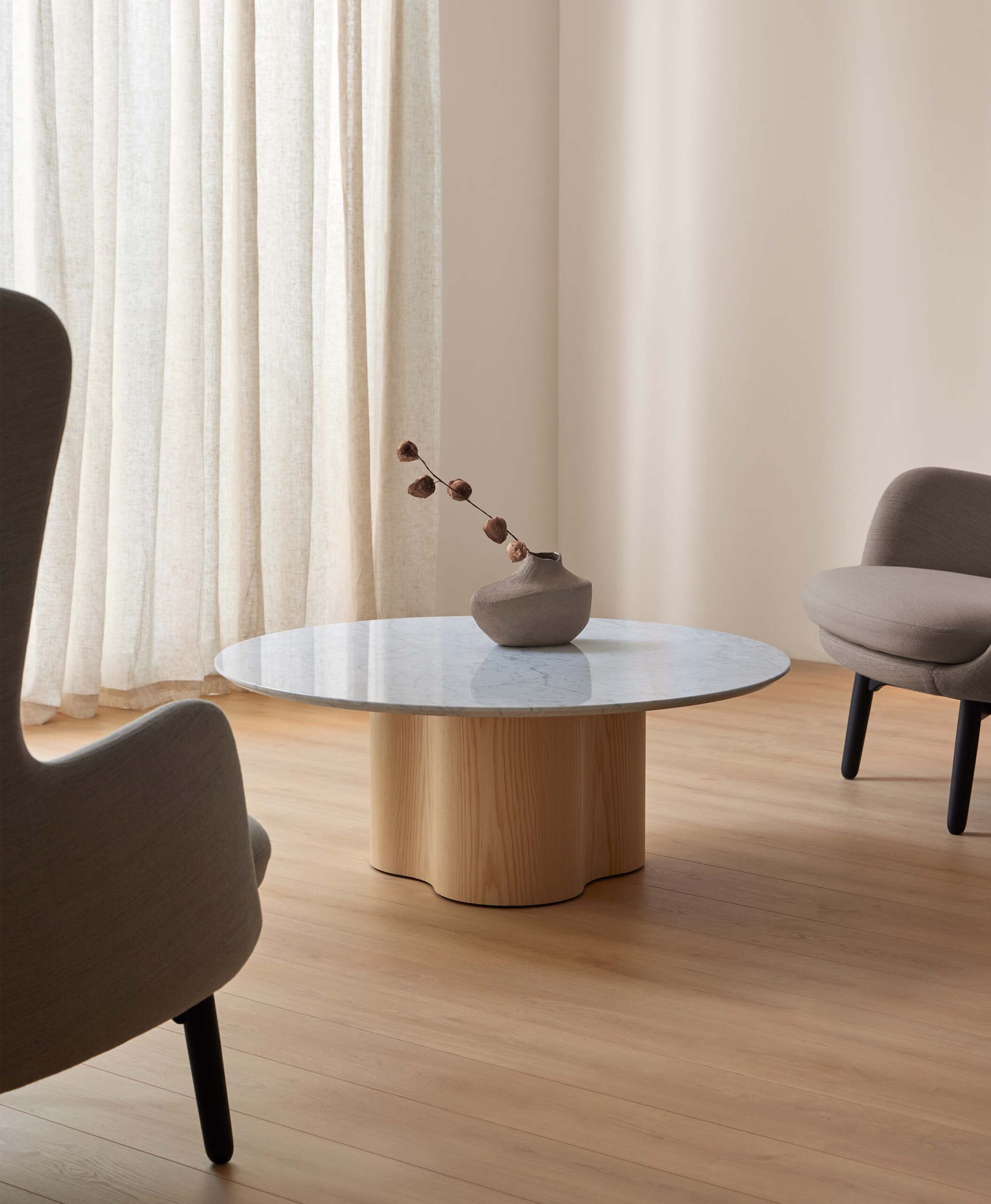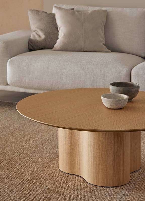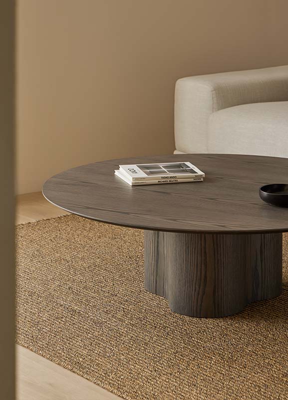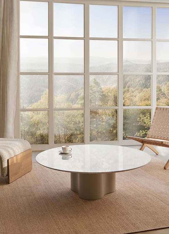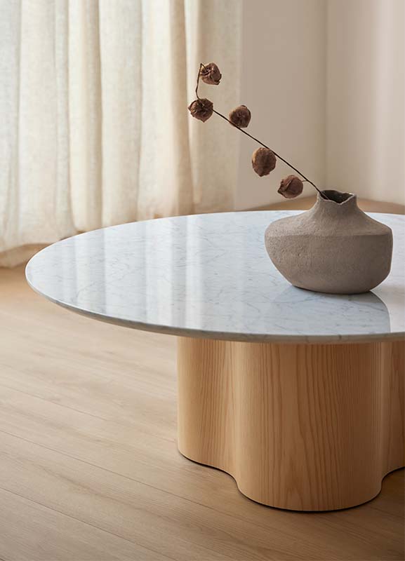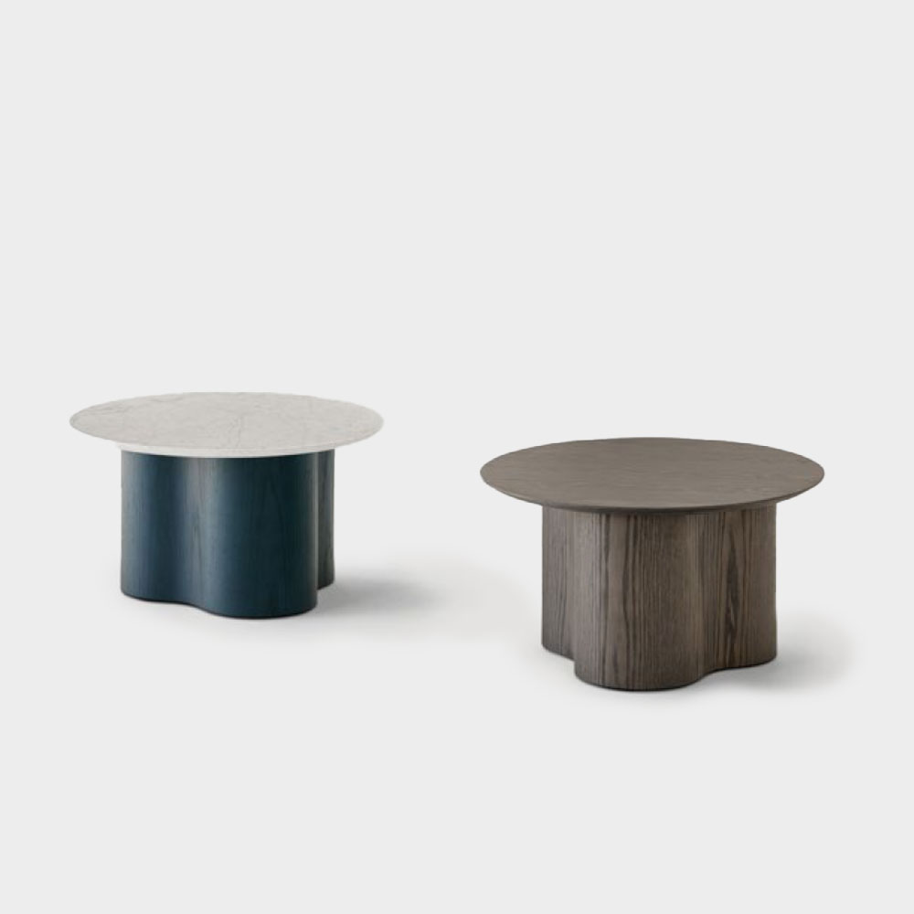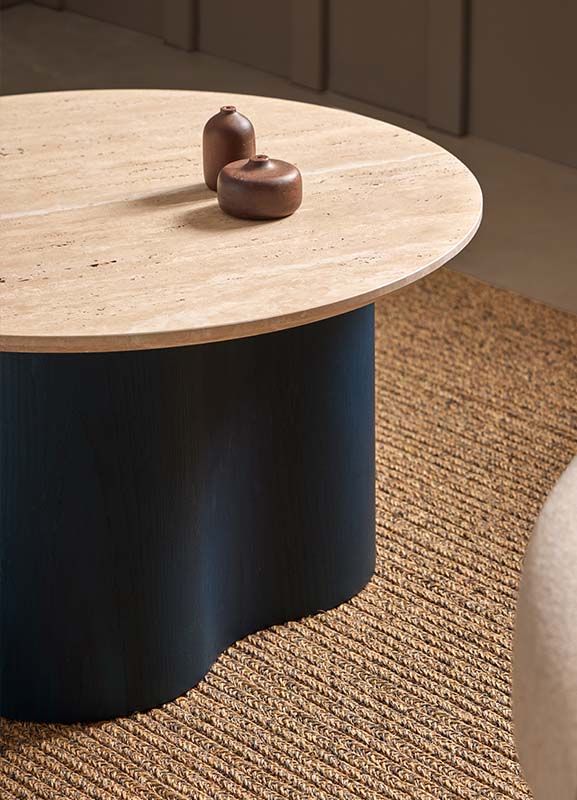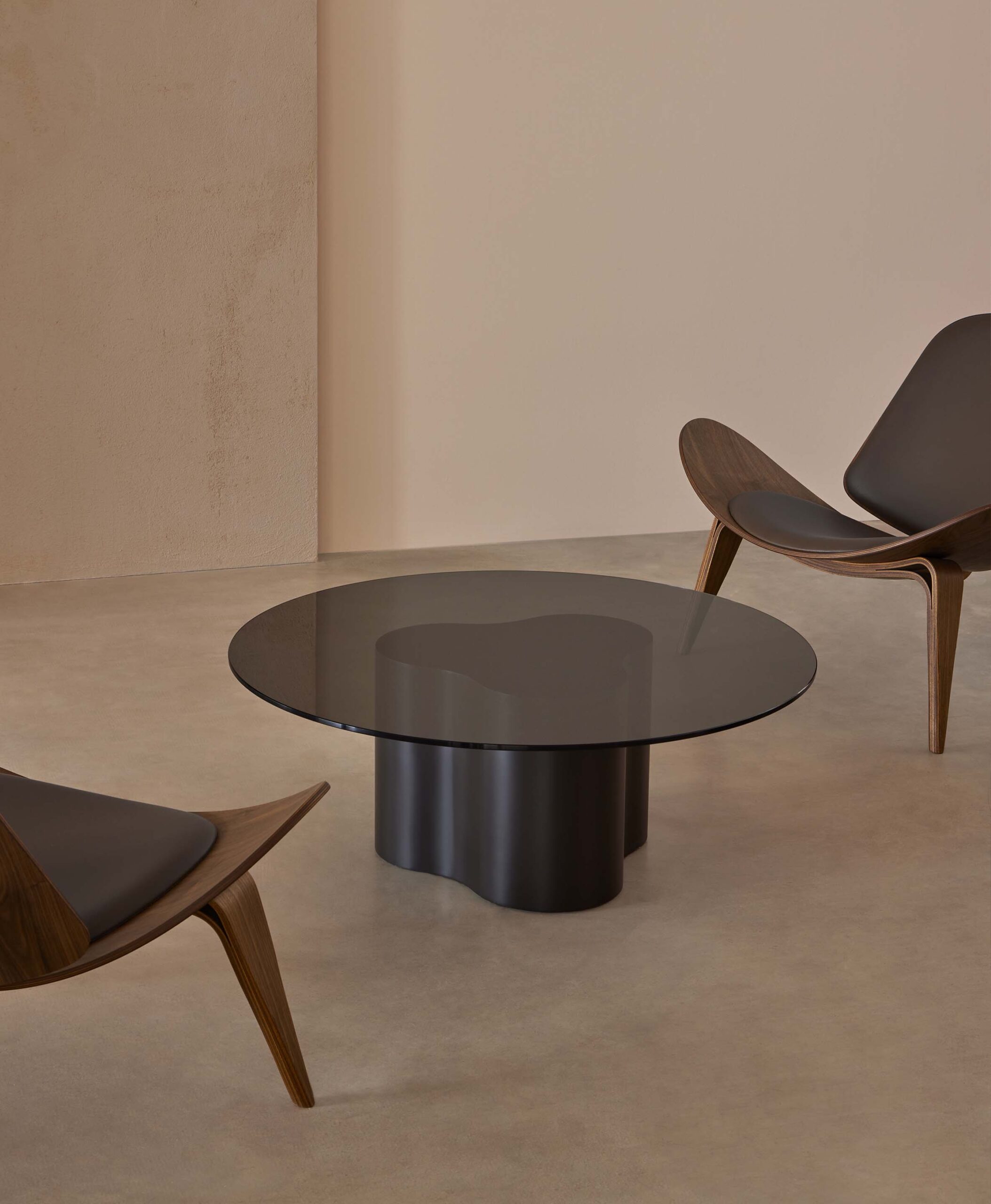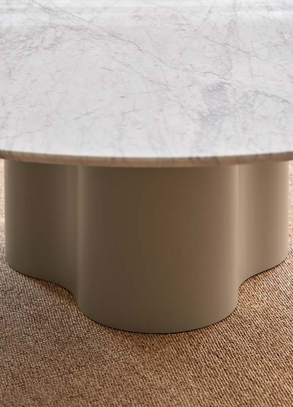 Stella’s design is inspired by the sinuous forms of Chicago’s Lake Point residential tower. This influence is reflected in the table’s base, a blunt, totemic piece in the shape of a softened star. The base is topped with a circular top to serve as a coffee table, achieving a geometric balance between the organicity of the foot and the purity of the circle.