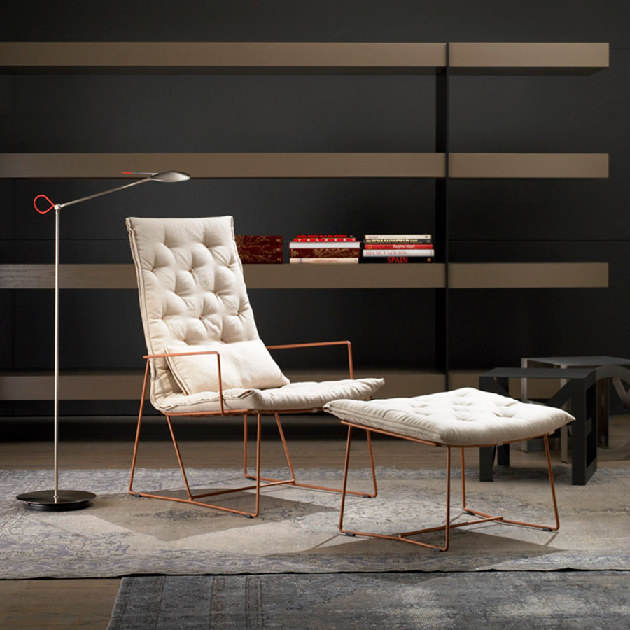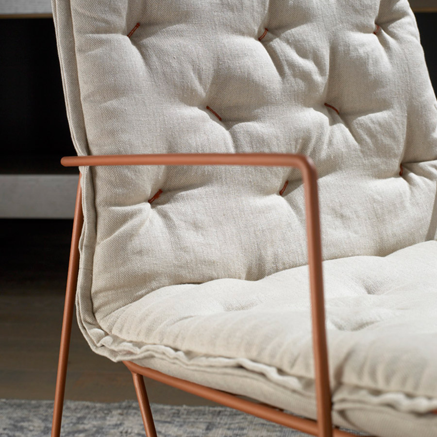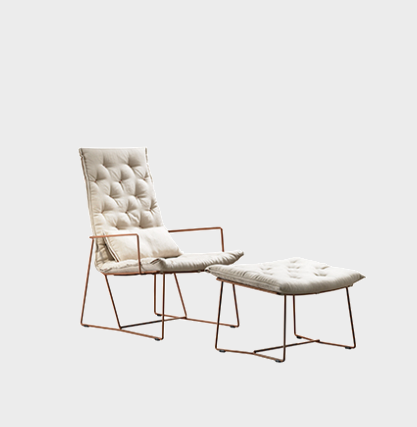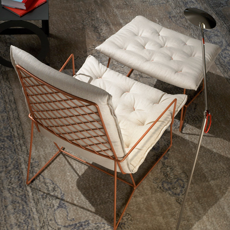 The Syrma Armchair, designed by Giancarlo Vegni and Gianfranco Gualtierotti for Casadesús, is a visually striking piece that combines lightness with intricate design. Crafted from a mesh of intertwined wires and surrounded by a sleek metal rod, it exudes an airy elegance. The armchair ensures comfort with a capitoné pad, fixed securely to the mesh. Available in three colours—copper, white, and dark grey—the pad features button tufting and a side zipper that matches the structure’s colour. The Syrma collection also includes a chair, high-backed armchair, footstool, and pouf, offering versatile options for various spaces.
