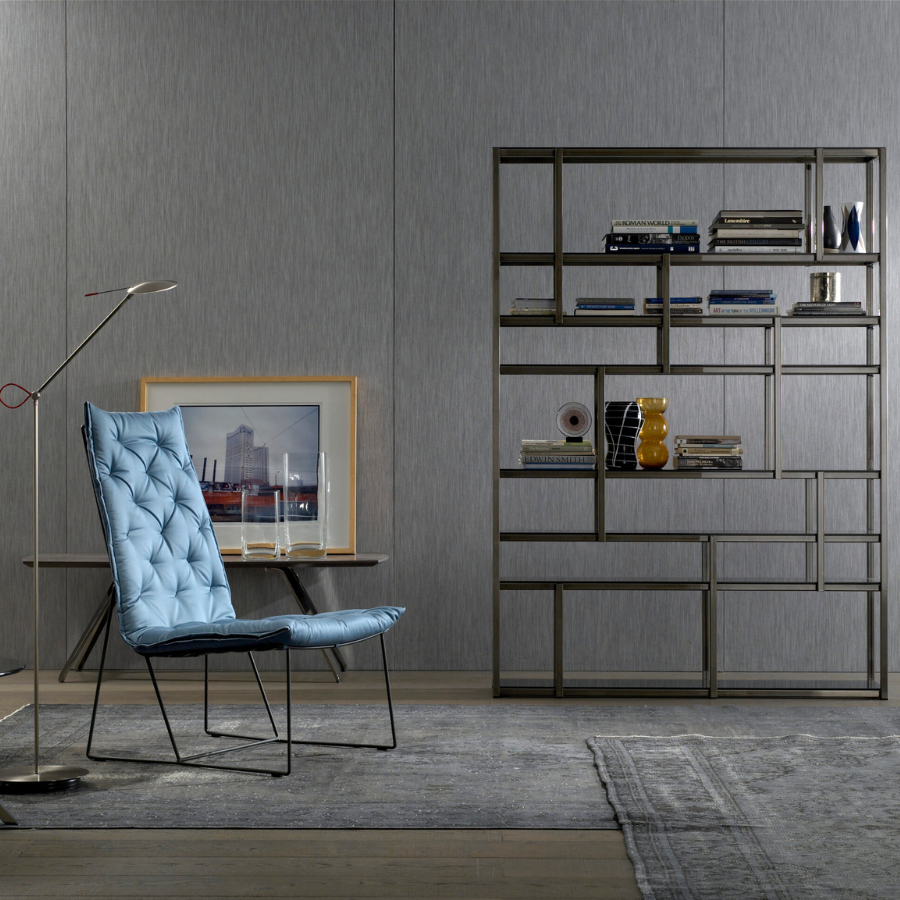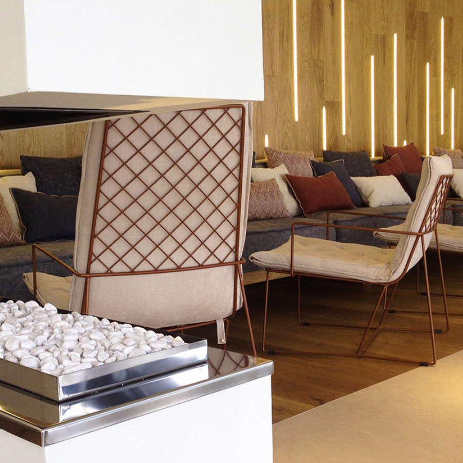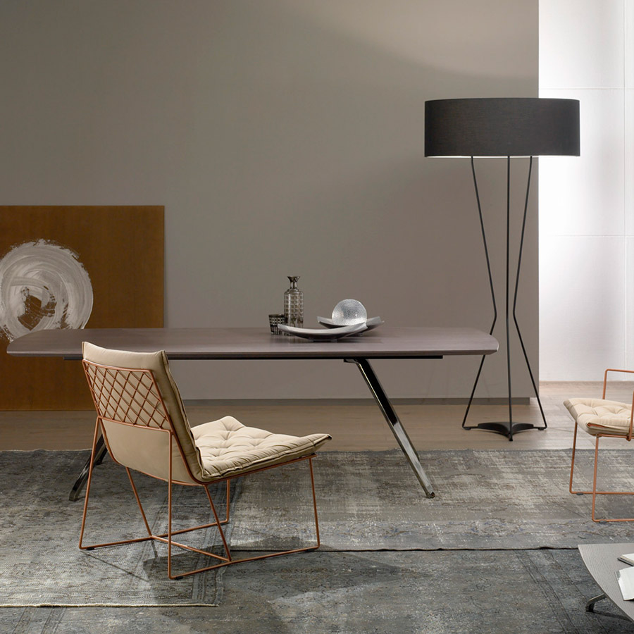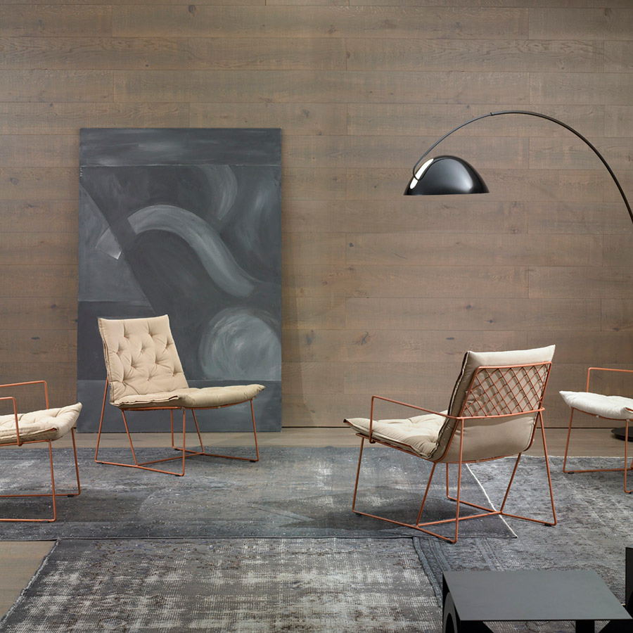 The Syrma Armchair, designed by Giancarlo Vegni and Gianfranco Gualtierotti for Casadesús, is a visually striking piece that combines lightness with intricate design. Crafted from a mesh of intertwined wires and surrounded by a sleek metal rod, it exudes an airy elegance. The armchair ensures comfort with a capitoné pad, fixed securely to the mesh. Available in three colours—copper, white, and dark grey—the pad features button tufting and a side zipper that matches the structure’s colour. The Syrma collection also includes a chair, high-backed armchair, footstool, and pouf, offering versatile options for various spaces.