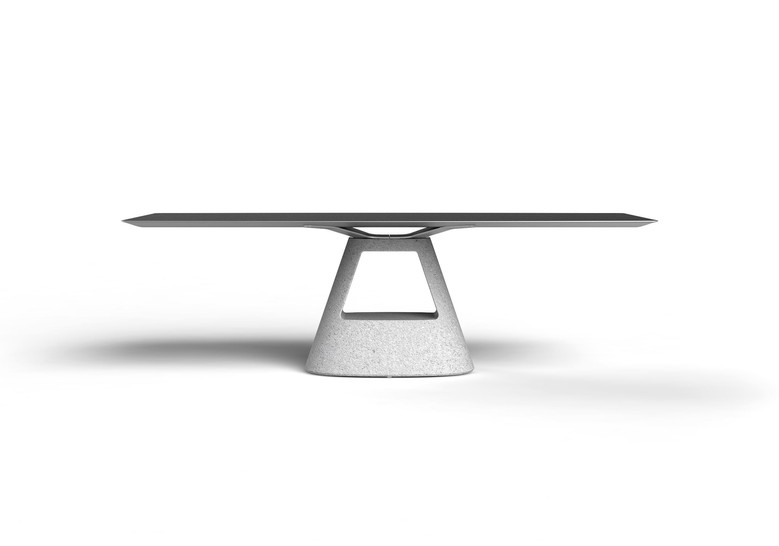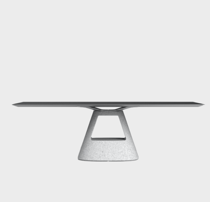 Tabletop in extruded aluminium with open ends cut at 45º. Grey architectural concrete base. For tabletop of 2400mm, comes with one leg. For tabletops of 3600, 4000 and 5000cm, two legs are needed.