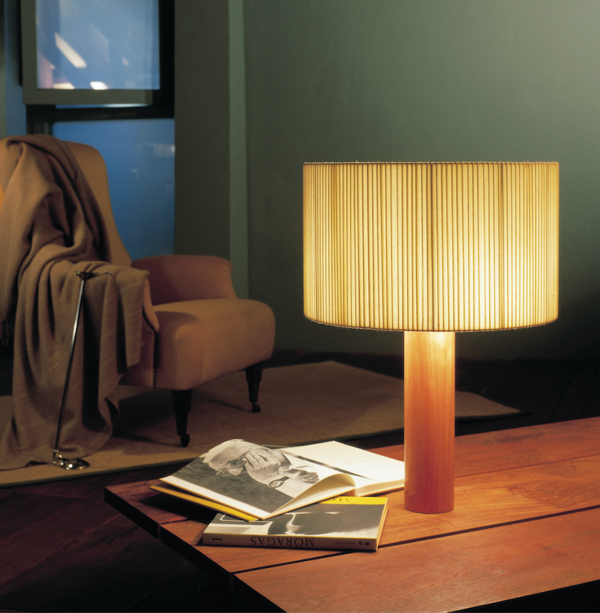 This is a table lamp with a serene exterior, the beacon of a modernity that captures the pragmatic temperament of a great Spanish pioneer. A central solid wooden column supports a generous circular shade made of bookbinding tape, whose asymmetry produces relaxing chiaroscuros. Lampshade natural cotton ribbon with silk border.Wooden leg in sapeli or oak timber.