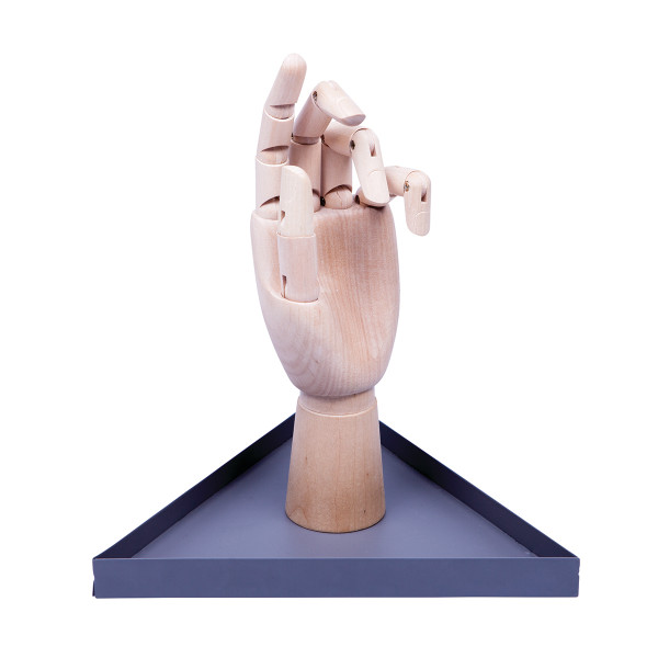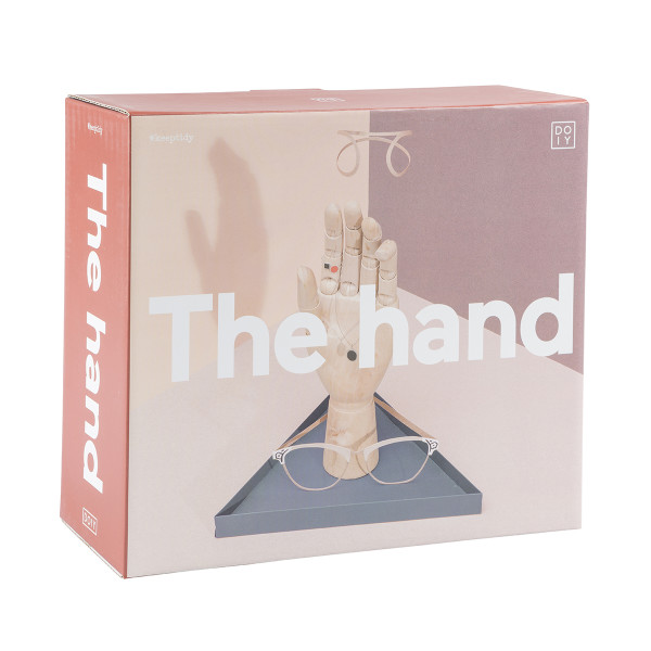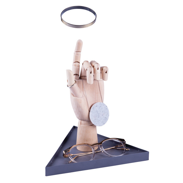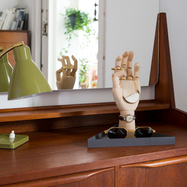 Keep your valuables close at hand with The Hand from DOIY. The posable wooden hand sits on a metal triangle tray – perfect for storing jewellery, glasses and all your odds and ends.