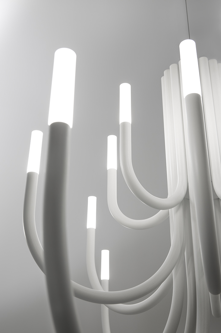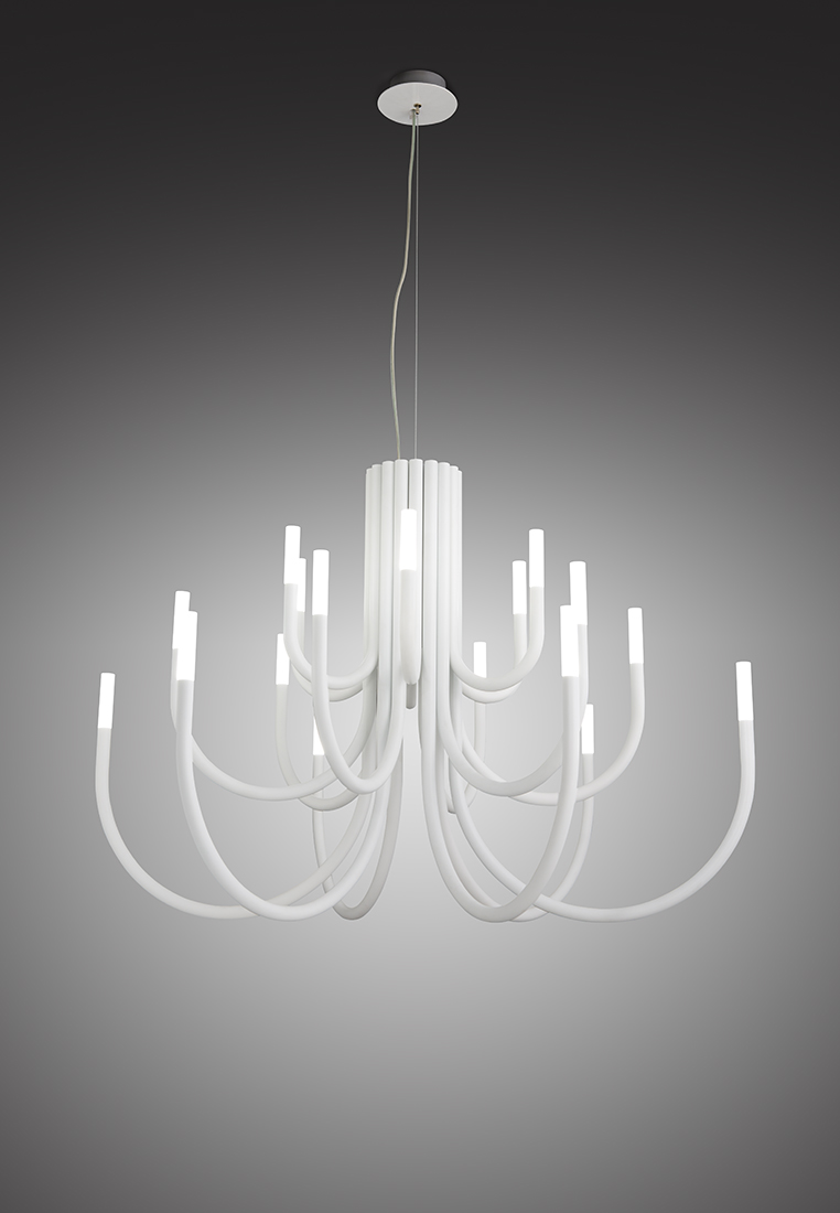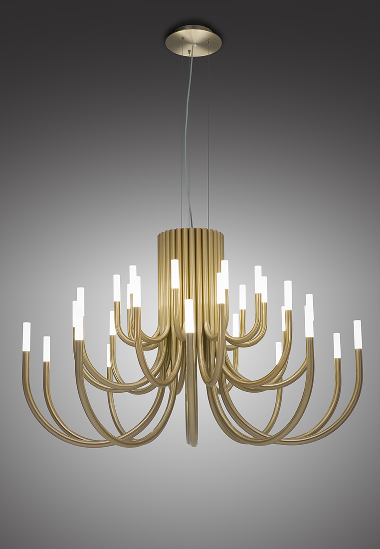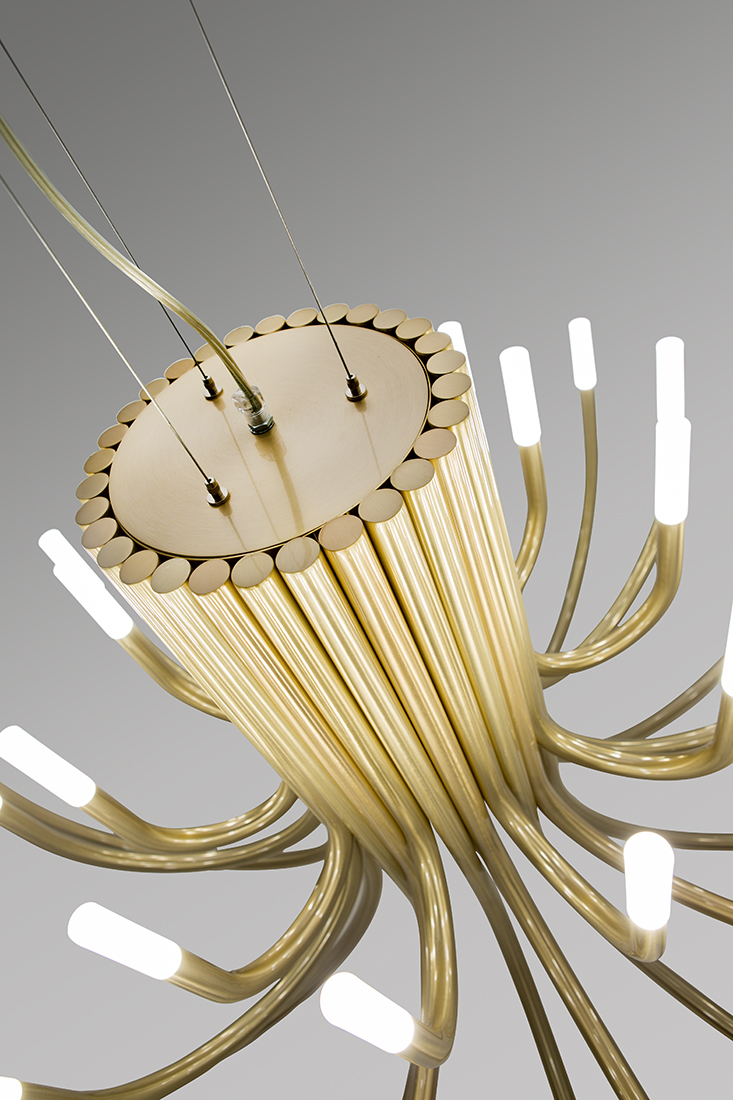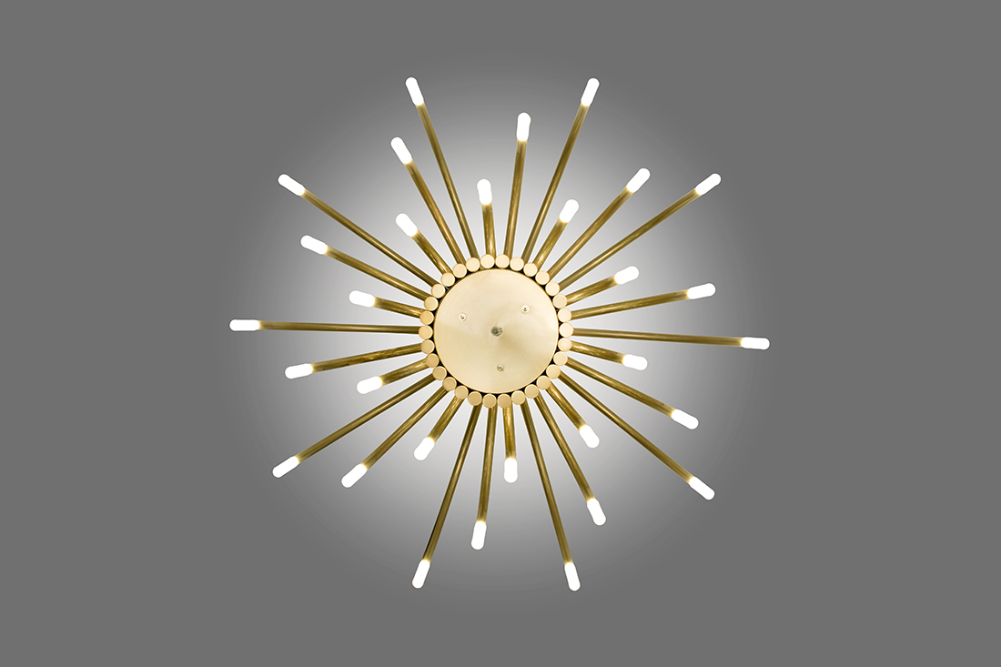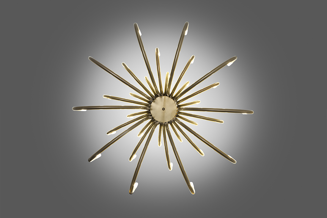 Structure made of iron with metallic finishes in either gold, nickel, painted white or black. At the end of each arm there is a LED Cree 3W 2700K 248lm, which illuminates a diffuser of sandblasted solid methacrylate.