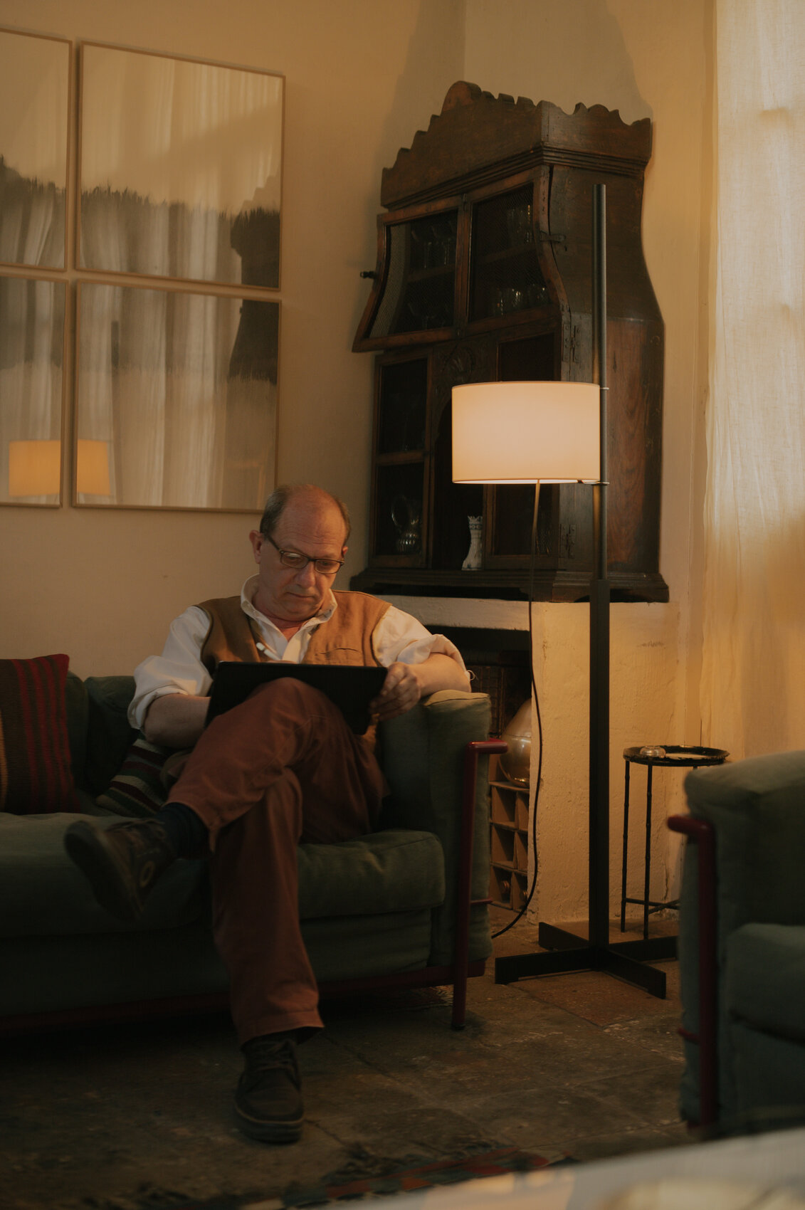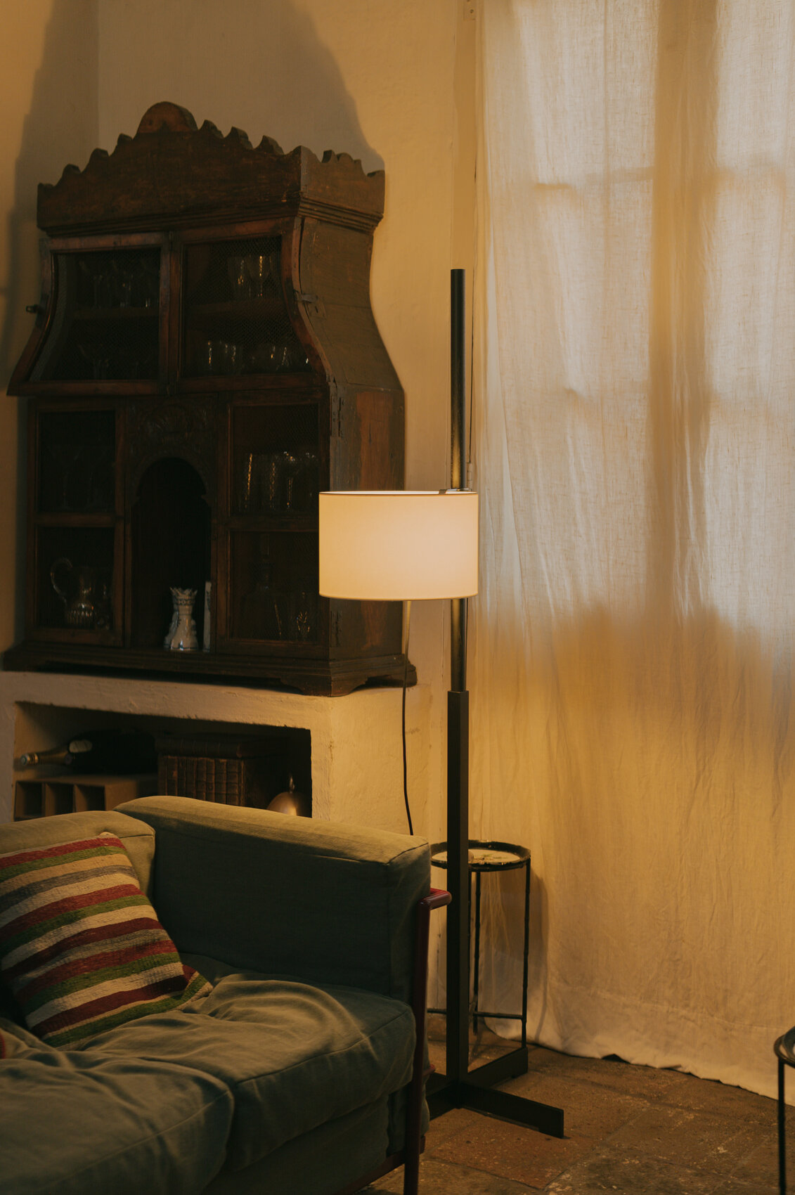 A base in the form of a cross supports the square shaft and the drum-shaped height adjustable shade. It moves over a vertical axis, which hides the light source, the glow in the centre which projects the light downward for reading or working or upwards for general effect. The height of the shade can be adjusted by means of a rubber slide. The lampshade is delivered with cable, bulb socket and fastening system to the structure. The light is switched on/off by pulling lightly on the cable.