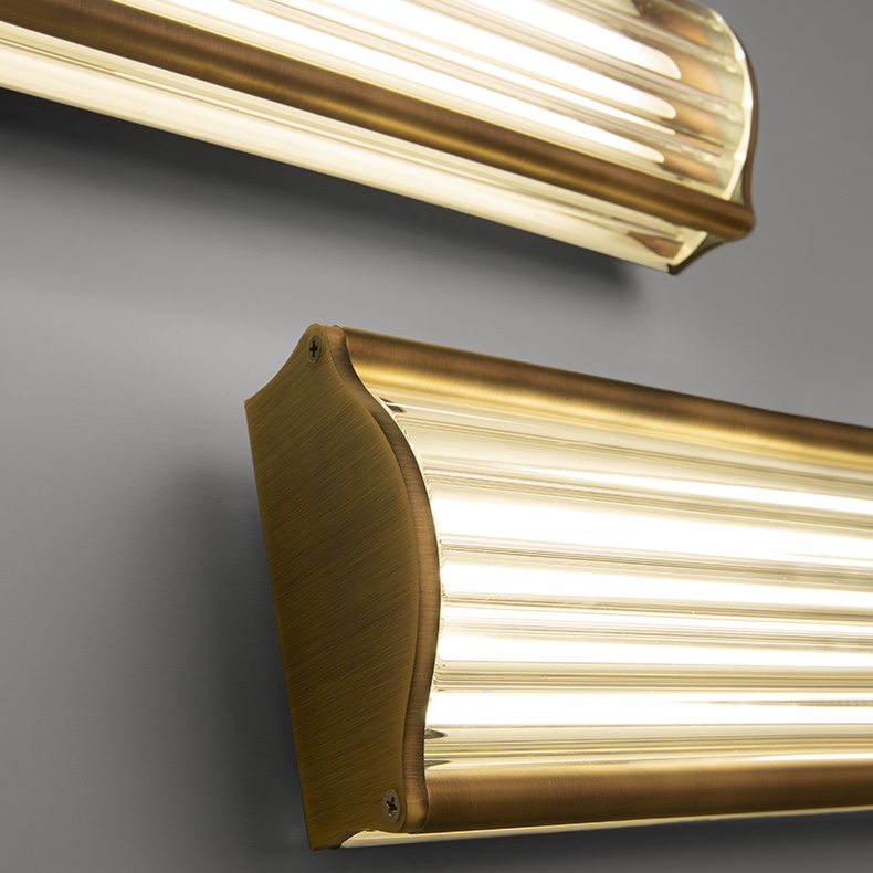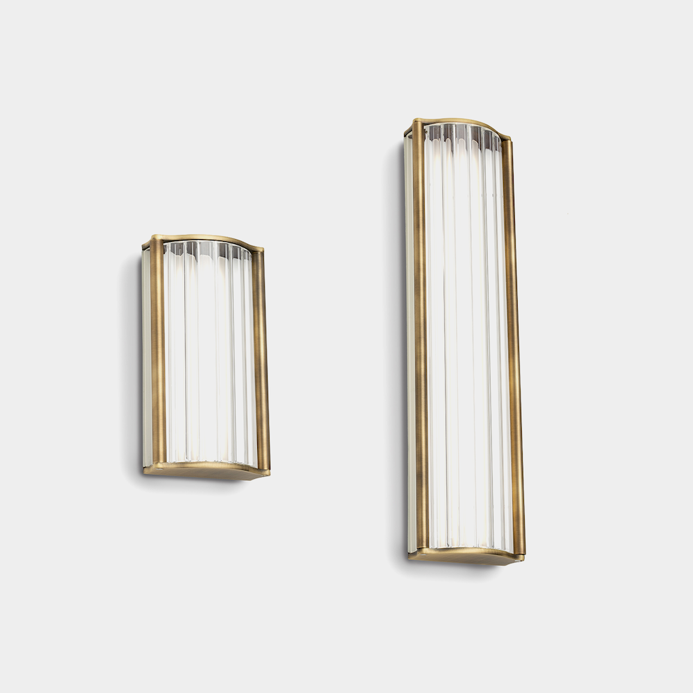 Shade: transparent fluted borosilicate glass, inside which is housed a Led strip with an opal diffuser to avoid glare. The Led strip included in the small wall light is 10W 1150lm 2700K >80CRI, and the one in the large wall light is 20W 2300lm 2700K >80CRI.