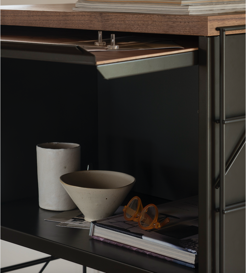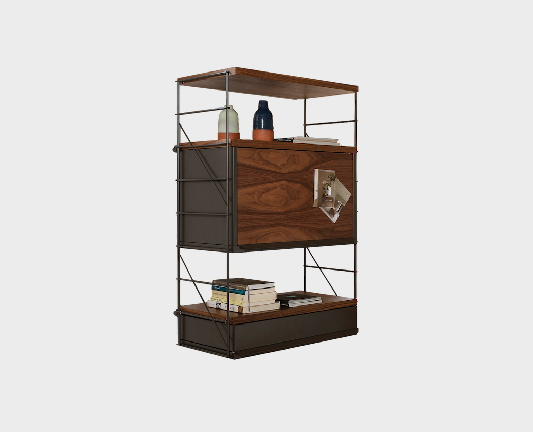 Wall hanging shelving unit. Finishes and modules as per main picture: Grey metal structure, drawer and cabinet body, walnut shelves and cabinet door front. Three 600w shelves, one flip-up door cabinet 600w x 375h, one drawer 600w x 120h.